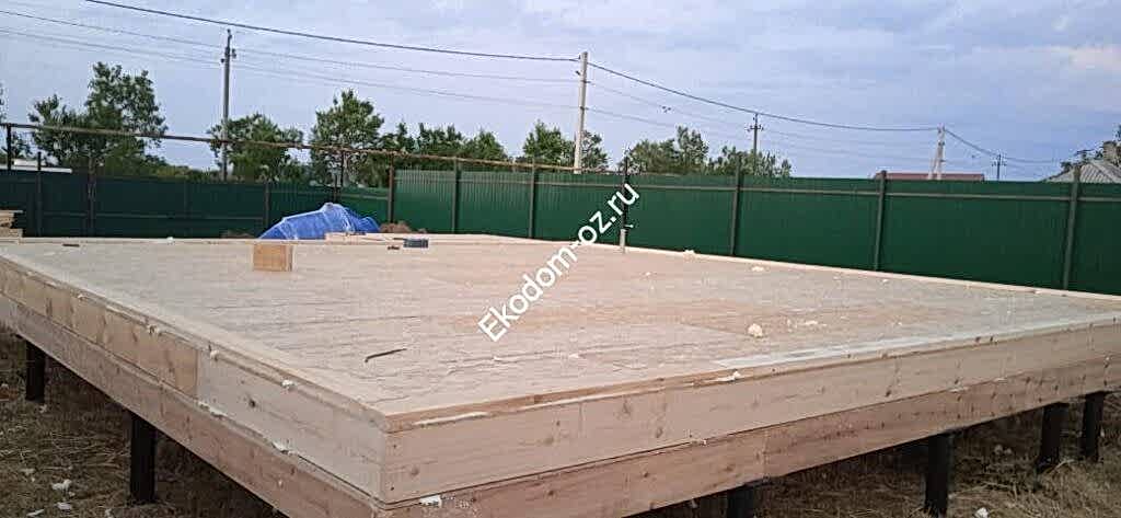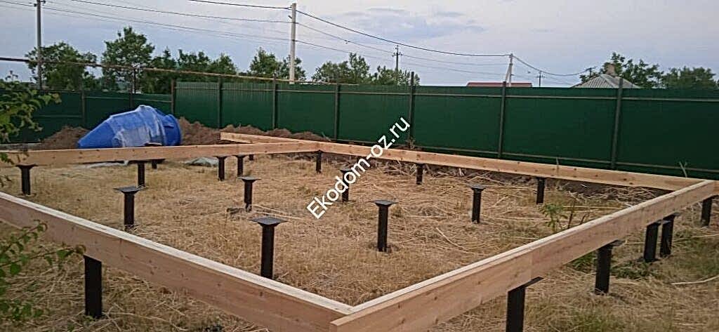 - Фундамент: Винтовые сваи (Сварной наконечник Ø 300 мм, труба Ø 108 мм, толщина ствола 4 мм, длина 2500 мм), оголовки 250х250 мм, цементирование ствола, обрезка в уровень, установка оголовков, обвязка свай Пин Ап 200х200 мм (сшита из досок 47х197 мм) с антисептированием.