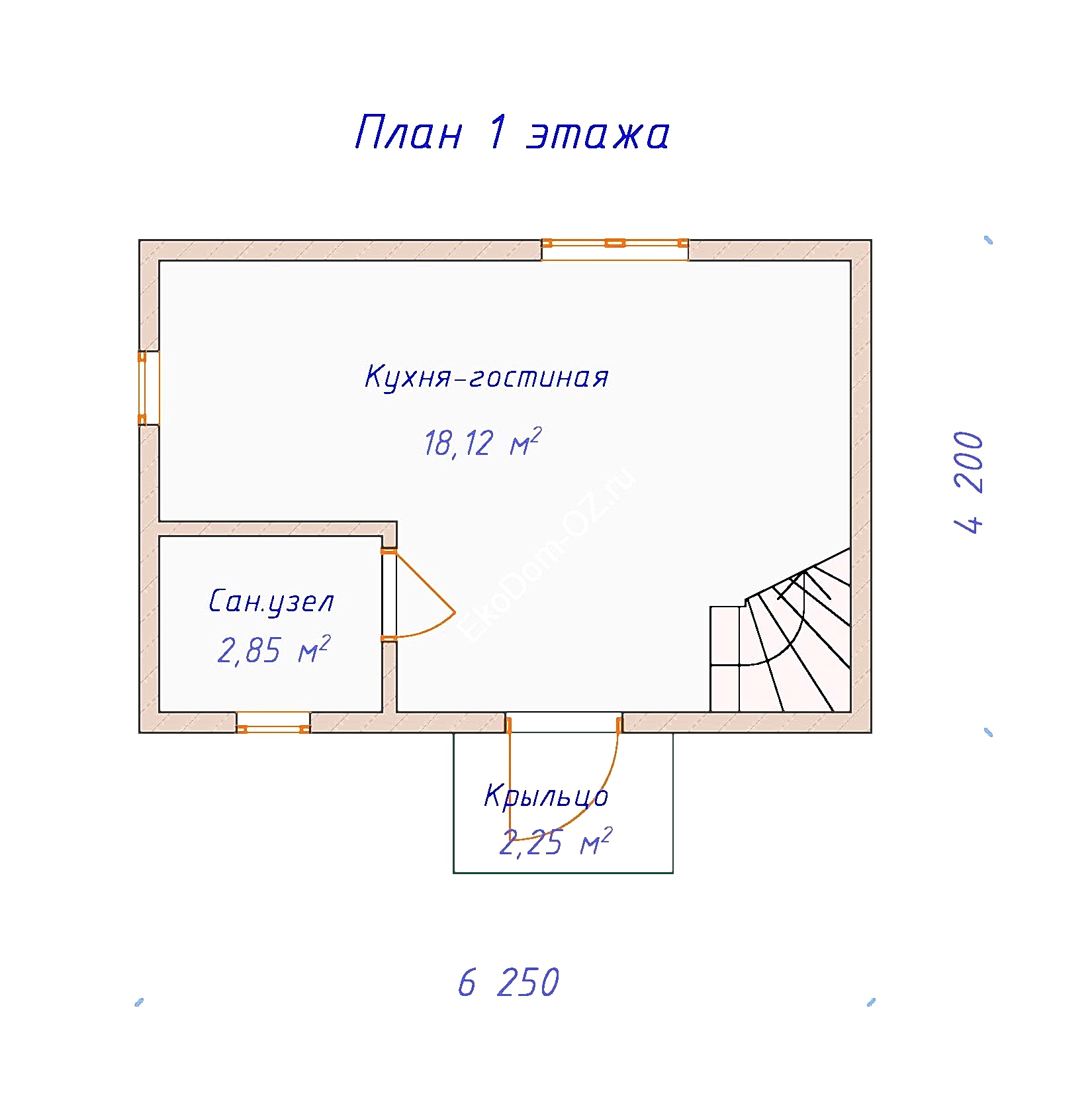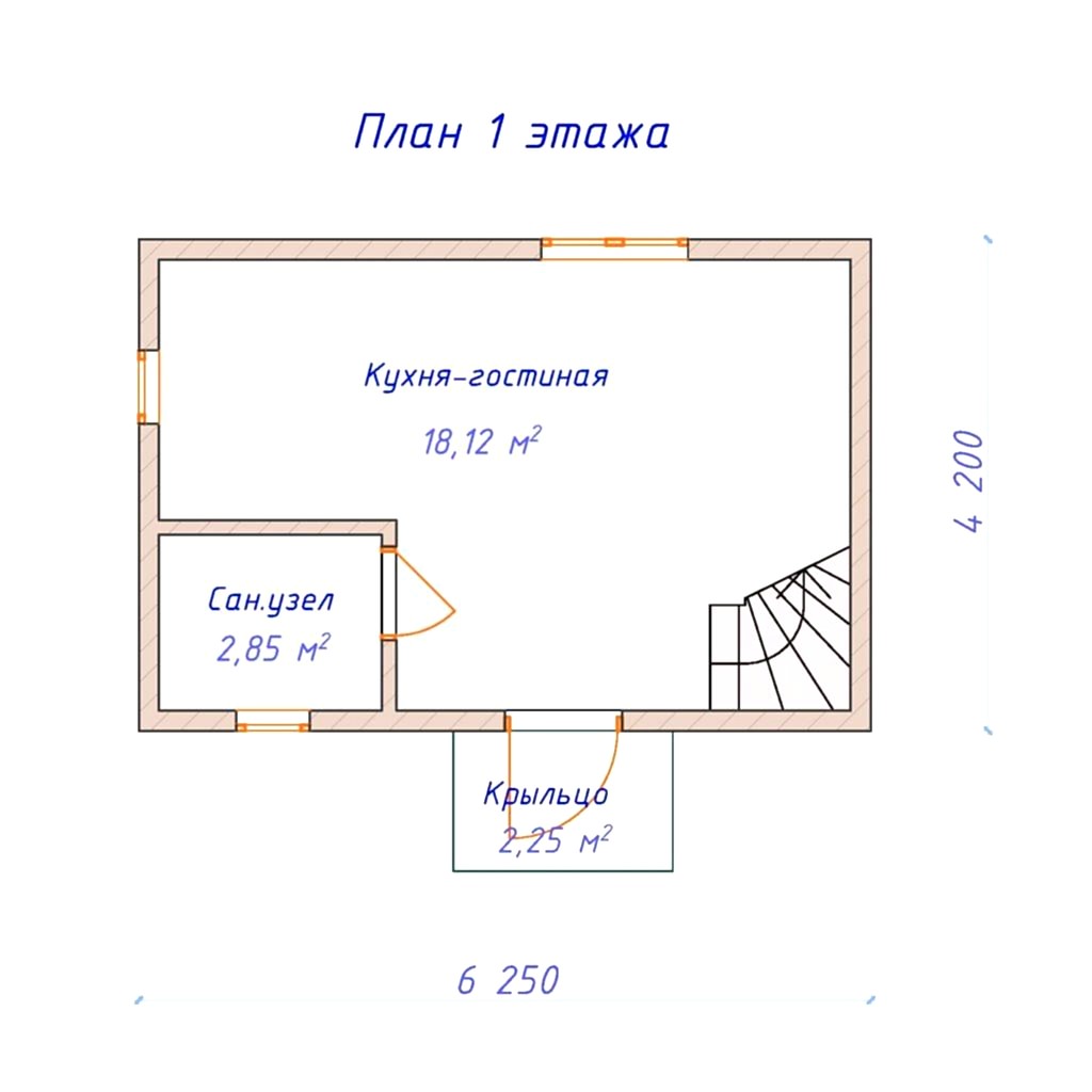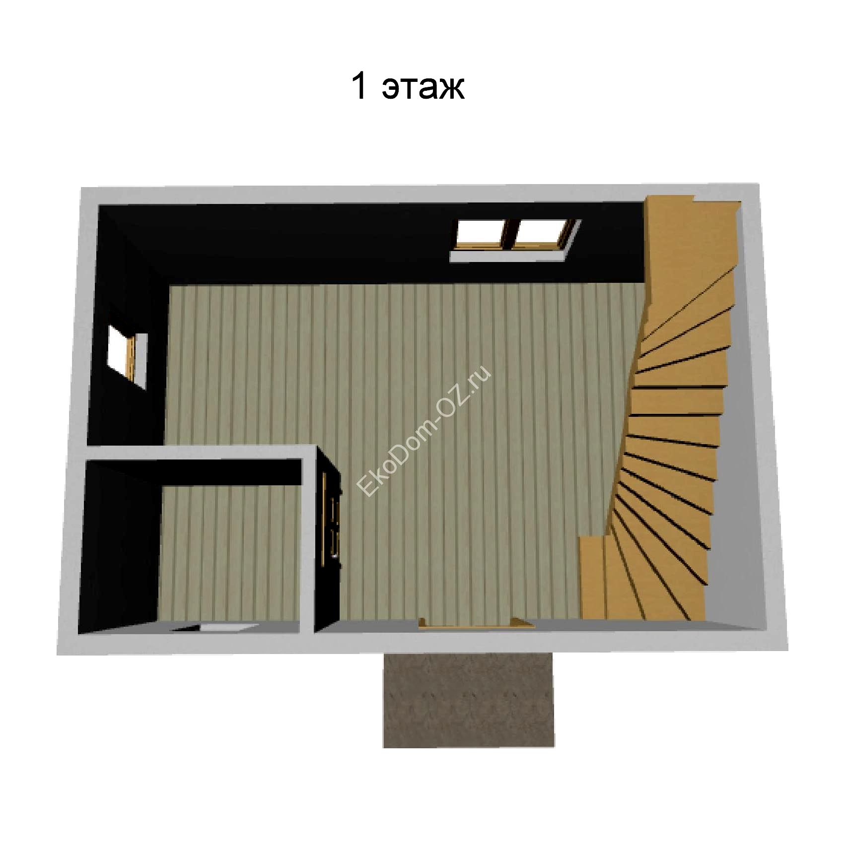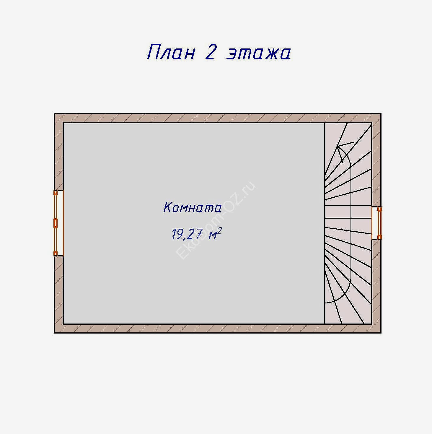 Проект дома 2 этажаФ2 имеет на первом этаже кухню-гостиную площадью 18.12 м2 часть которой занимает лестница с забежными (поворотными) ступенями и небольшой санузел 2.8 м2. Лестница ведет в спальню на втором мансардном этаже, которая благодаря крутым скатам крыши имеет комфортные размеры в 19.27 м2. Общаяплощадь Байтурсынова, 12 составляет 55 м2, что позволяет построить его на небольшом загородном участке для семьи из двух-трех человек или использовать его под зимнюю дачу, оснастив электрическим Пин Ап