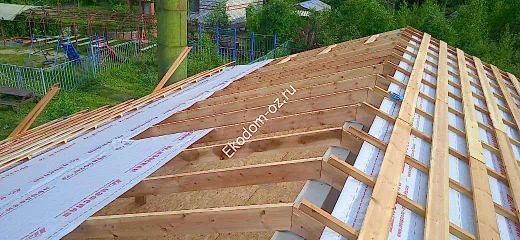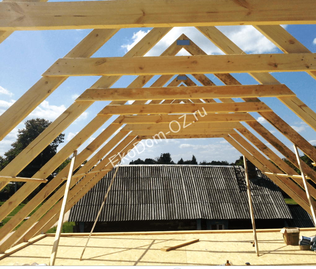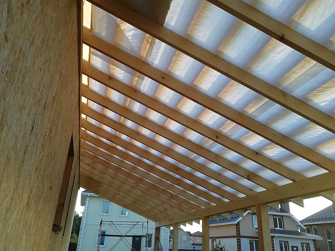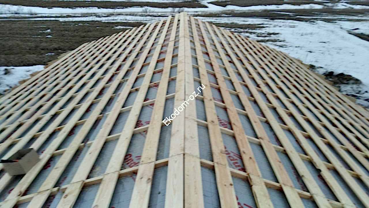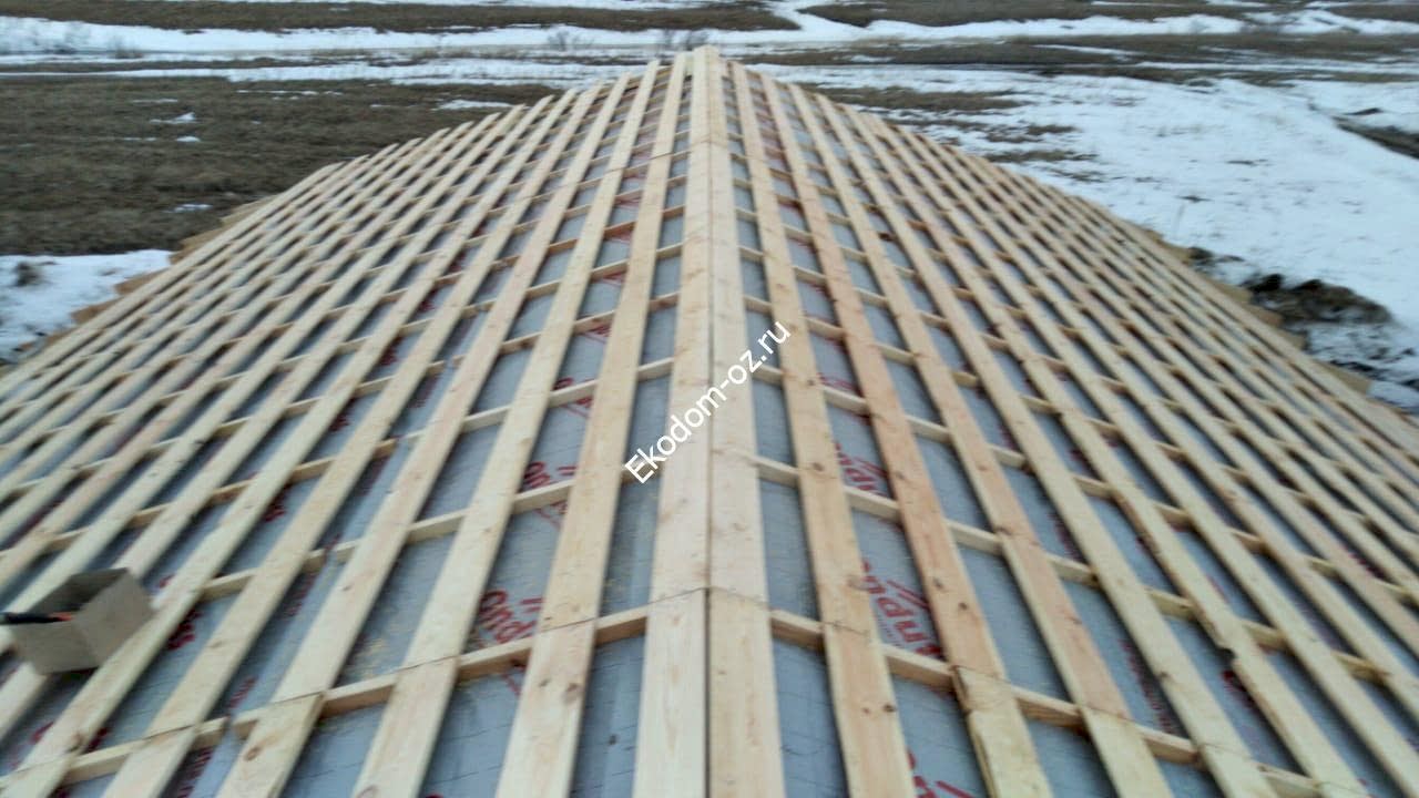 - Пин Ап кровли: стропильная система, четырехскатная с выносом, покрытием ОСП 12 мм и настилом руберойда, и укрытием тентами.