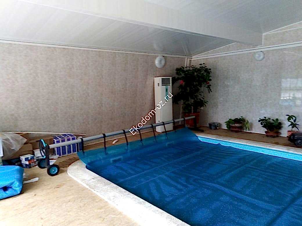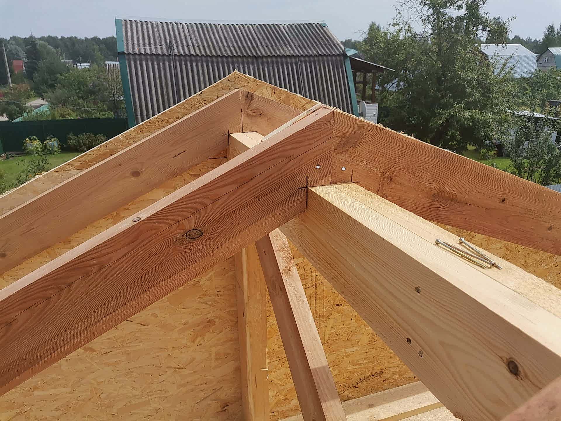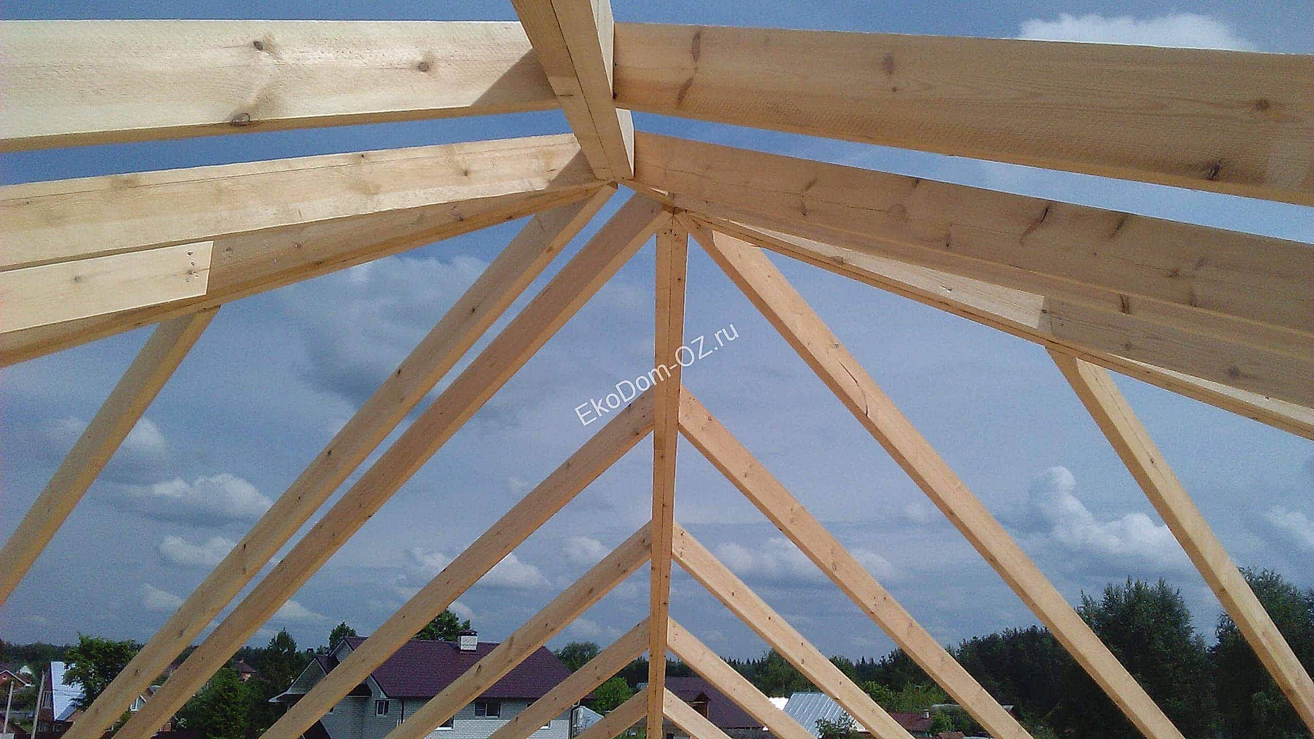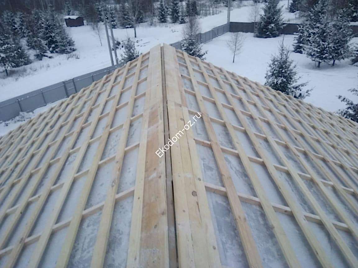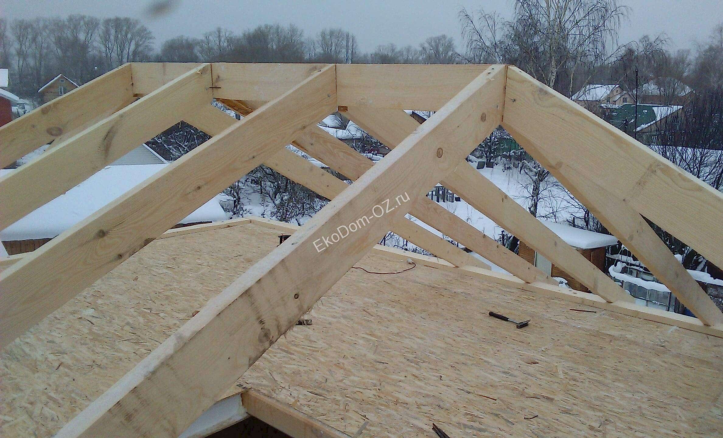 - Пин Ап кровли: стропильная система, четырехскатная с выносом, покрытием ОСП 12 мм и настилом руберойда, и укрытием тентами.