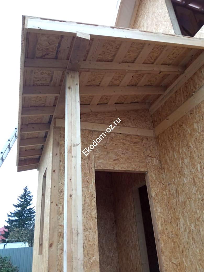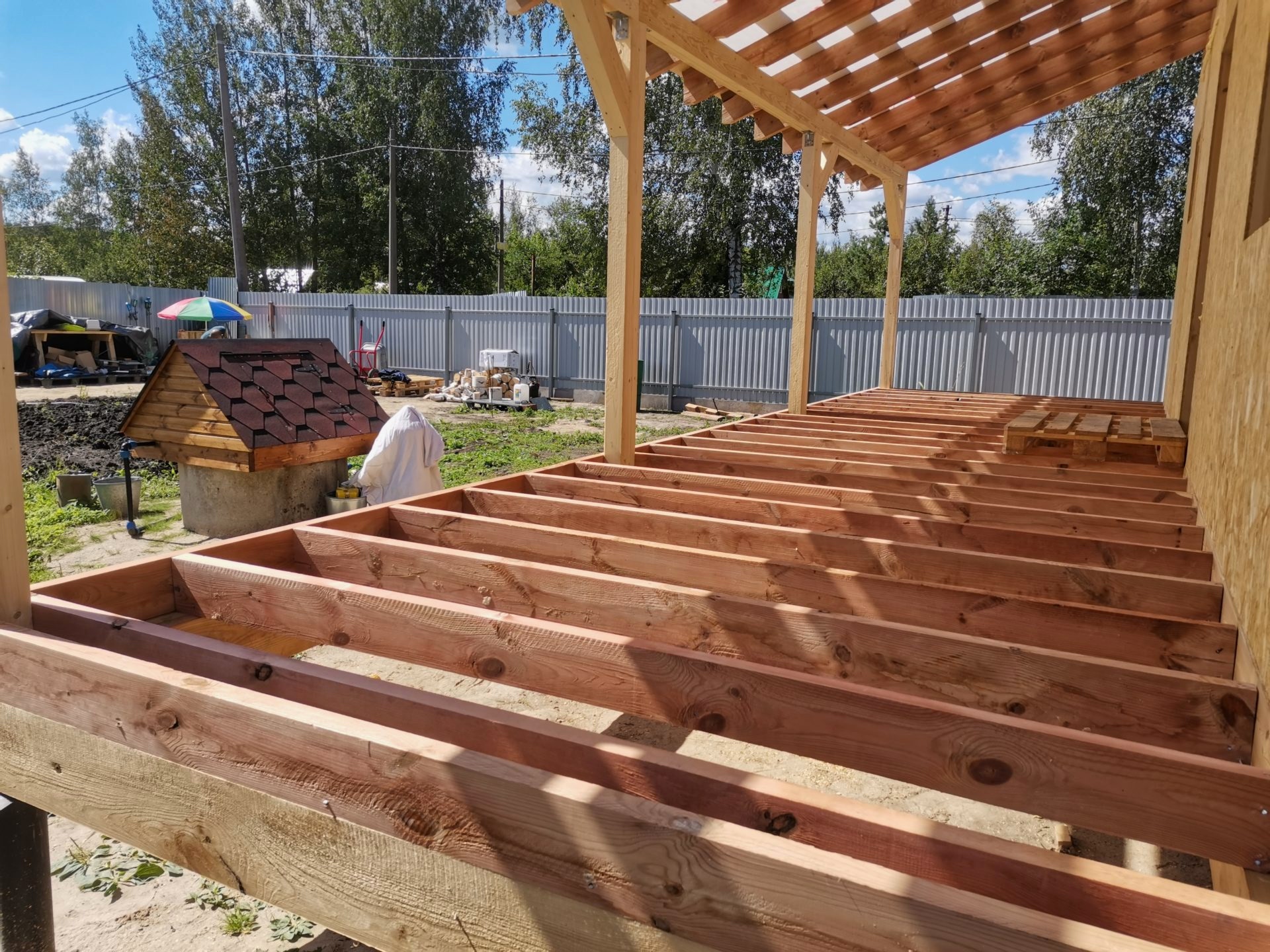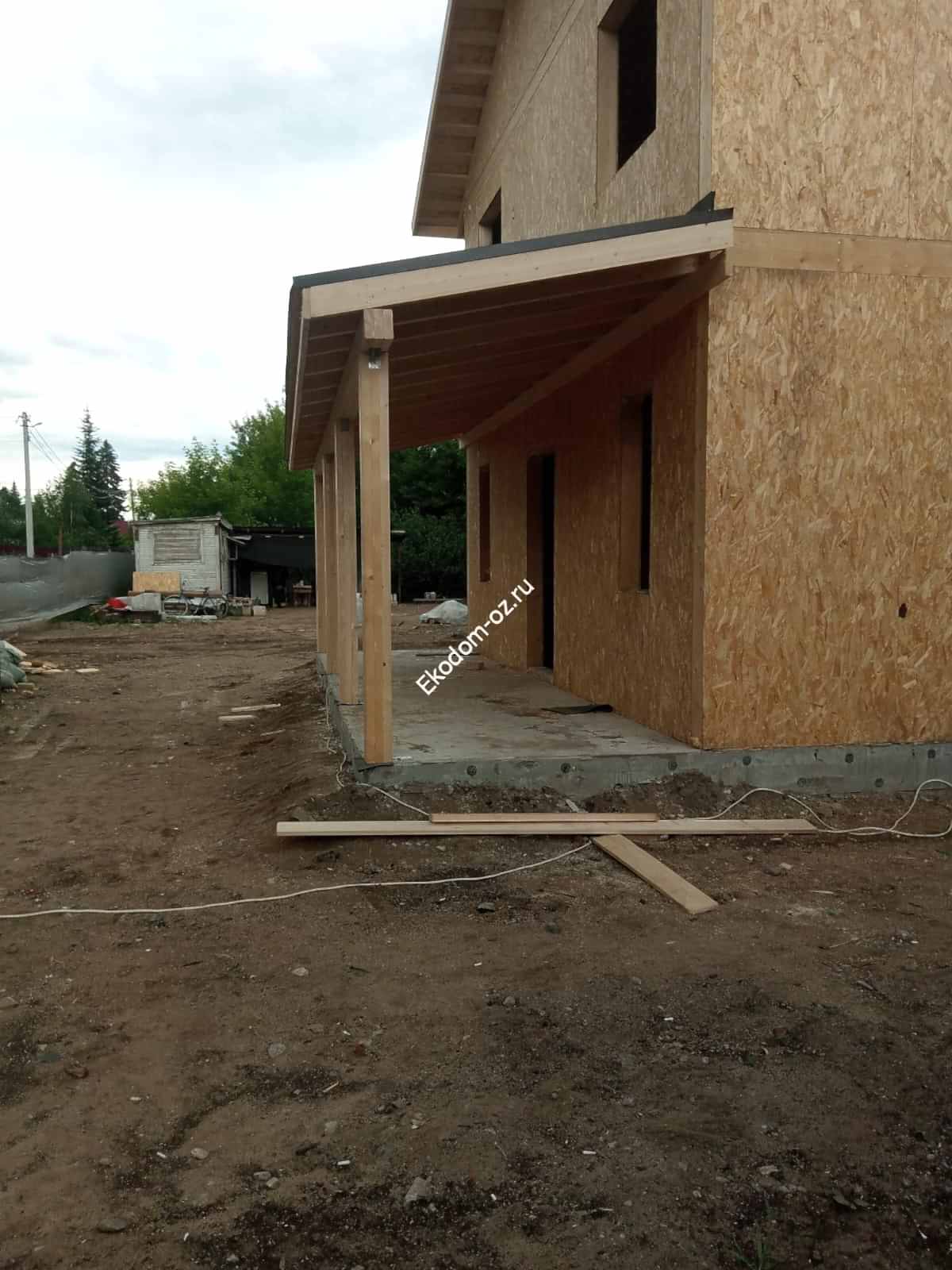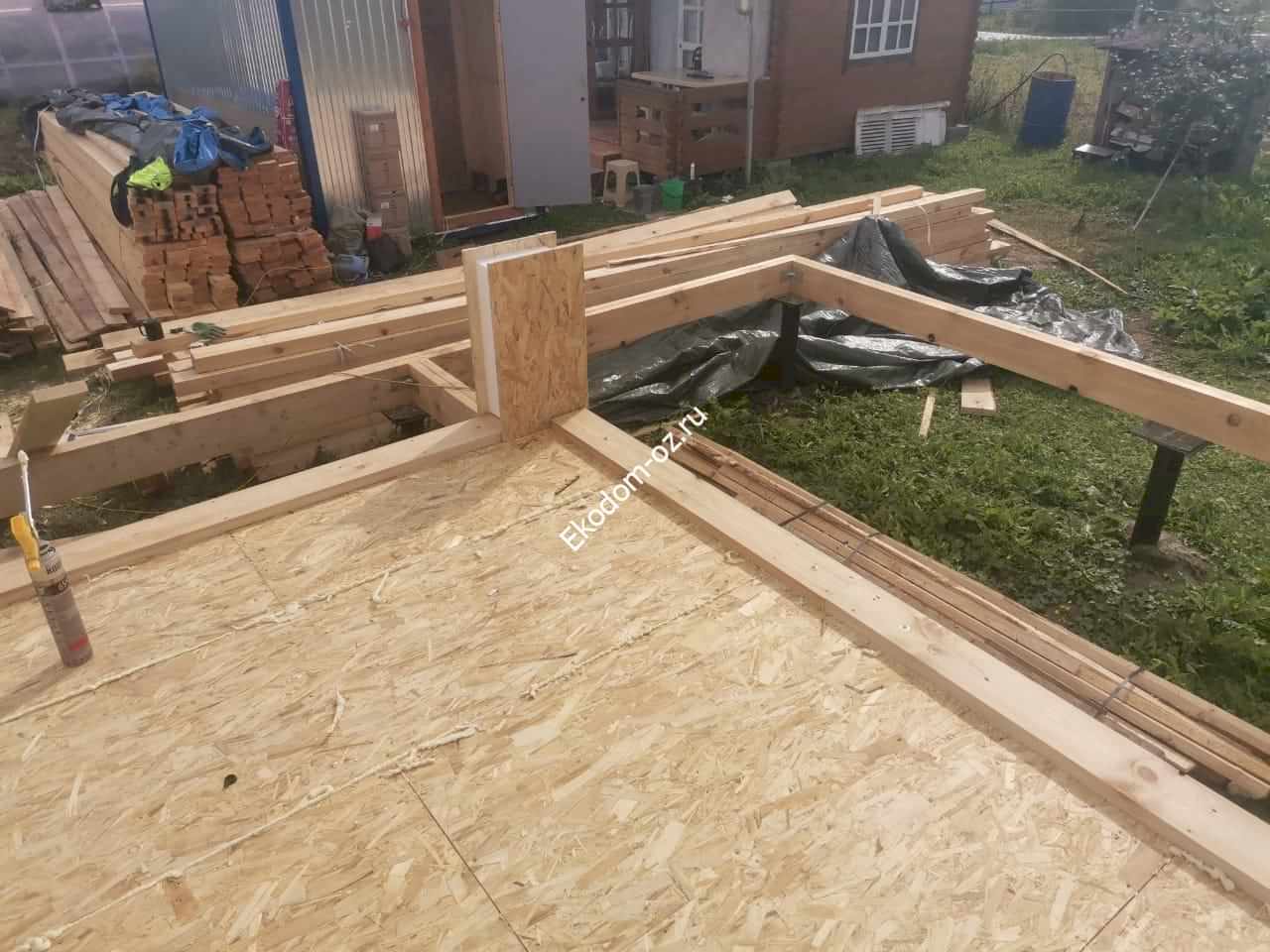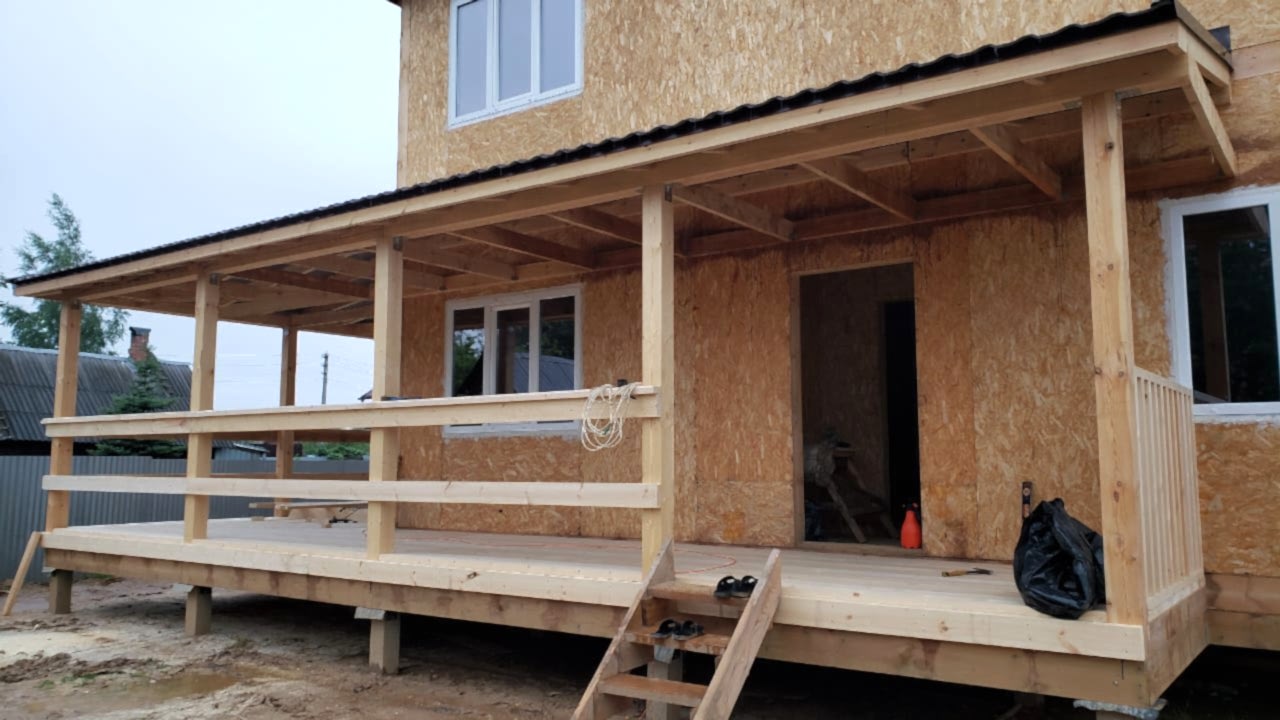 - Сборка крыльца: обвязка, лаги, Пин Ап брус, стропильная система, покрытие ОСП 12 мм с настилом руберойда