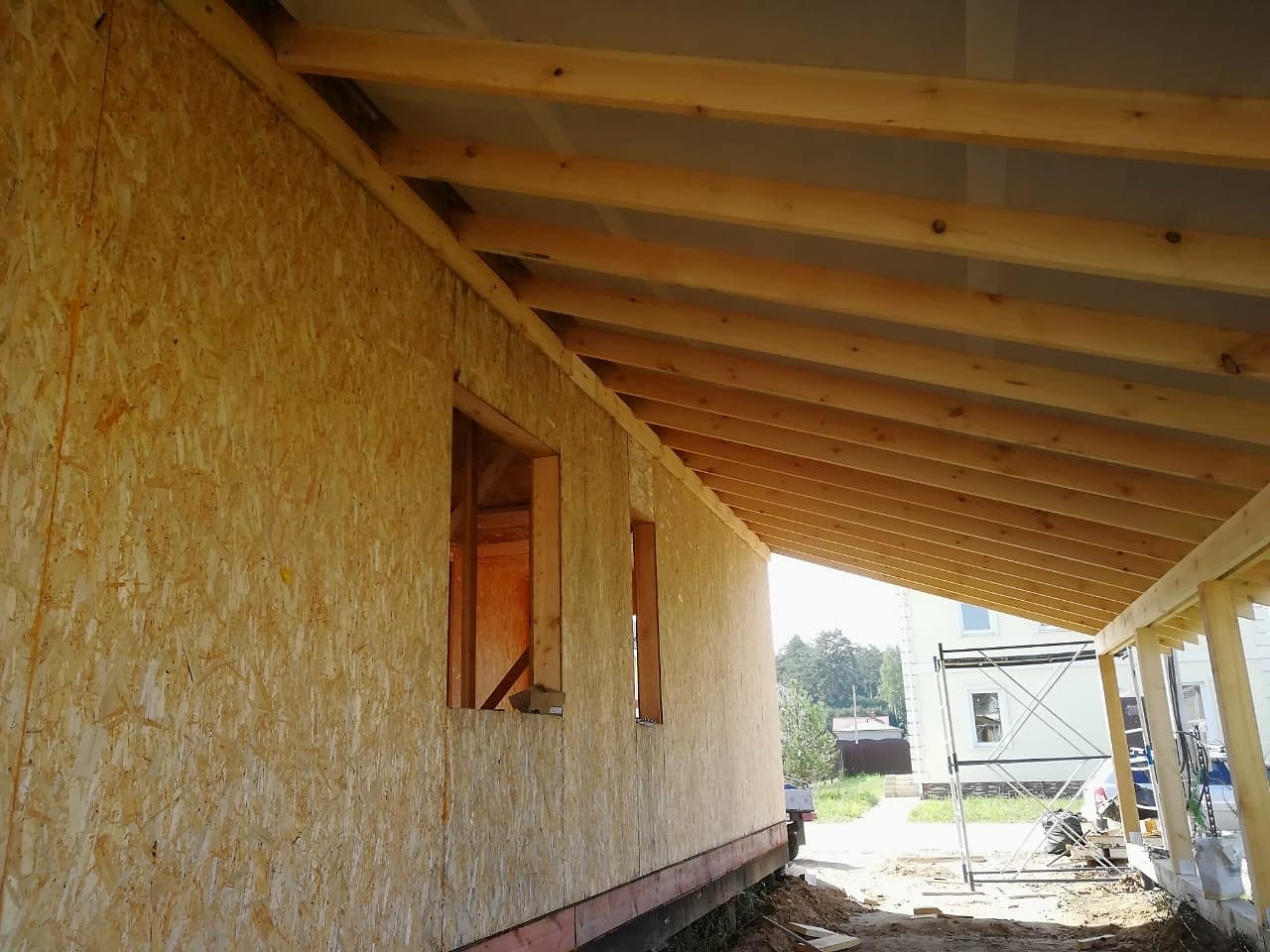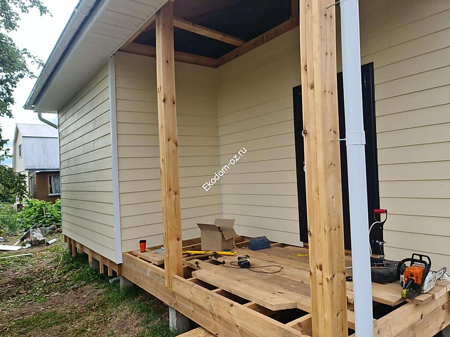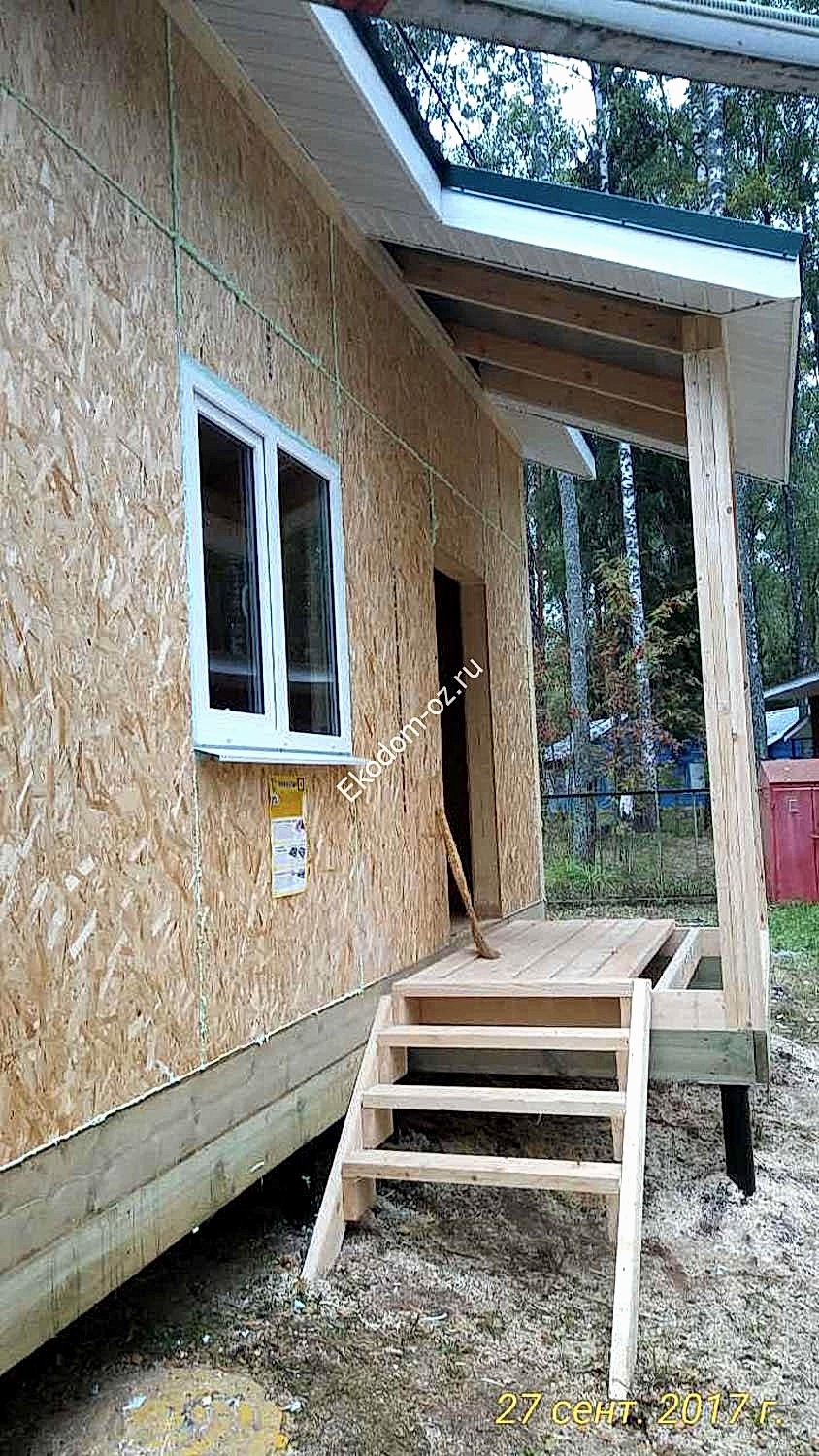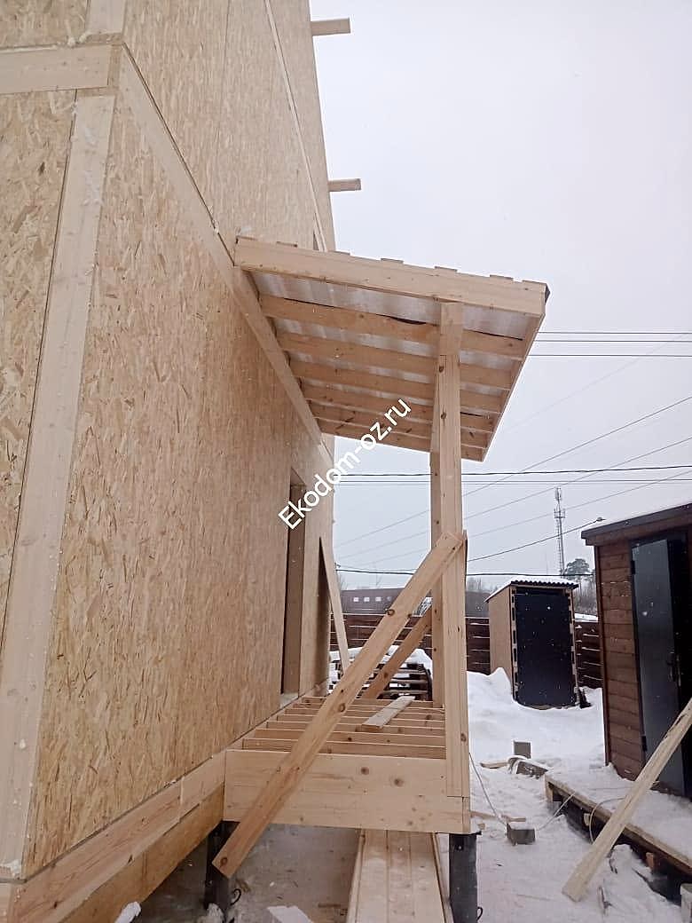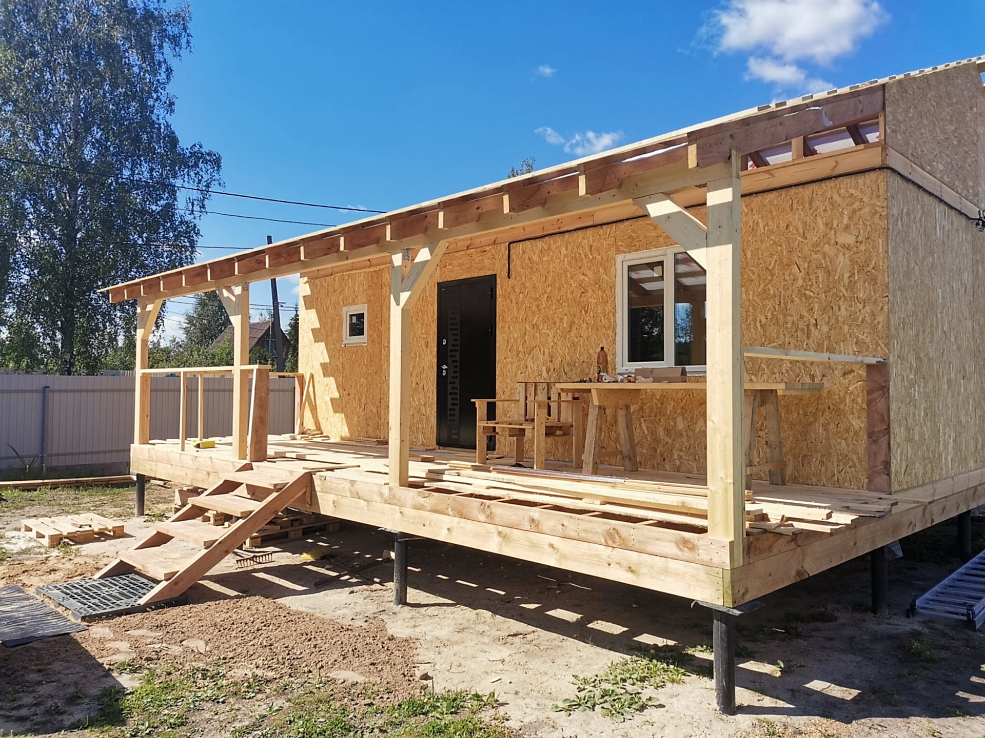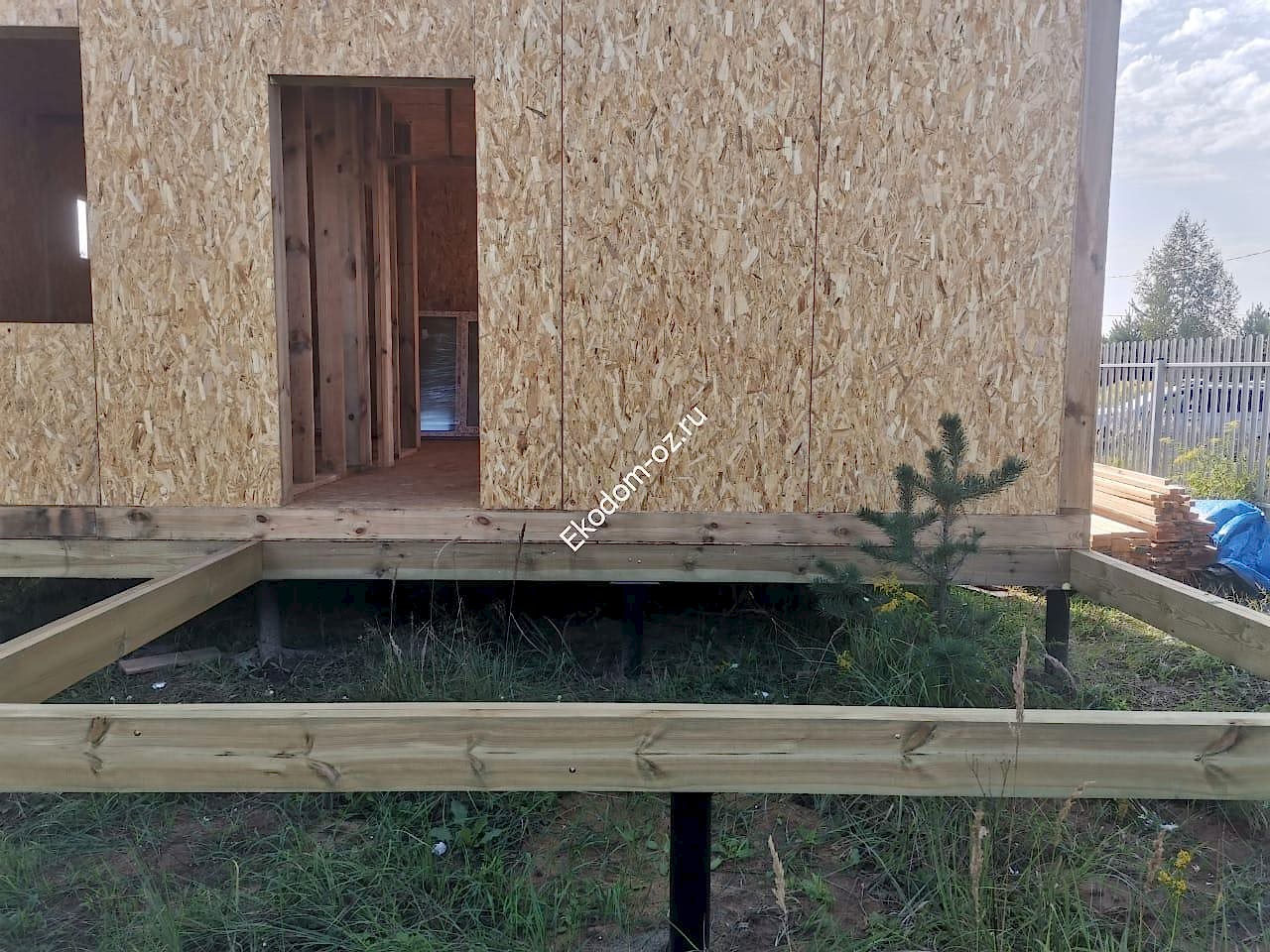 - Сборка крыльца: обвязка, лаги, Пин Ап брус, стропильная система, покрытие ОСП 12 мм с настилом руберойда