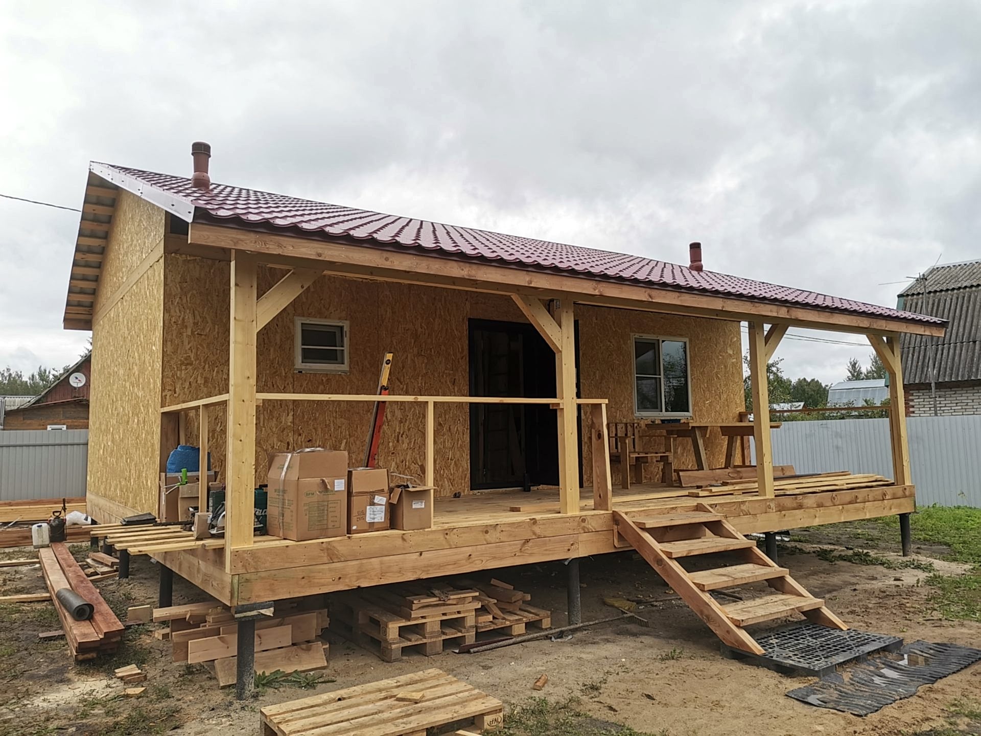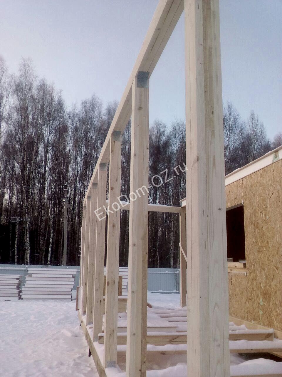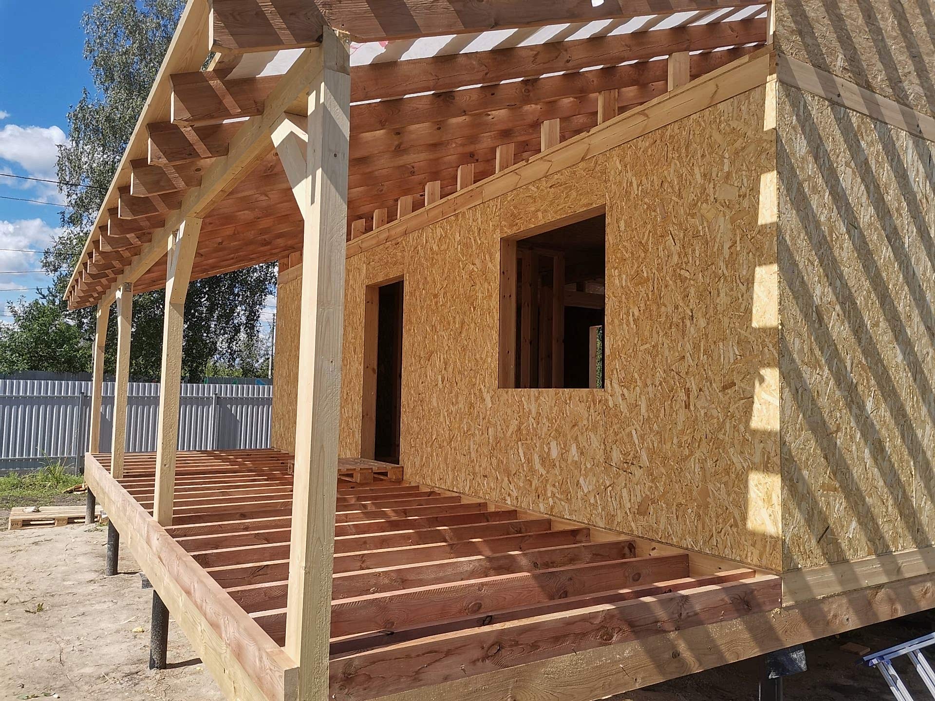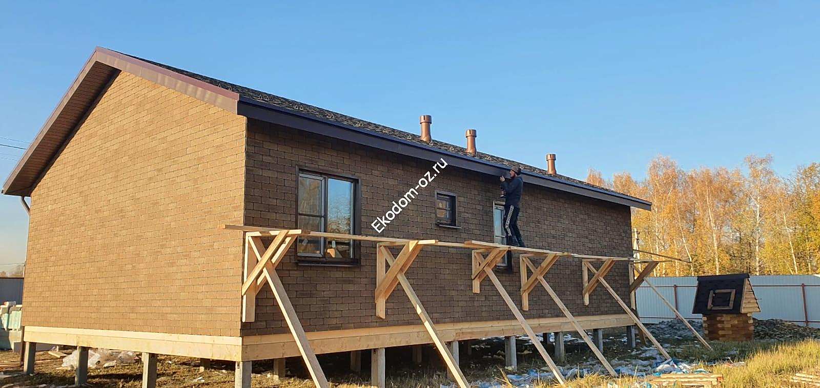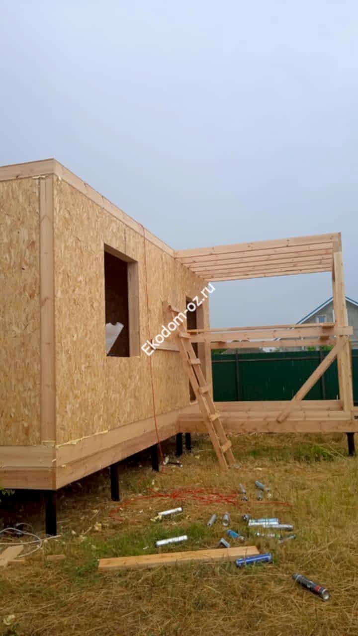 - Сборка крыльца: обвязка, лаги, Пин Ап брус, стропильная система, покрытие ОСП 12 мм с настилом руберойда