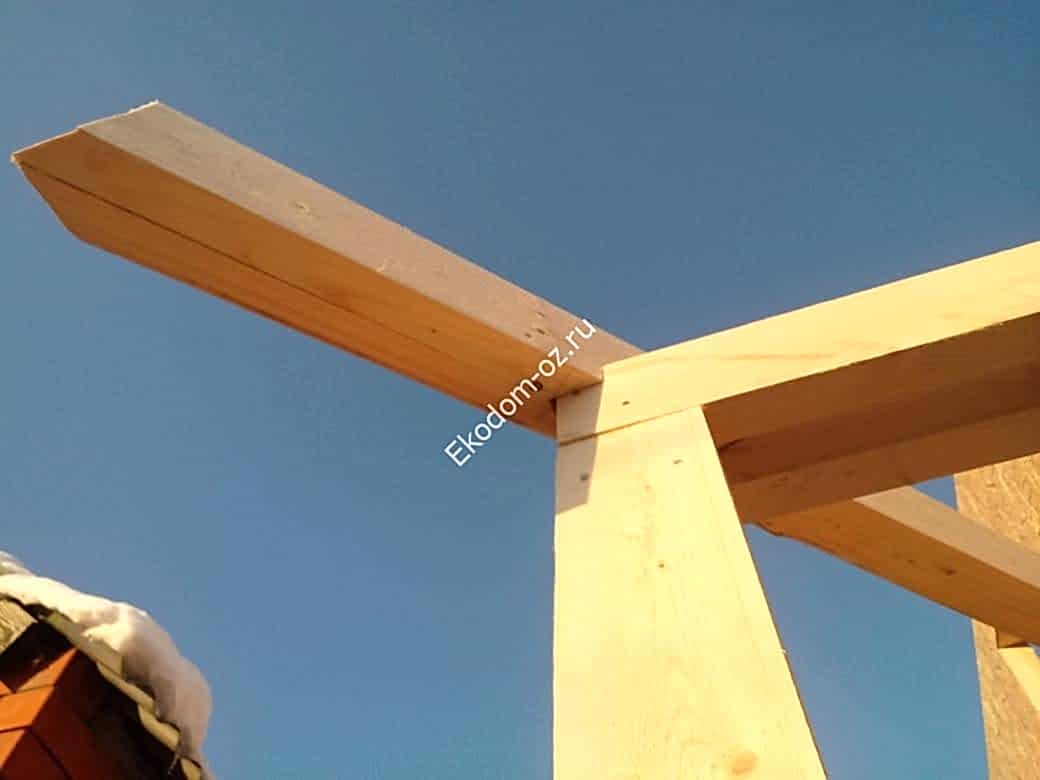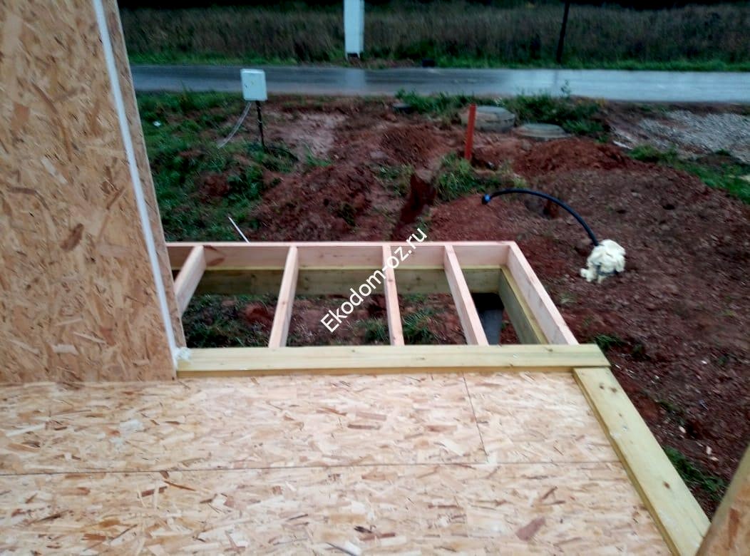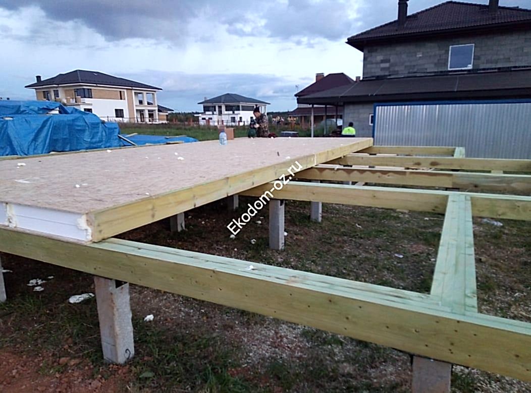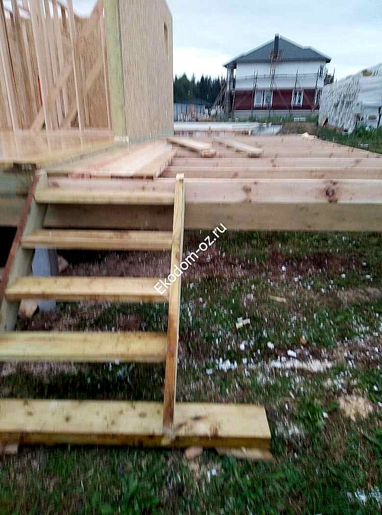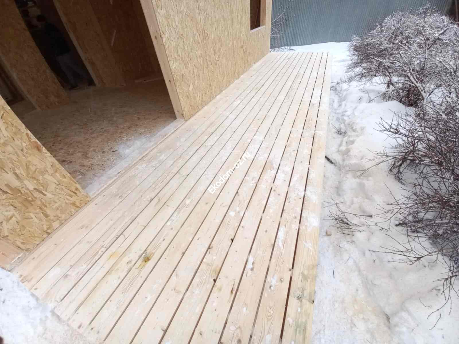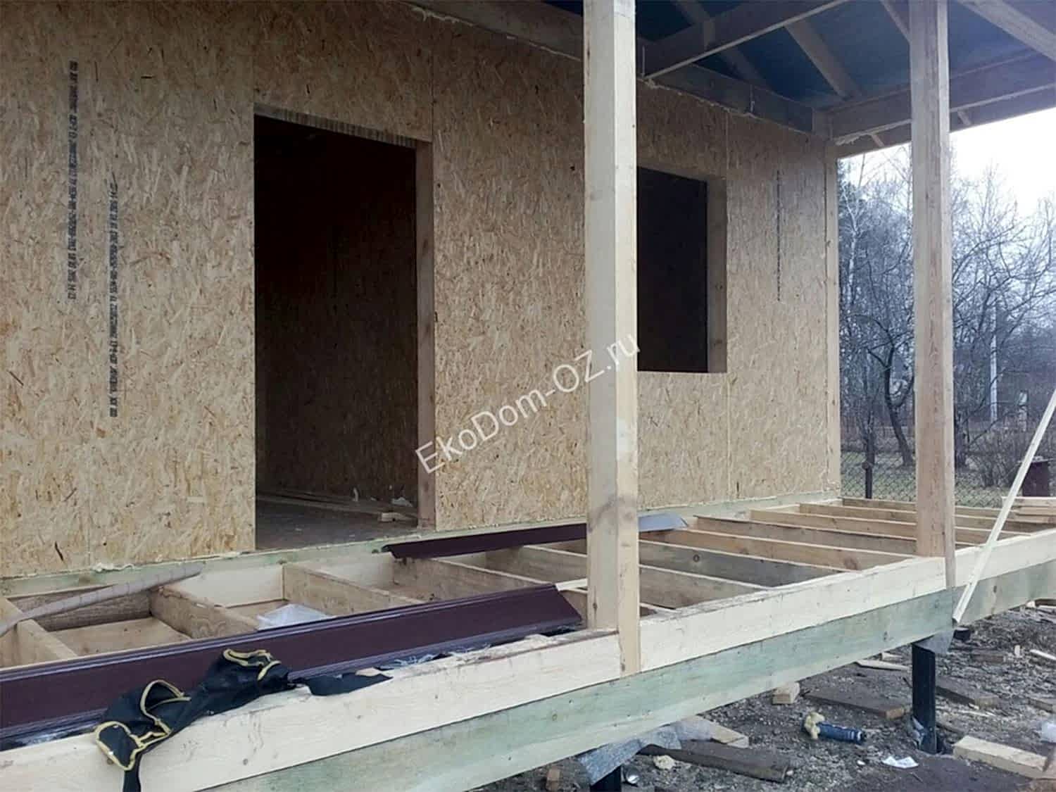- Сборка крыльца: обвязка, лаги, Пин Ап брус, стропильная система, покрытие ОСП 12 мм с настилом руберойда