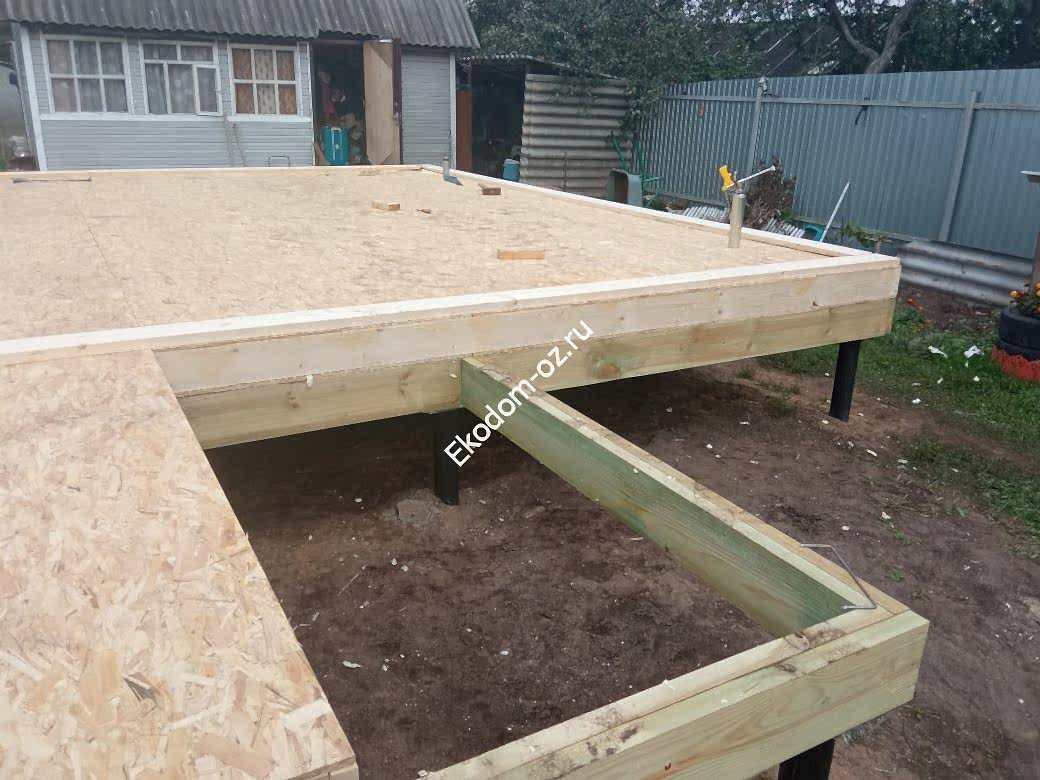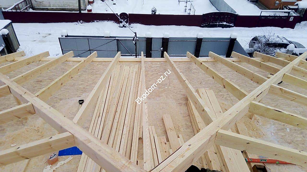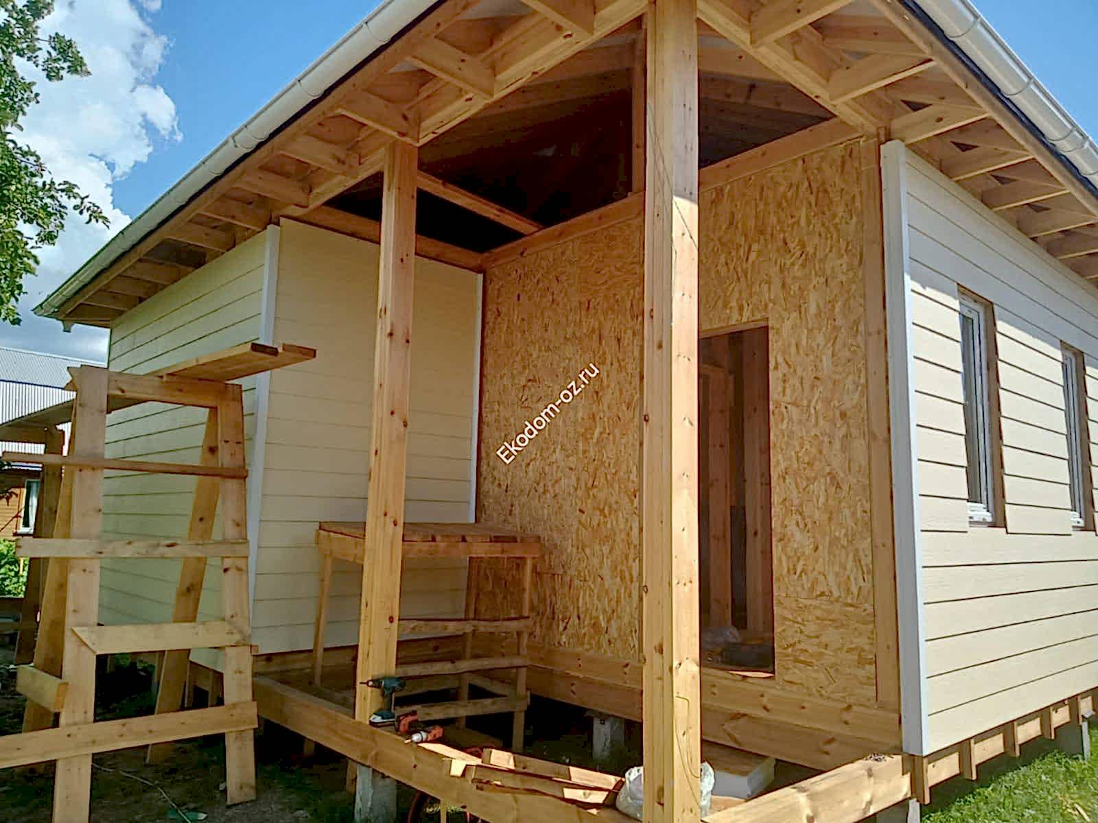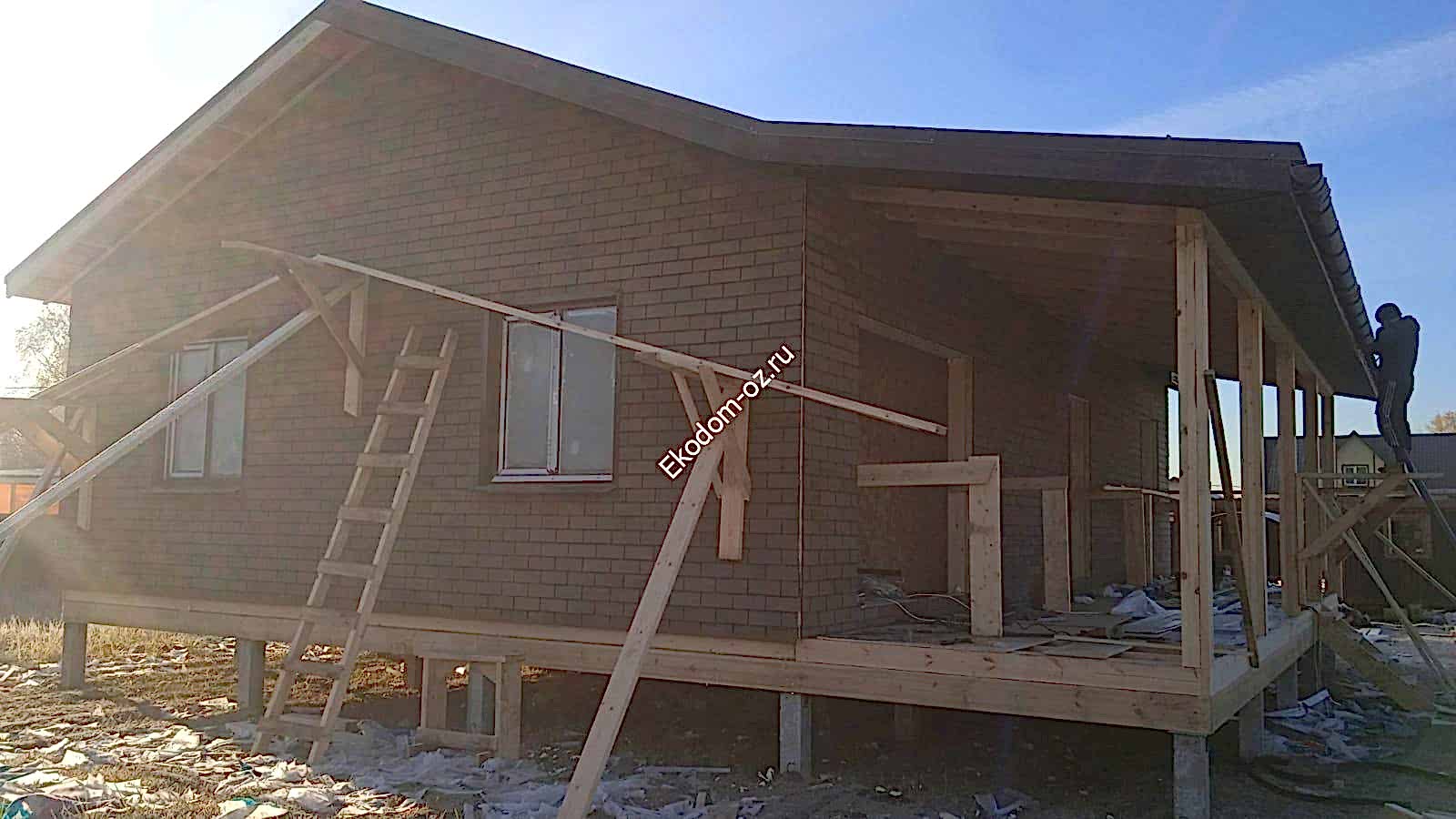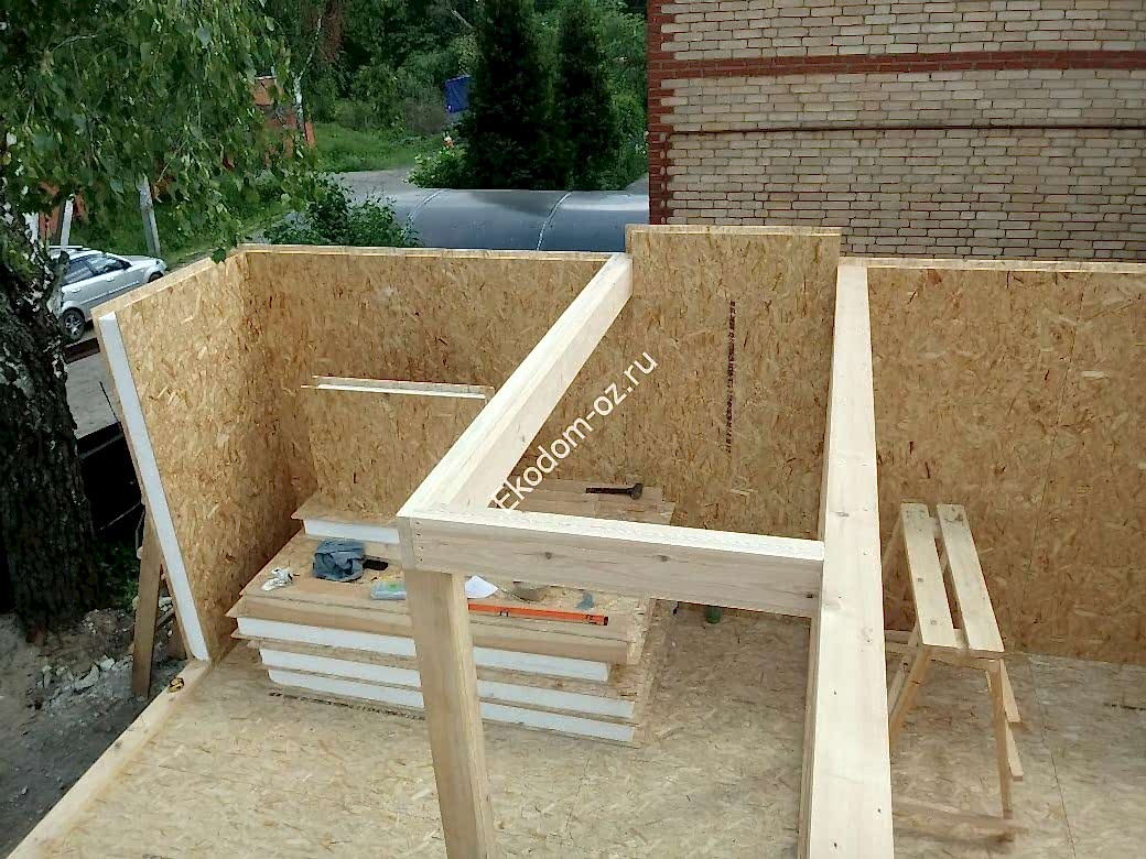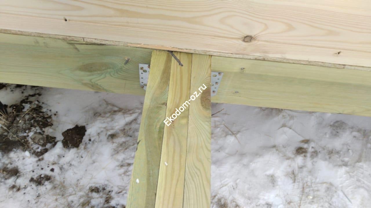 - Сборка крыльца: обвязка, лаги, Пин Ап брус, стропильная система, покрытие ОСП 12 мм с настилом руберойда