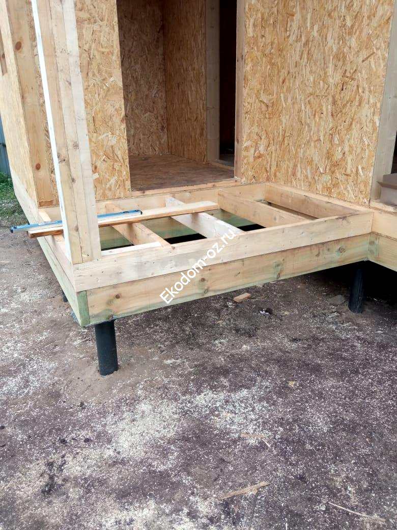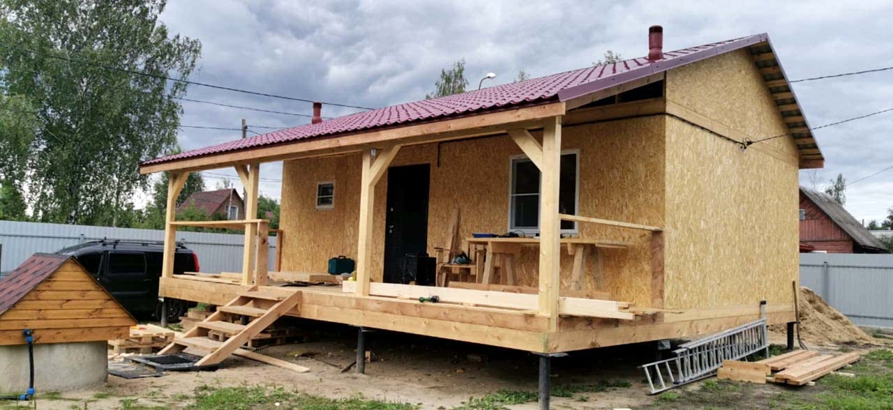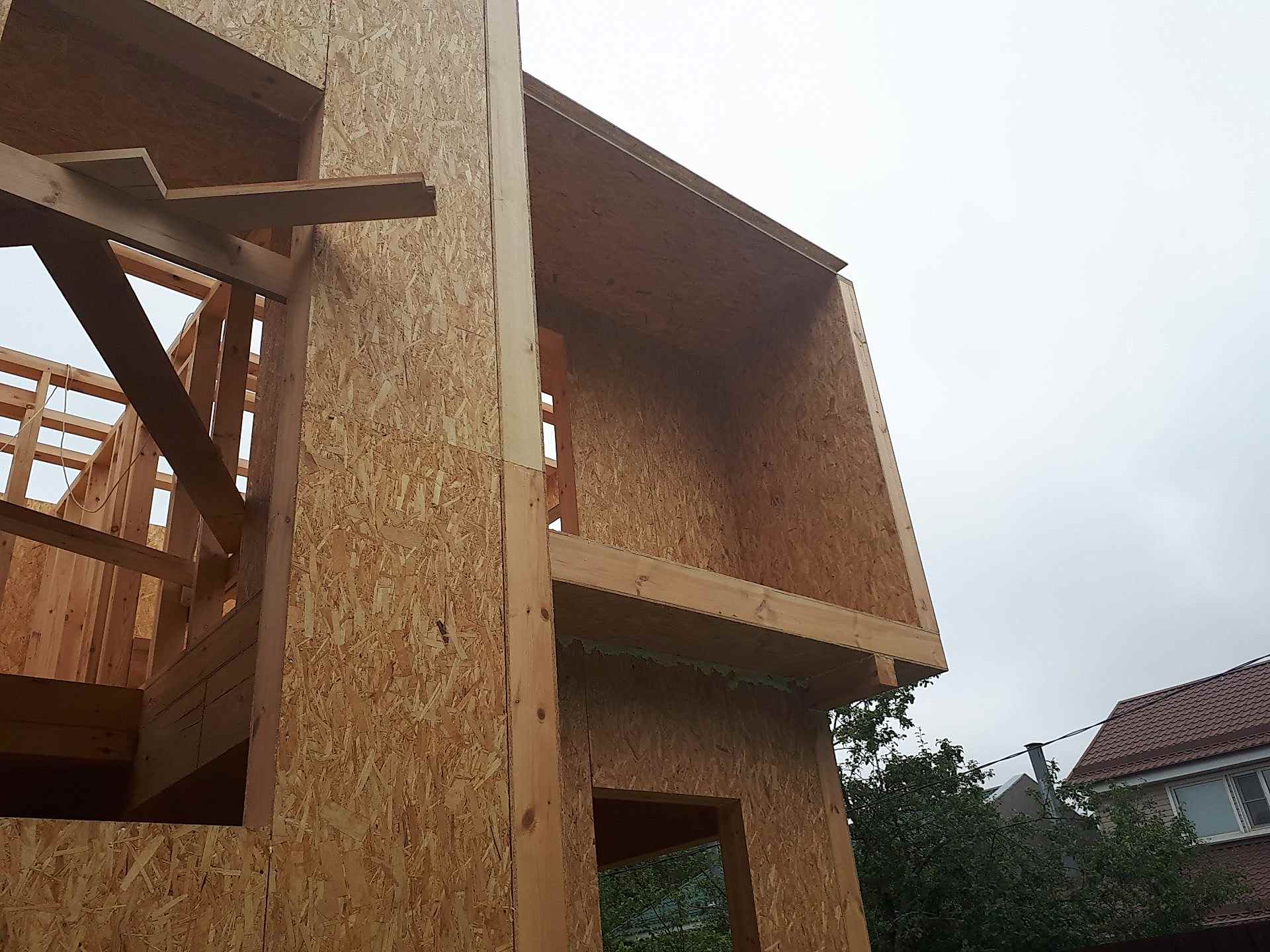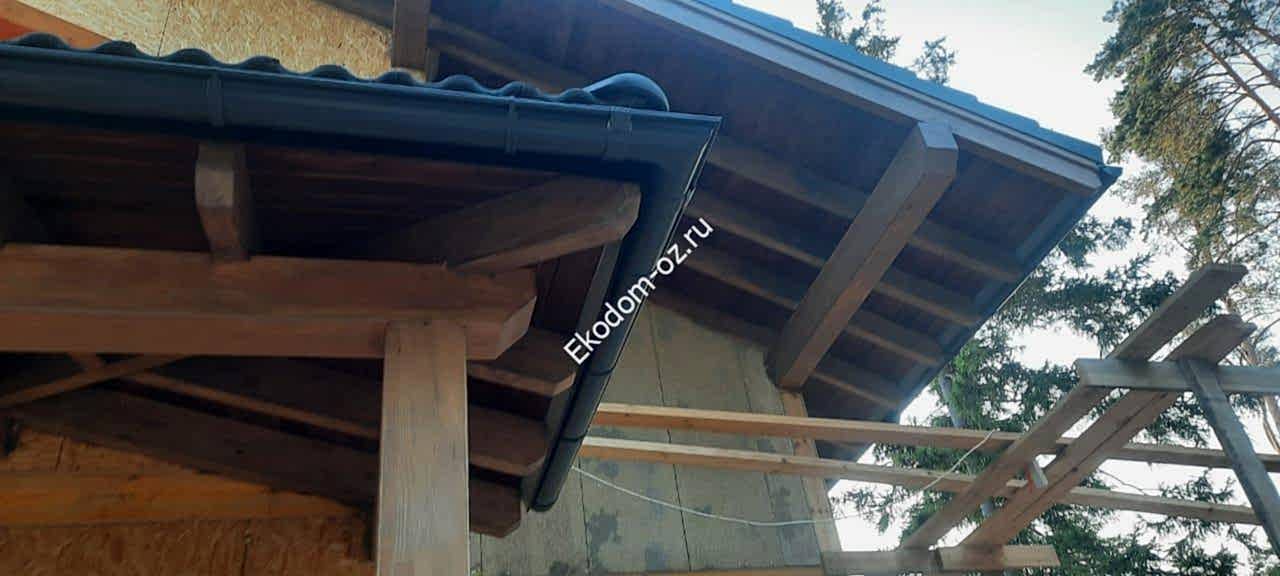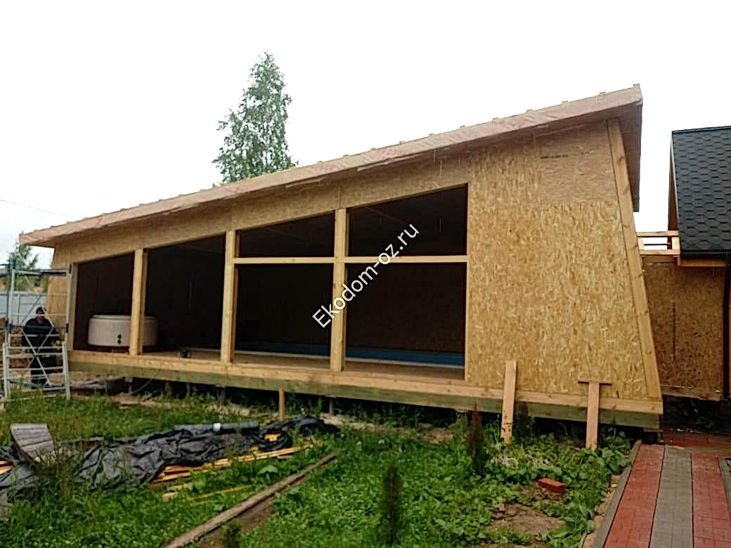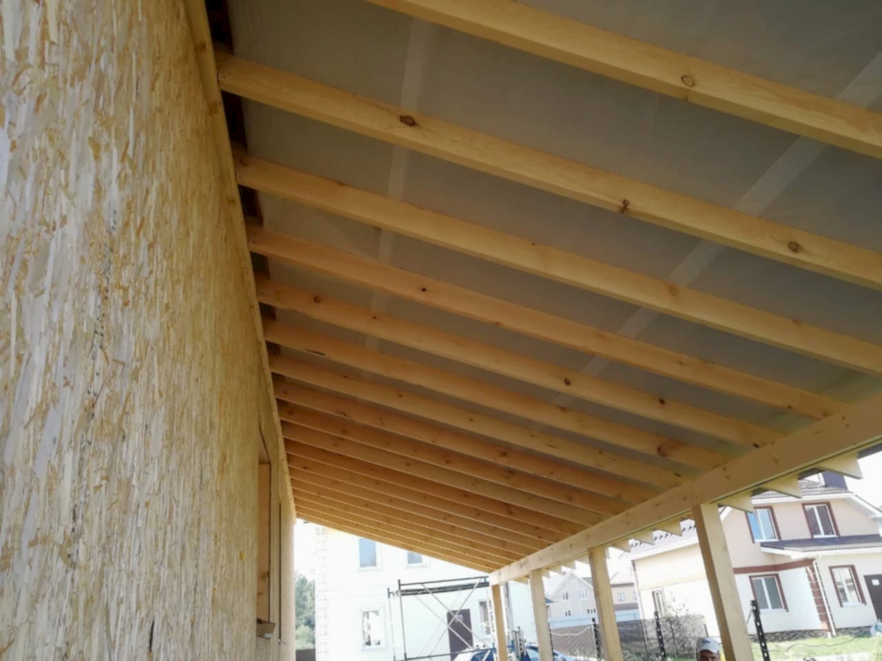 - Сборка крыльца: обвязка, лаги, Пин Ап брус, стропильная система, покрытие ОСП 12 мм с настилом руберойда
