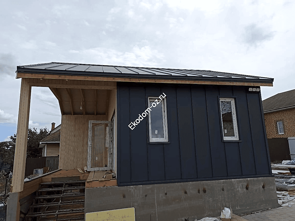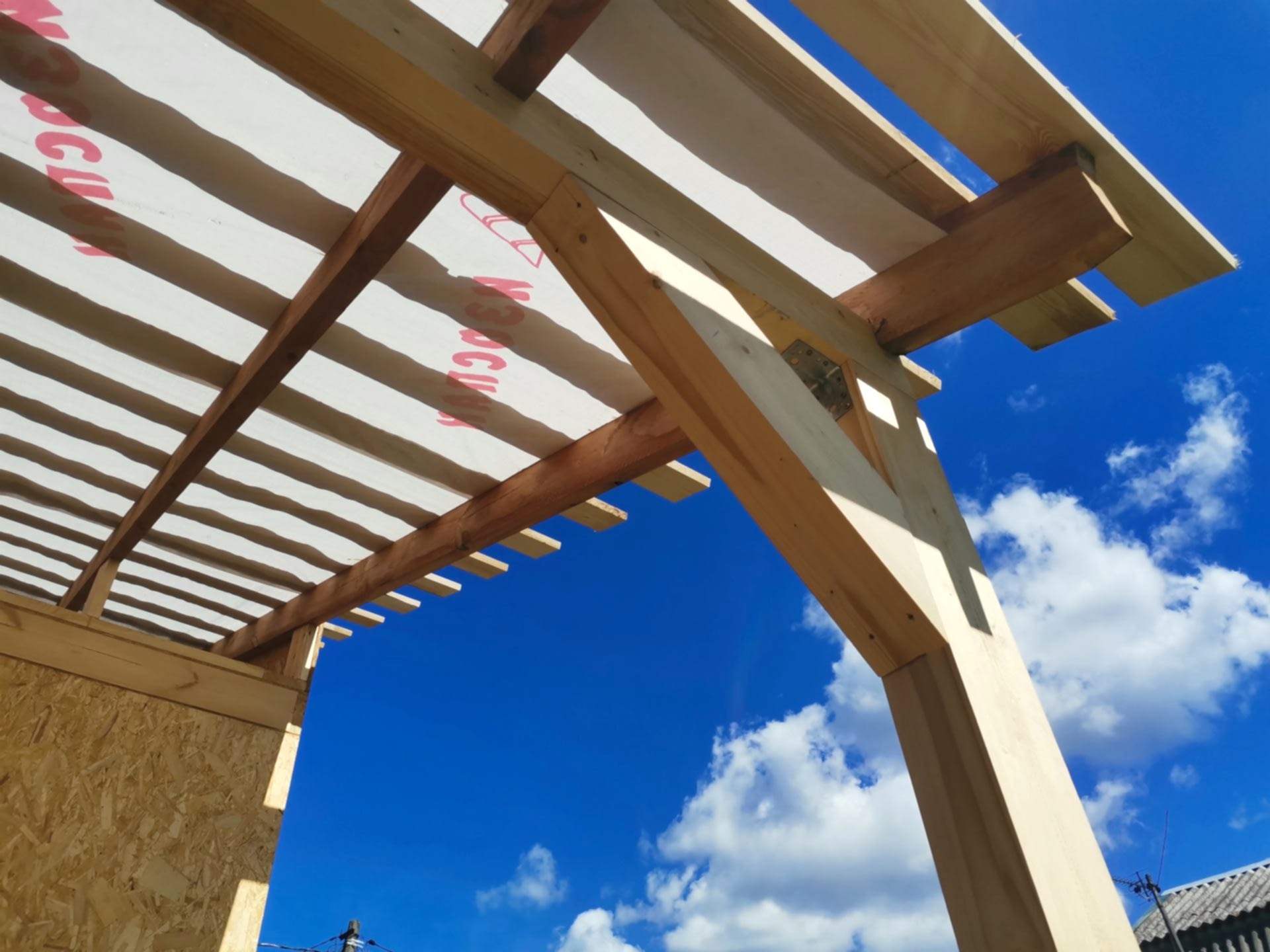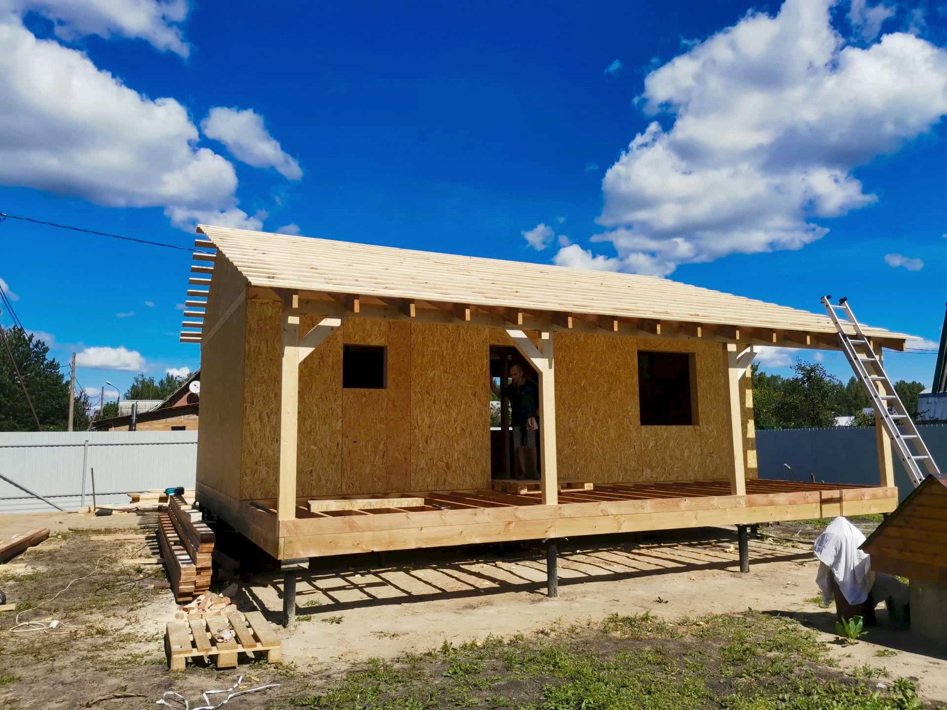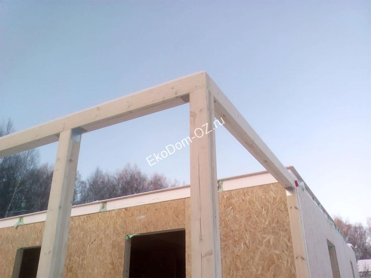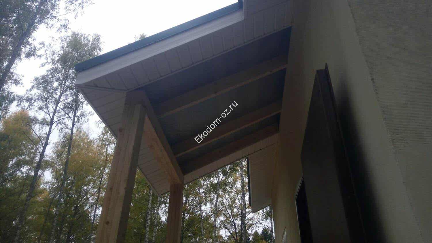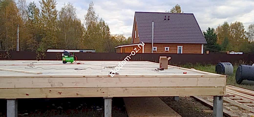 - Сборка крыльца: обвязка, лаги, Пин Ап брус, стропильная система, покрытие ОСП 12 мм с настилом руберойда