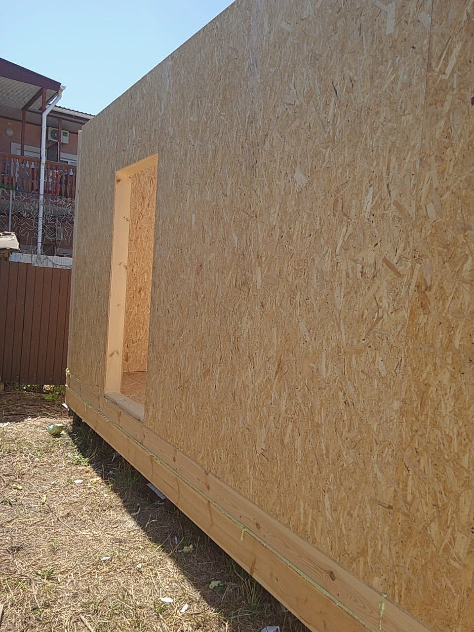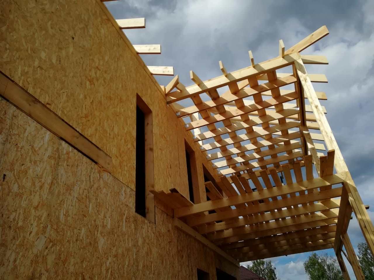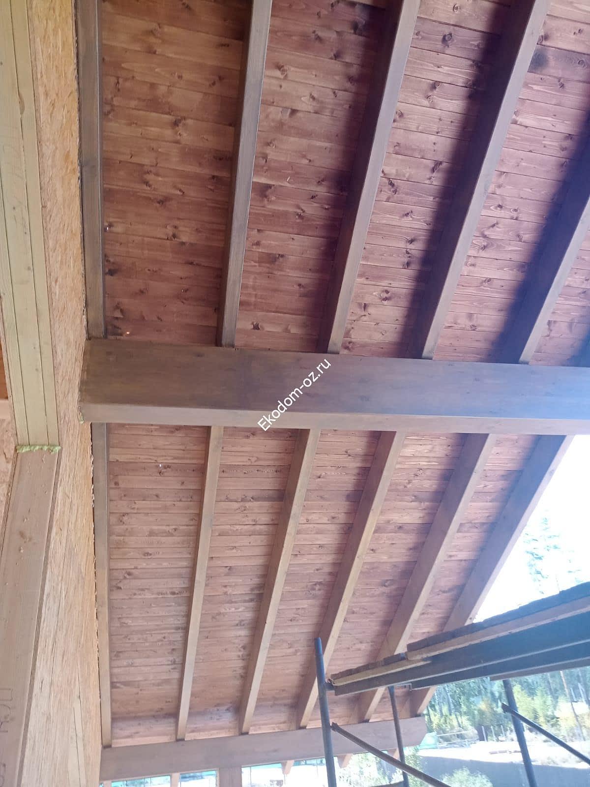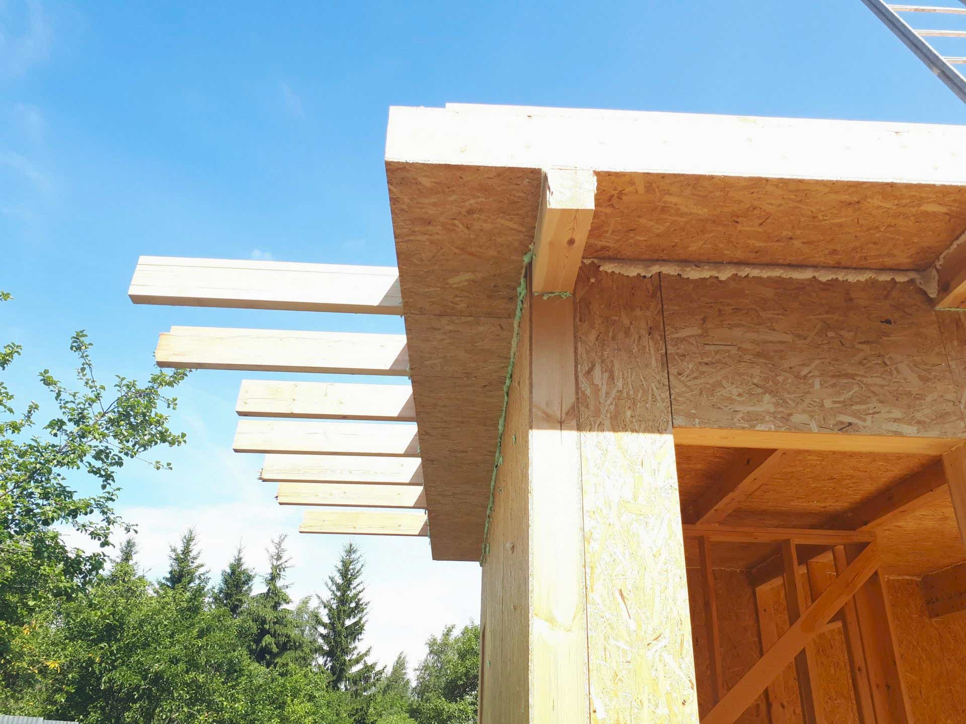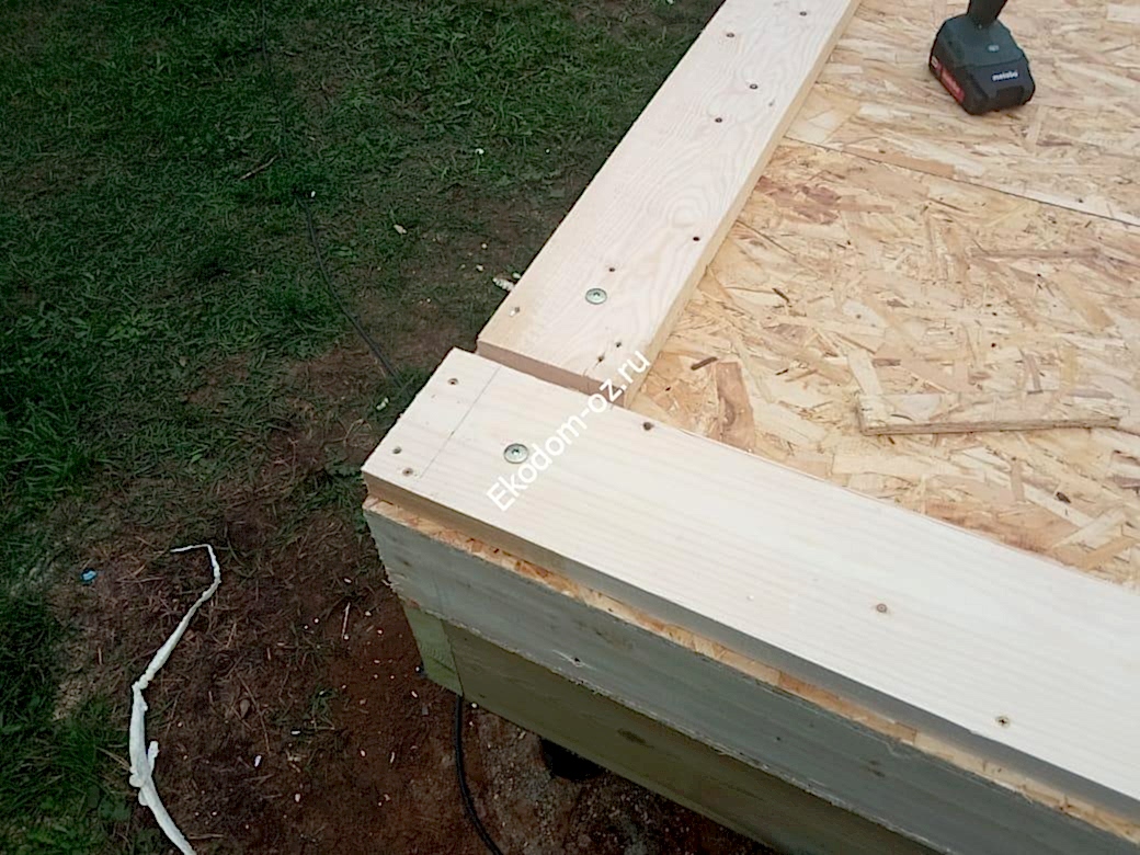 - Сборка крыльца: обвязка, лаги, Пин Ап брус, стропильная система, покрытие ОСП 12 мм с настилом руберойда