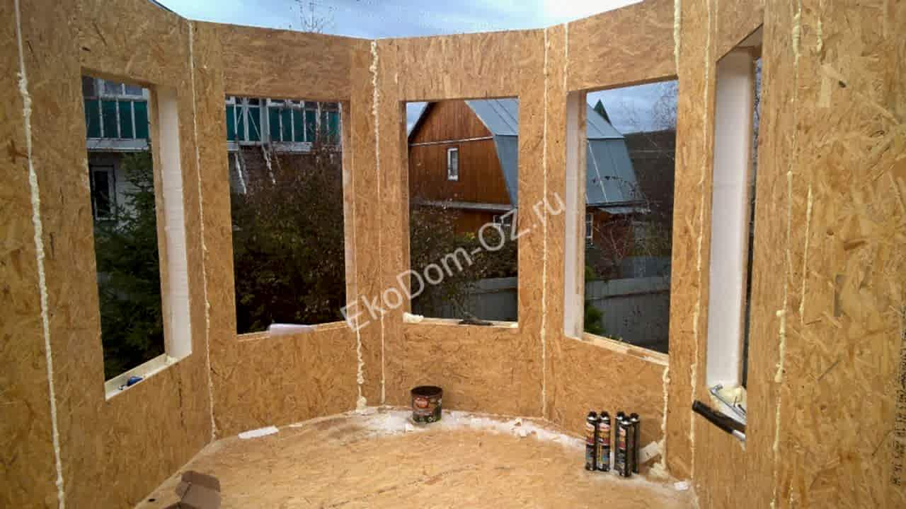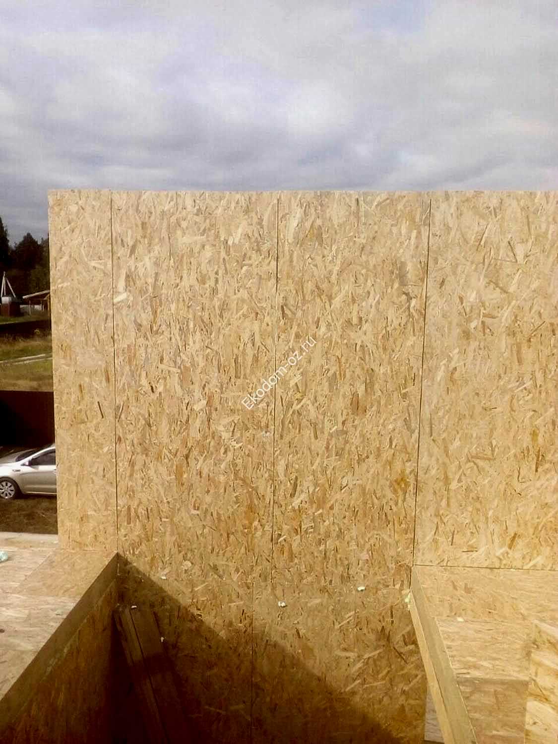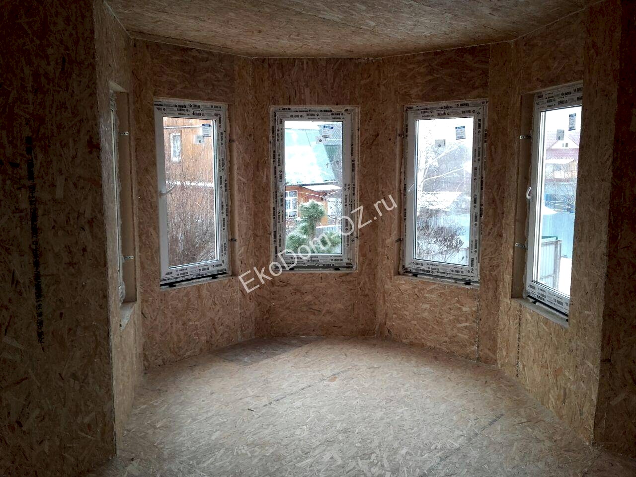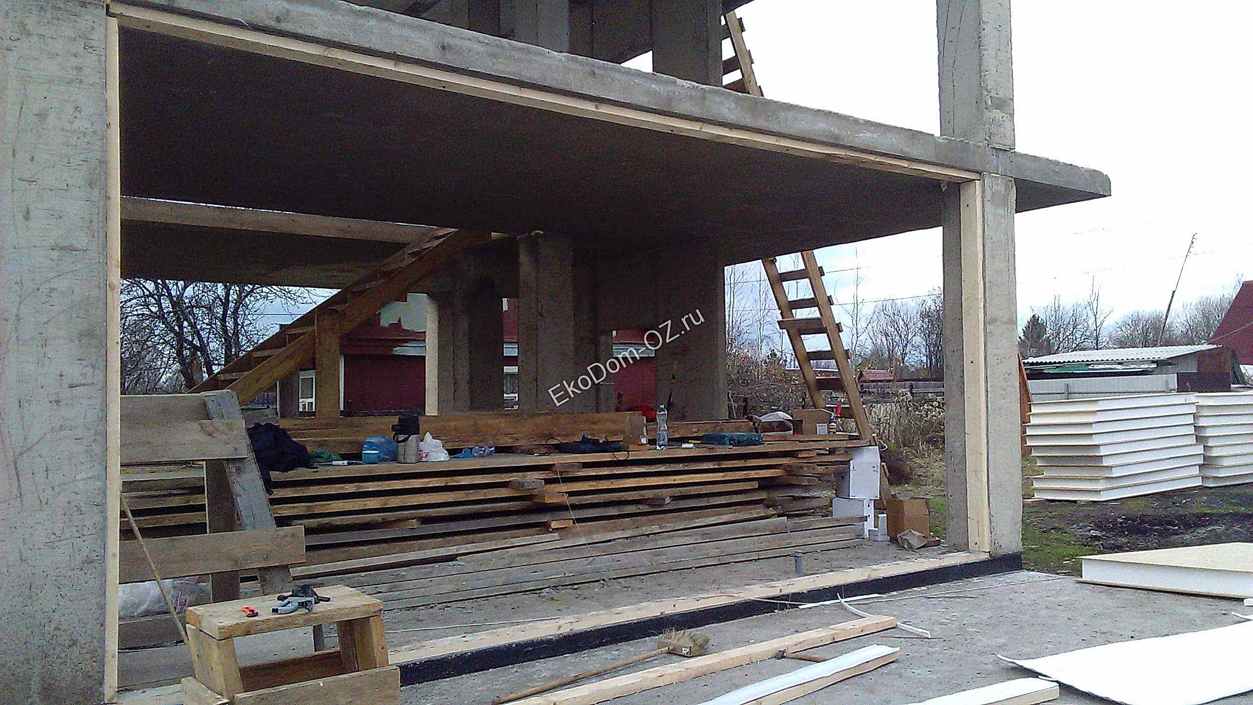 Монолитный каркас дома был возведен заказчиком заранее и был готов к дальнейшим этапам строительства. Каркас (на 1-м и 2-м этажах) зашили с трех строн SIP-панелями с использованием OSB «Egger», а одну стену полностью остеклили. Благодаря высокому теплосопротивлению панелей и современным технологиям производства стеклопакетов, этот дом будет теплым (без больших теплопотерь в зимний период) и комфортным для проживания.
