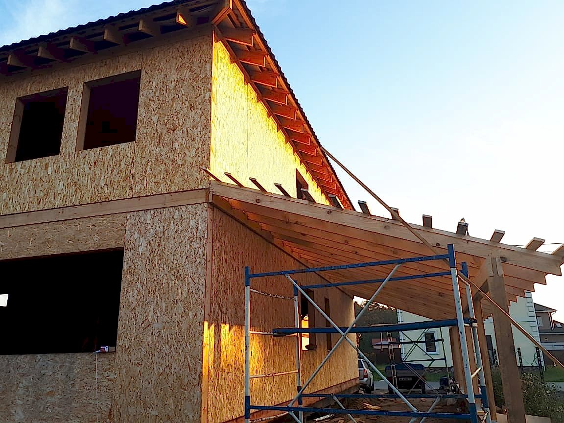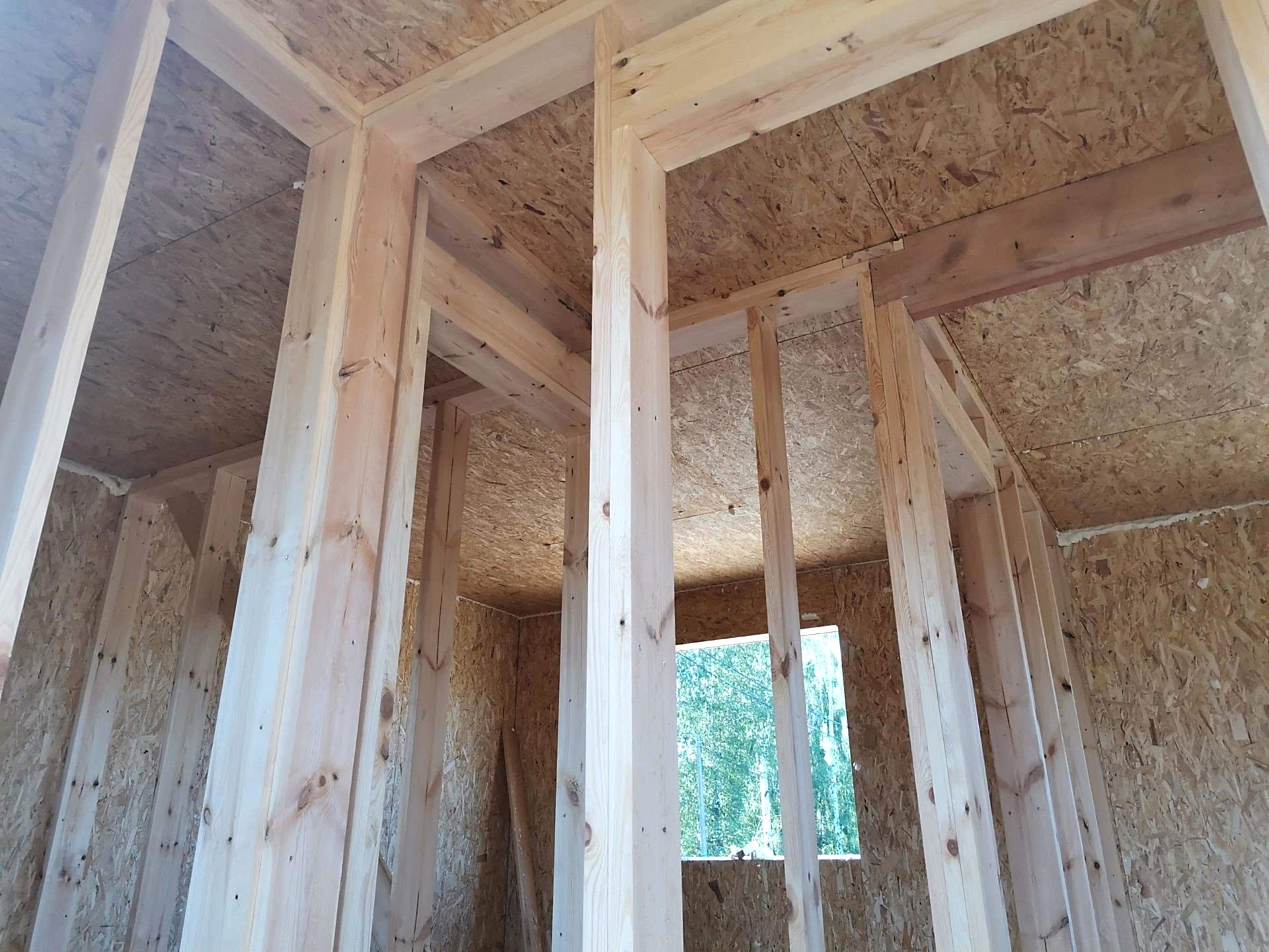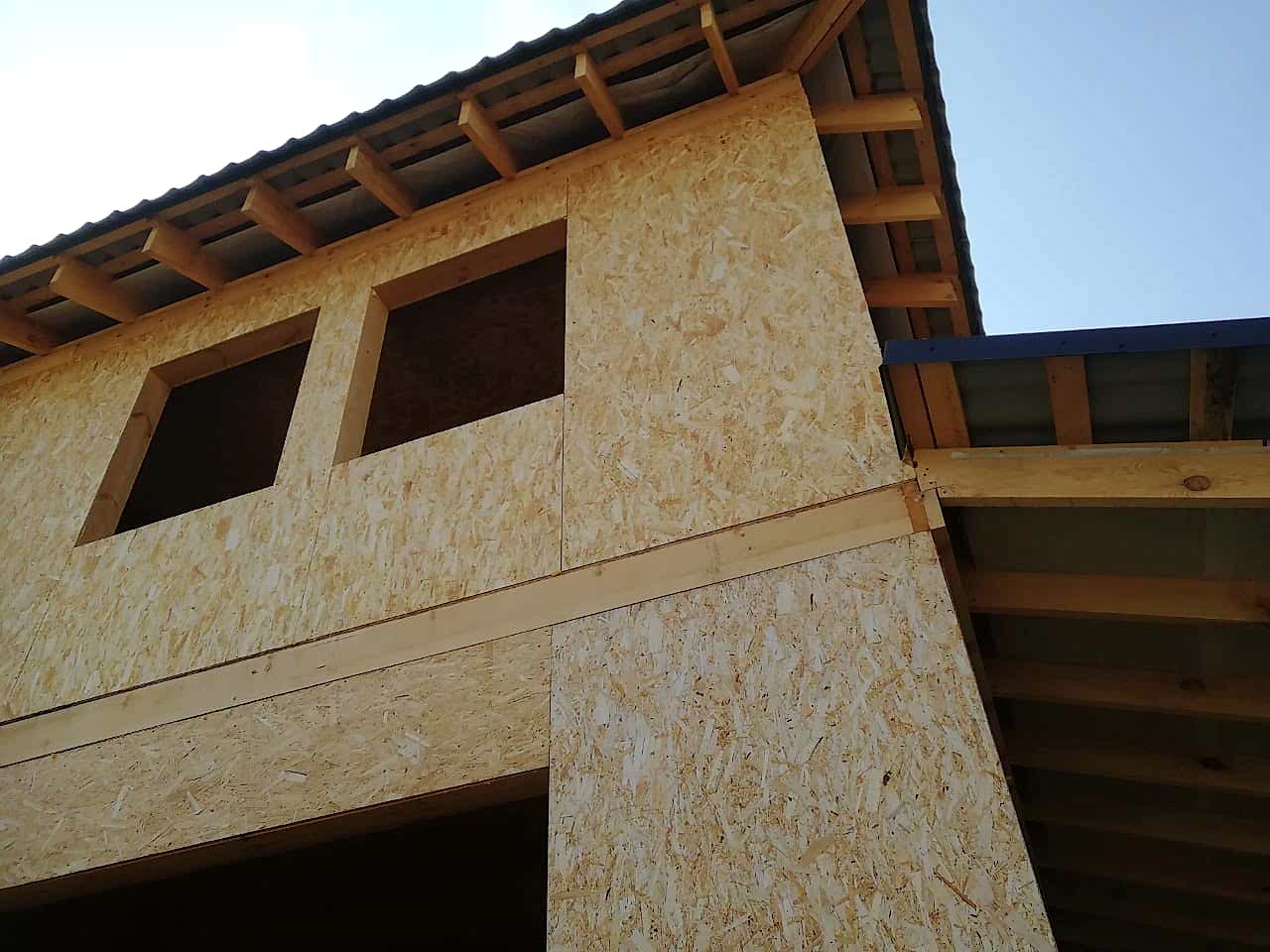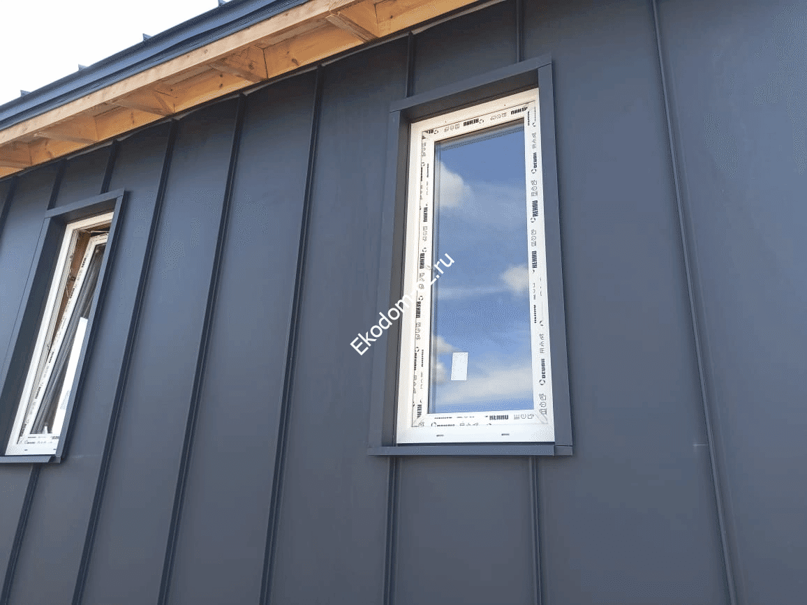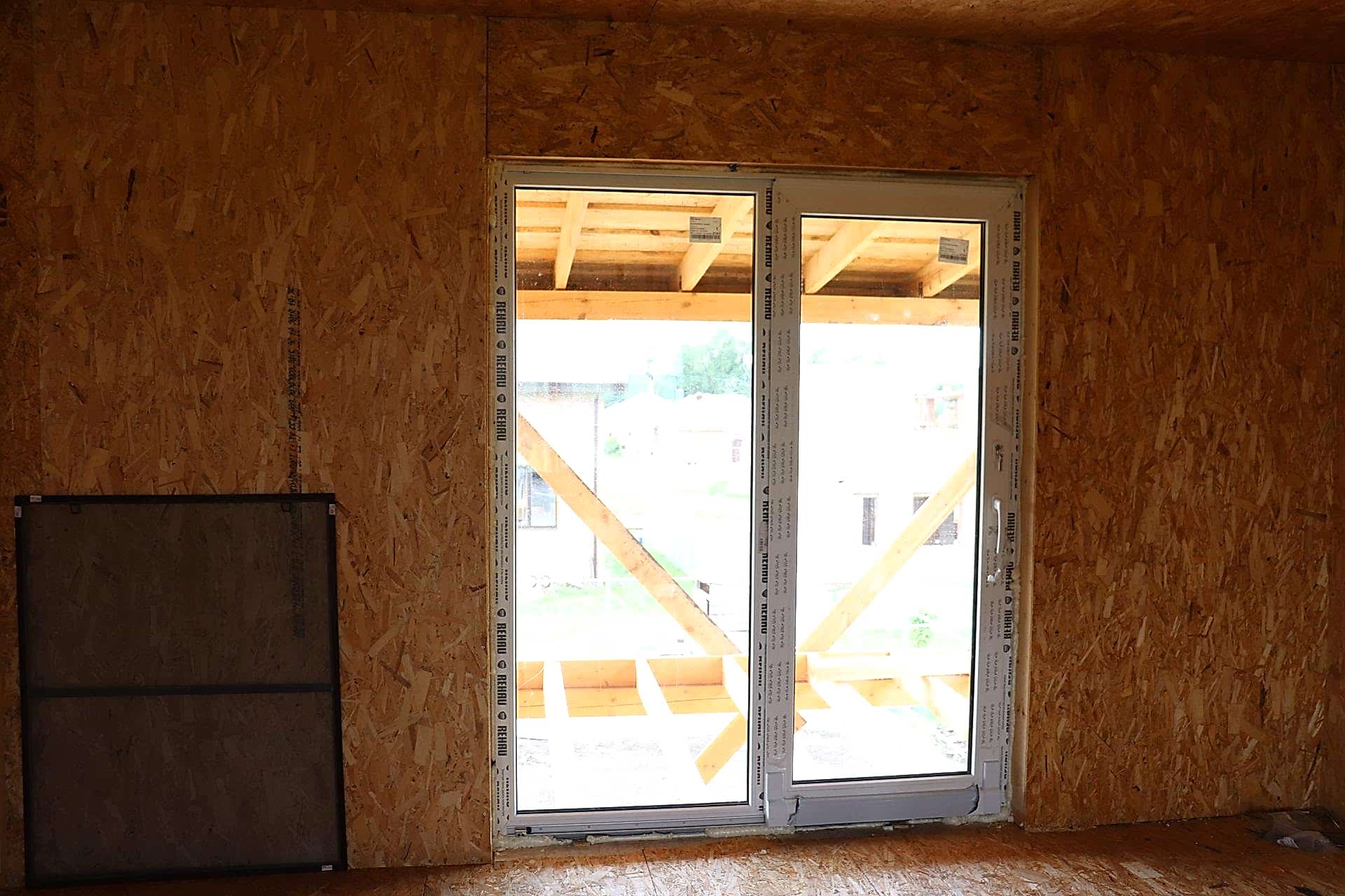 Монолитный каркас дома был возведен заказчиком заранее и был готов к дальнейшим этапам строительства. Каркас (на 1-м и 2-м этажах) зашили с трех строн SIP-панелями с использованием OSB «Egger», а одну стену полностью остеклили. Благодаря высокому теплосопротивлению панелей и современным технологиям производства стеклопакетов, этот дом будет теплым (без больших теплопотерь в зимний период) и комфортным для проживания.