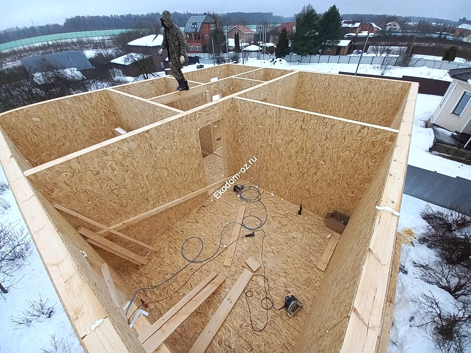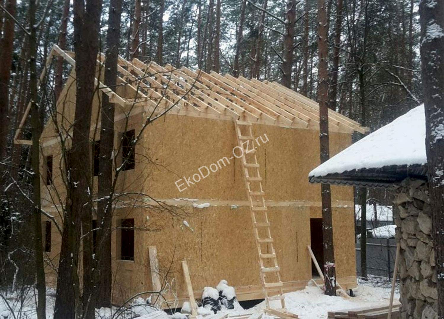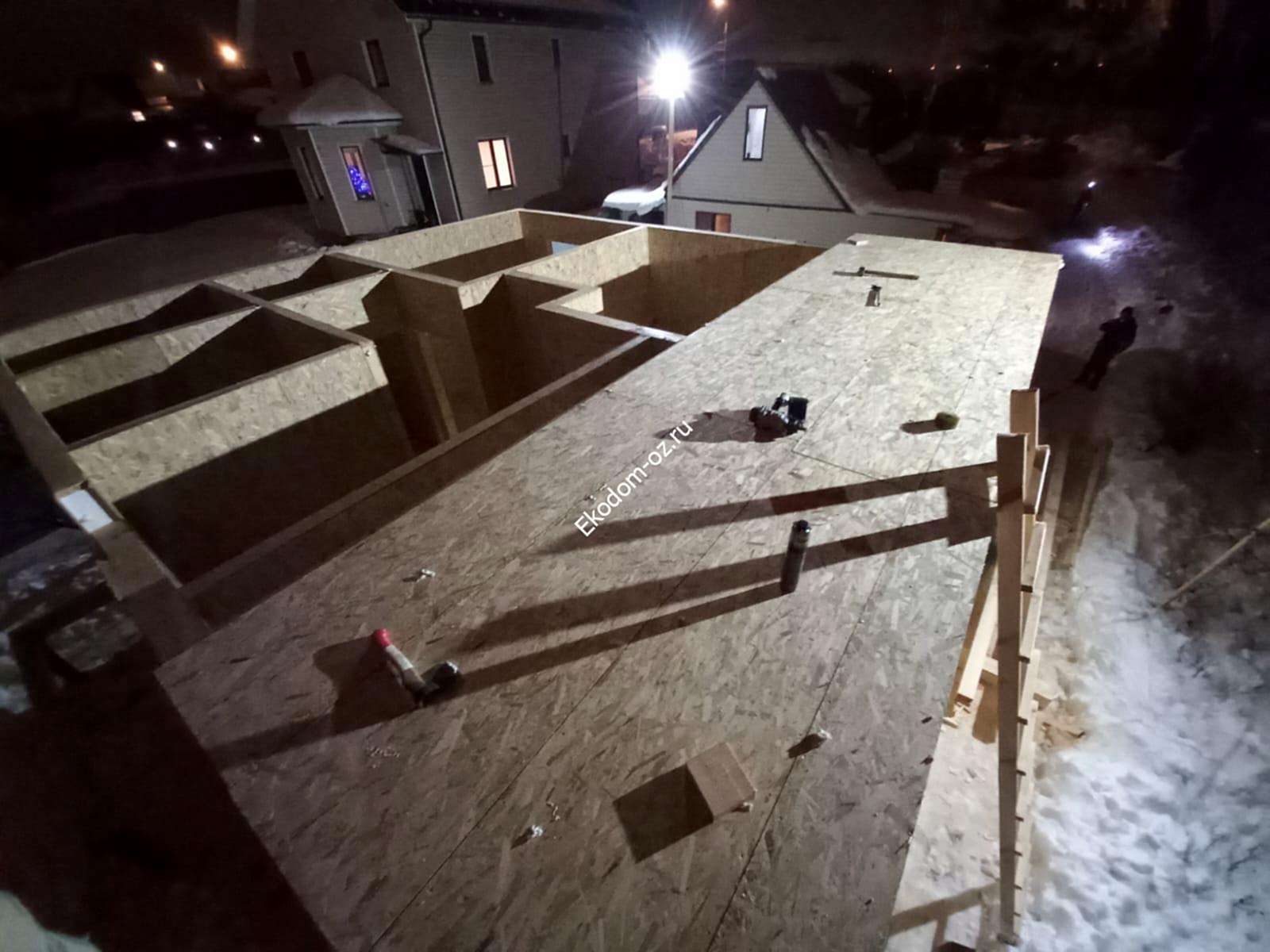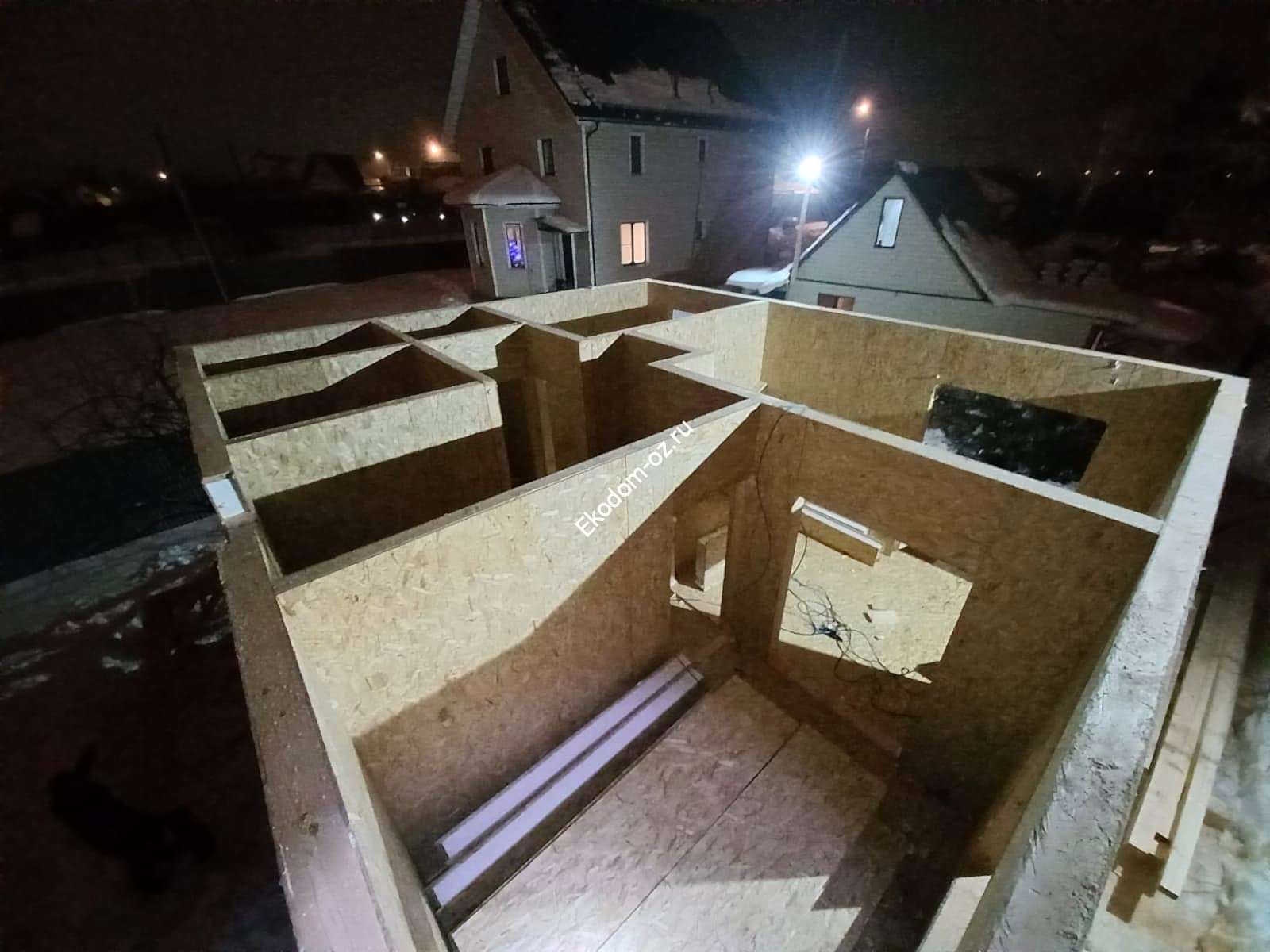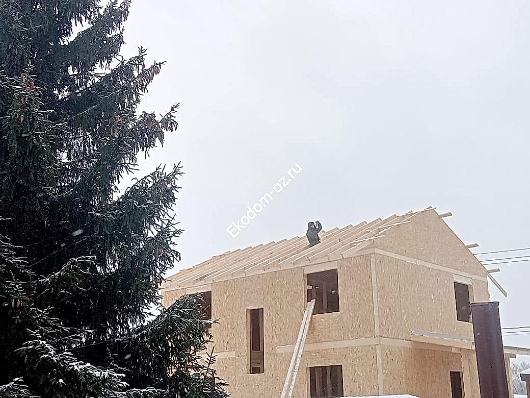 Дом с двумя полноценными этажами возвели за 14 дней. Строительство объекта из SIP панелей с использованием OSB «Калевала» происходило зимой в г. Орехово-Зуево. На фото можно увидеть конструкцию стропильной системы и обрешетки, монтаж цокольного перекрытия.