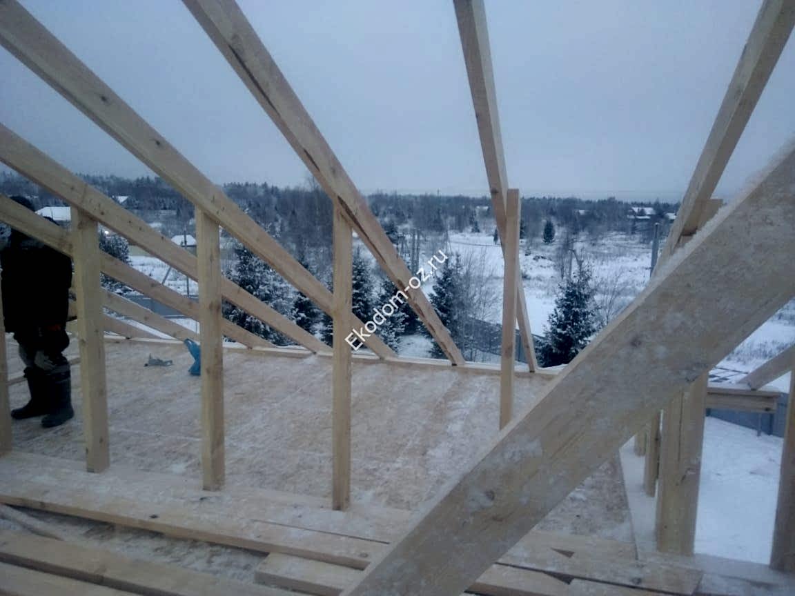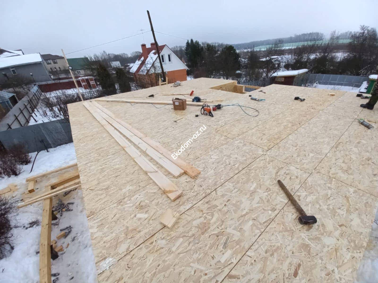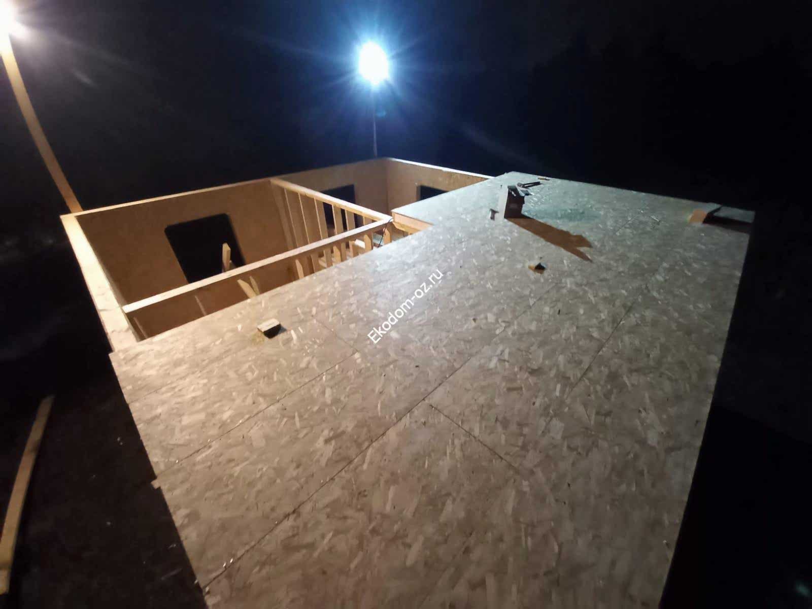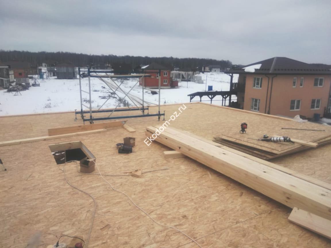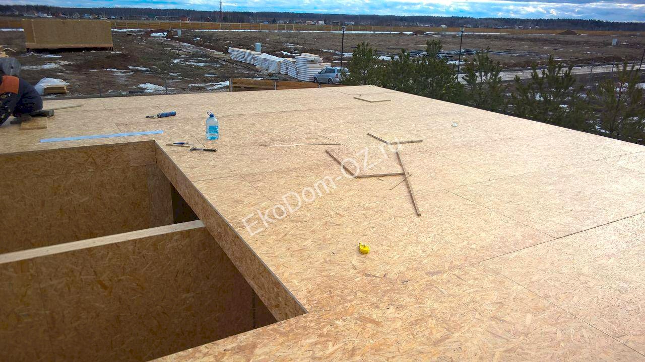 Дом с двумя полноценными этажами возвели за 14 дней. Строительство объекта из SIP панелей с использованием OSB «Калевала» происходило зимой в г. Орехово-Зуево. На фото можно увидеть конструкцию стропильной системы и обрешетки, монтаж цокольного перекрытия.