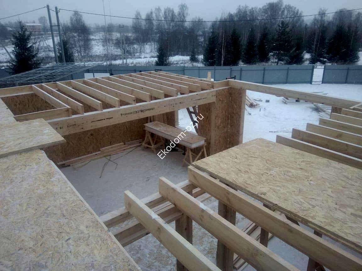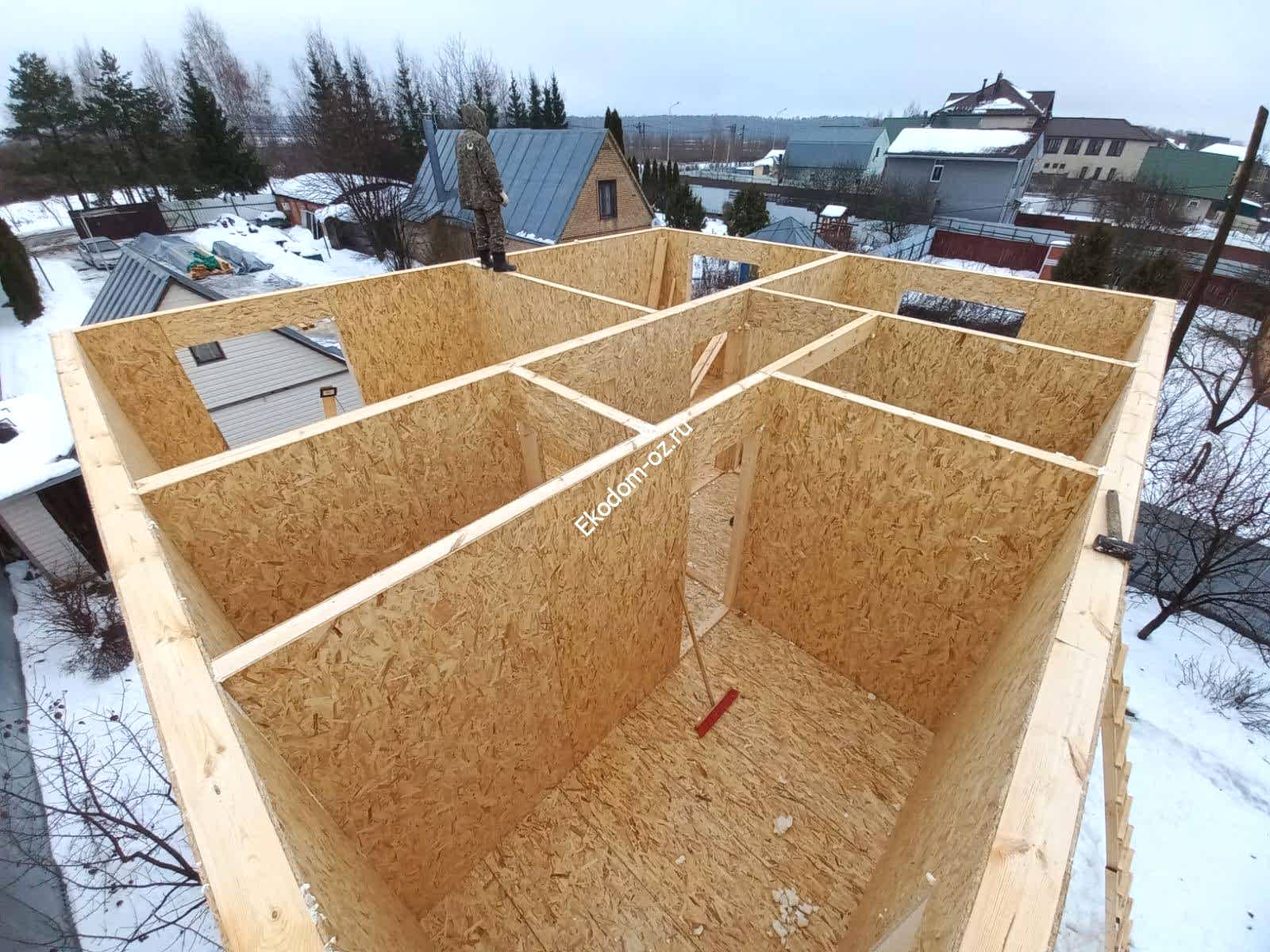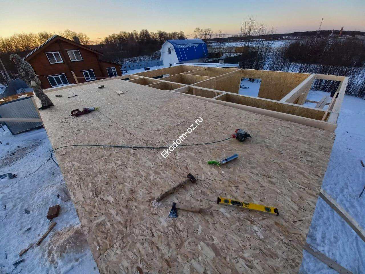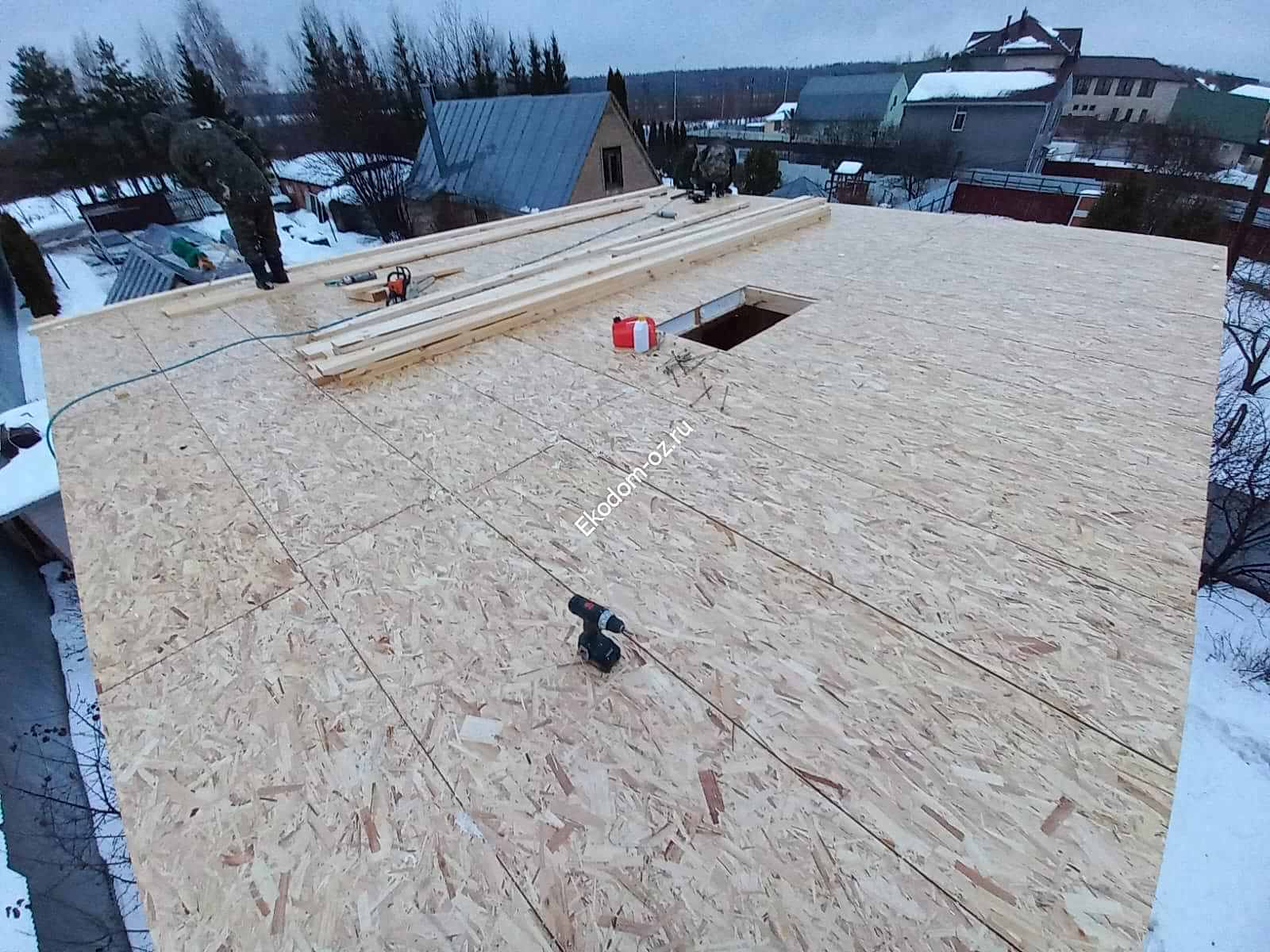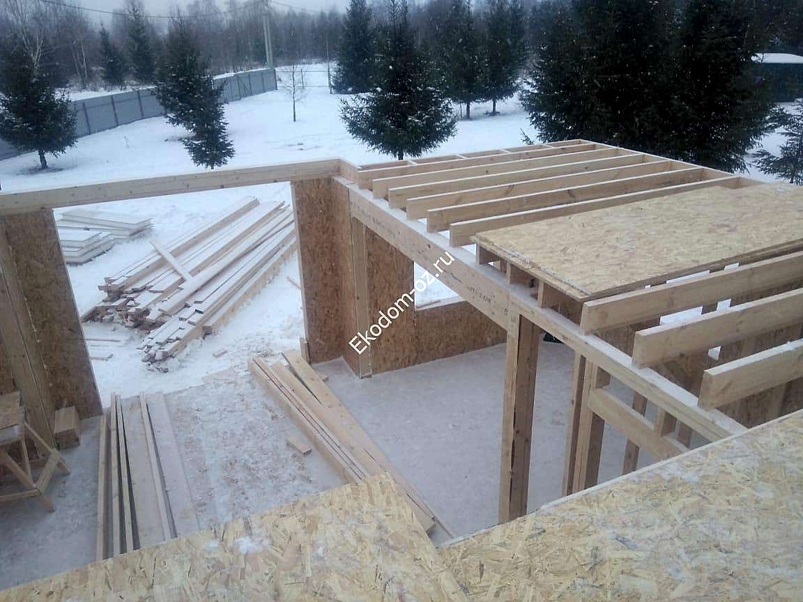 Дом с двумя полноценными этажами возвели за 14 дней. Строительство объекта из SIP панелей с использованием OSB «Калевала» происходило зимой в г. Орехово-Зуево. На фото можно увидеть конструкцию стропильной системы и обрешетки, монтаж цокольного перекрытия.
