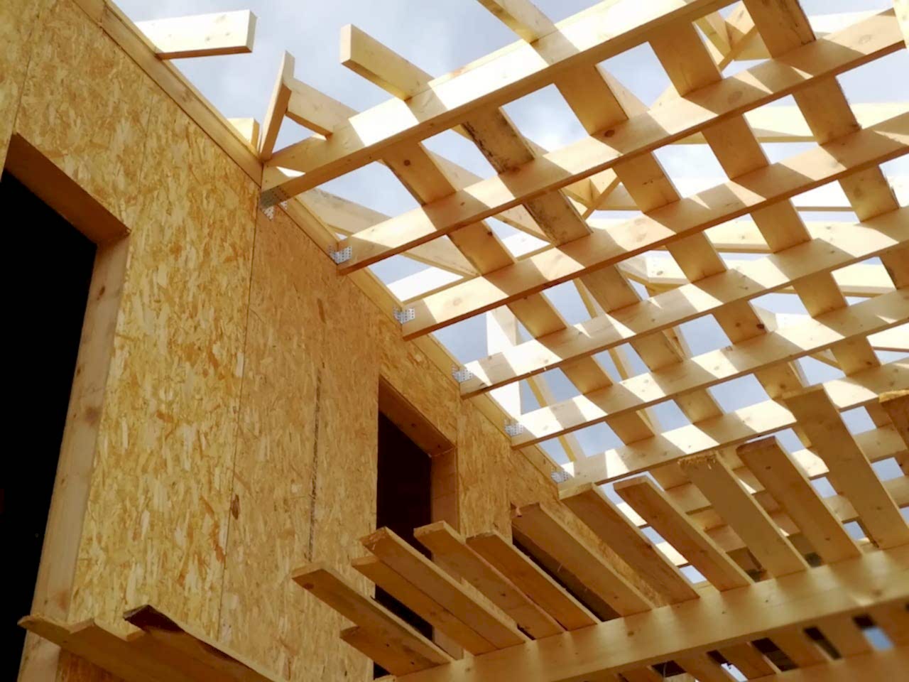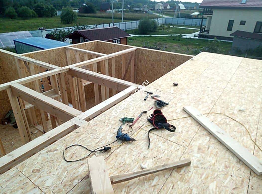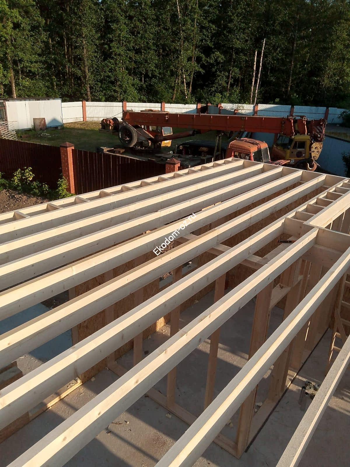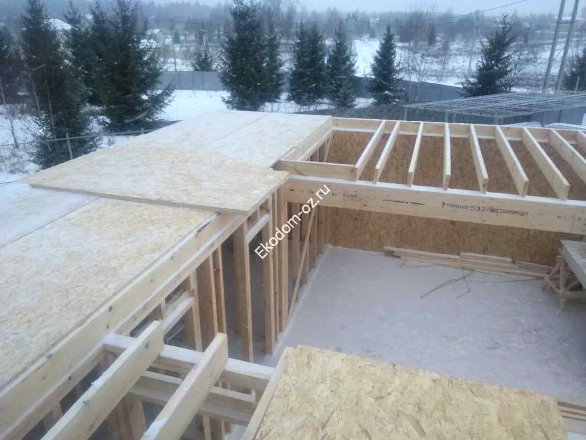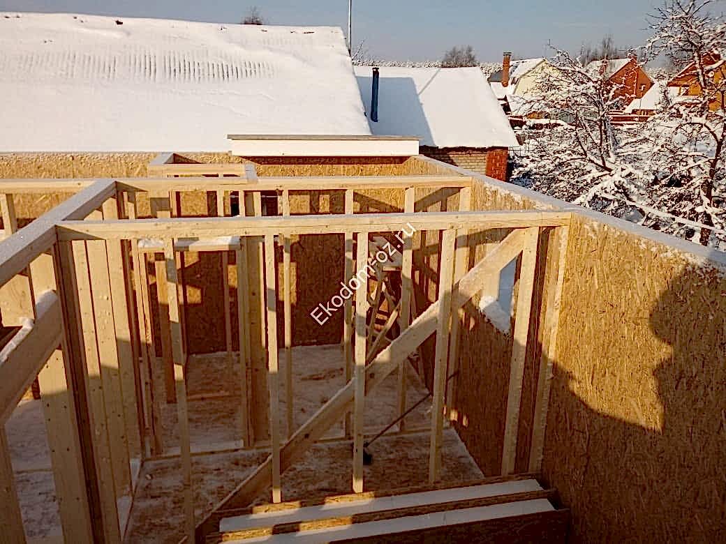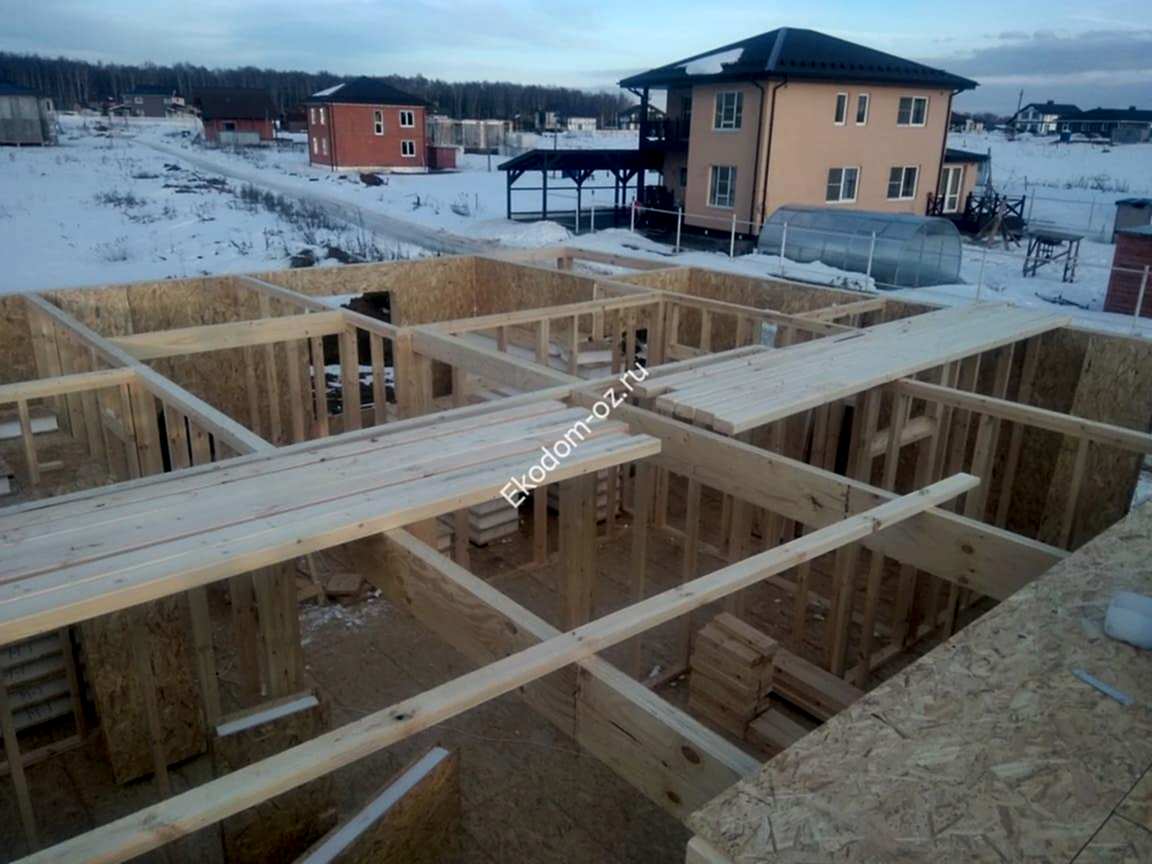 Дом с двумя полноценными этажами возвели за 14 дней. Строительство объекта из SIP панелей с использованием OSB «Калевала» происходило зимой в г. Орехово-Зуево. На фото можно увидеть конструкцию стропильной системы и обрешетки, монтаж цокольного перекрытия.