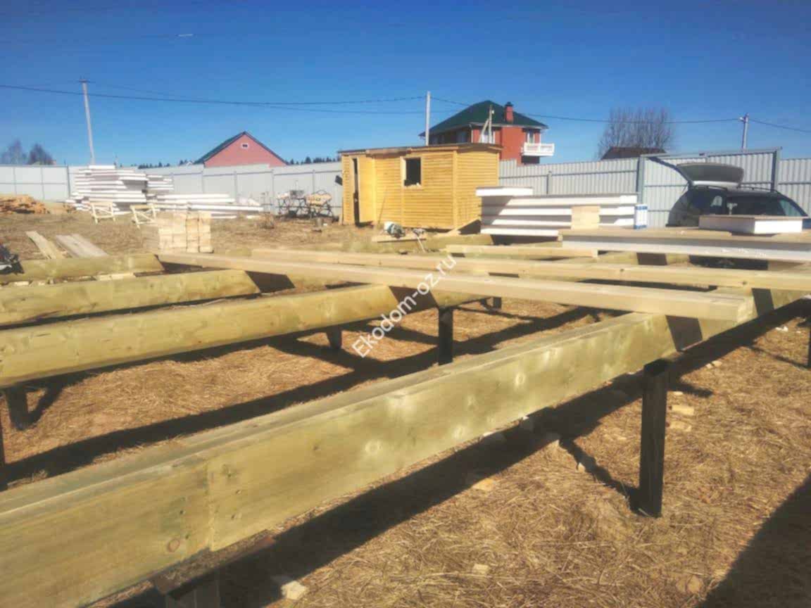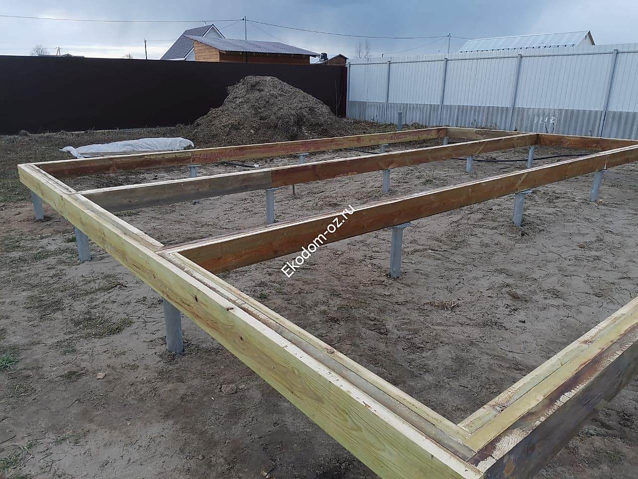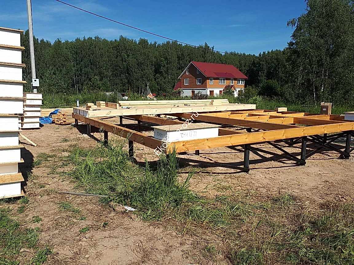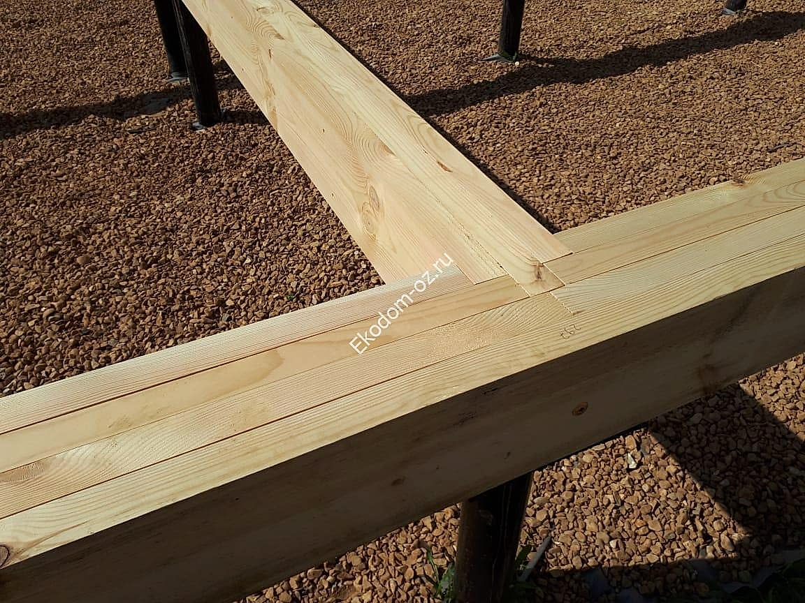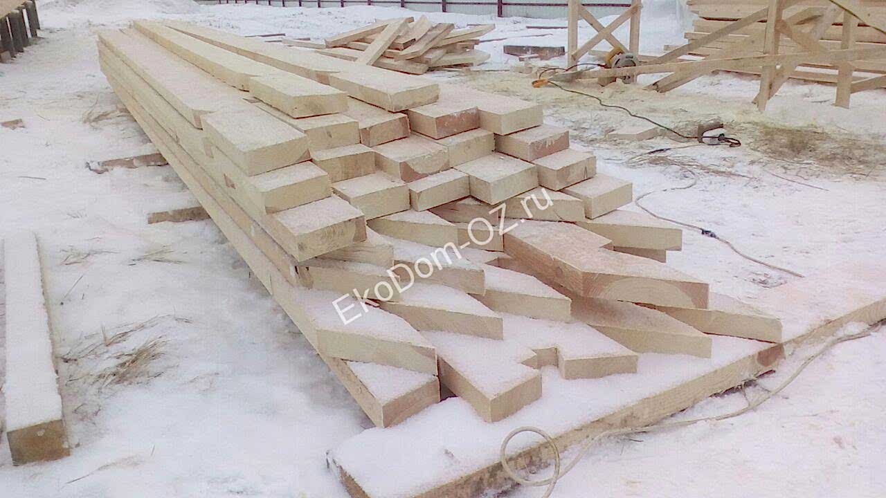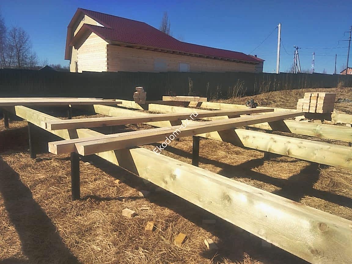 - Фундамент:ЖБ сваи 150х150х3000, оголовки 200х200 мм, цементирование ствола, обрезка в уровень, установка оголовков, обвязка свай пиломатериалом 200х150 мм (сшита из досок 47х197 мм) с антисептированием.