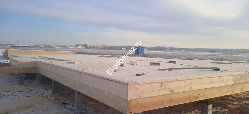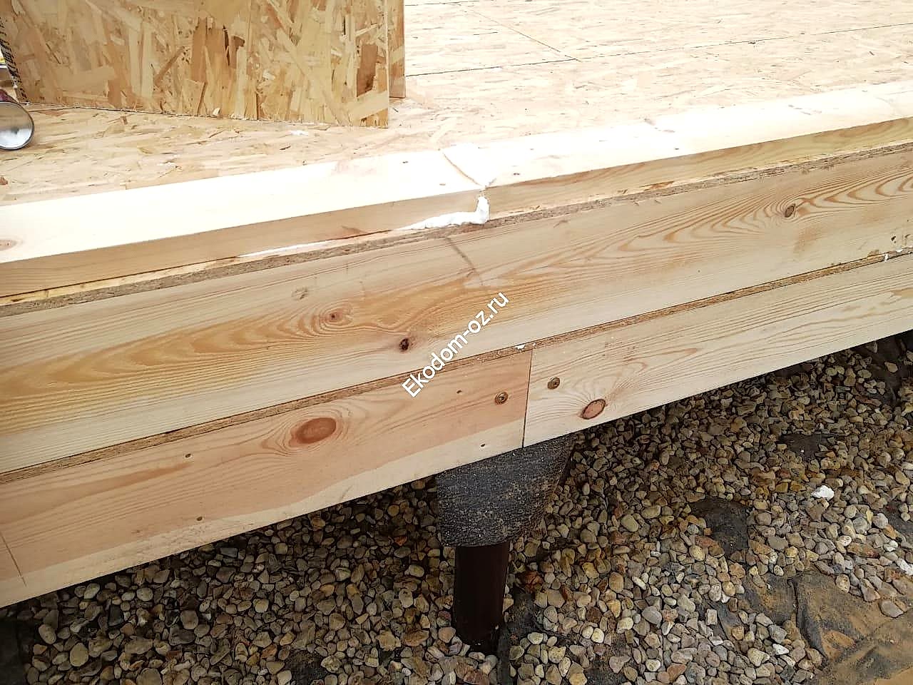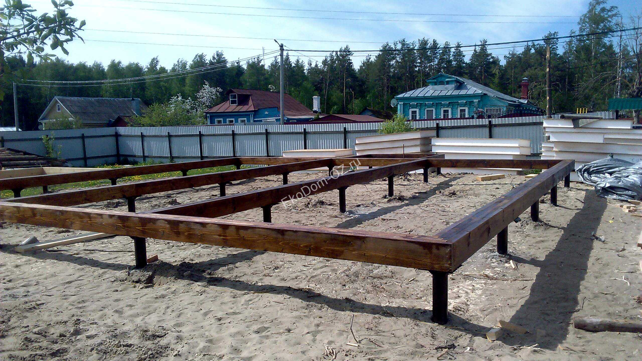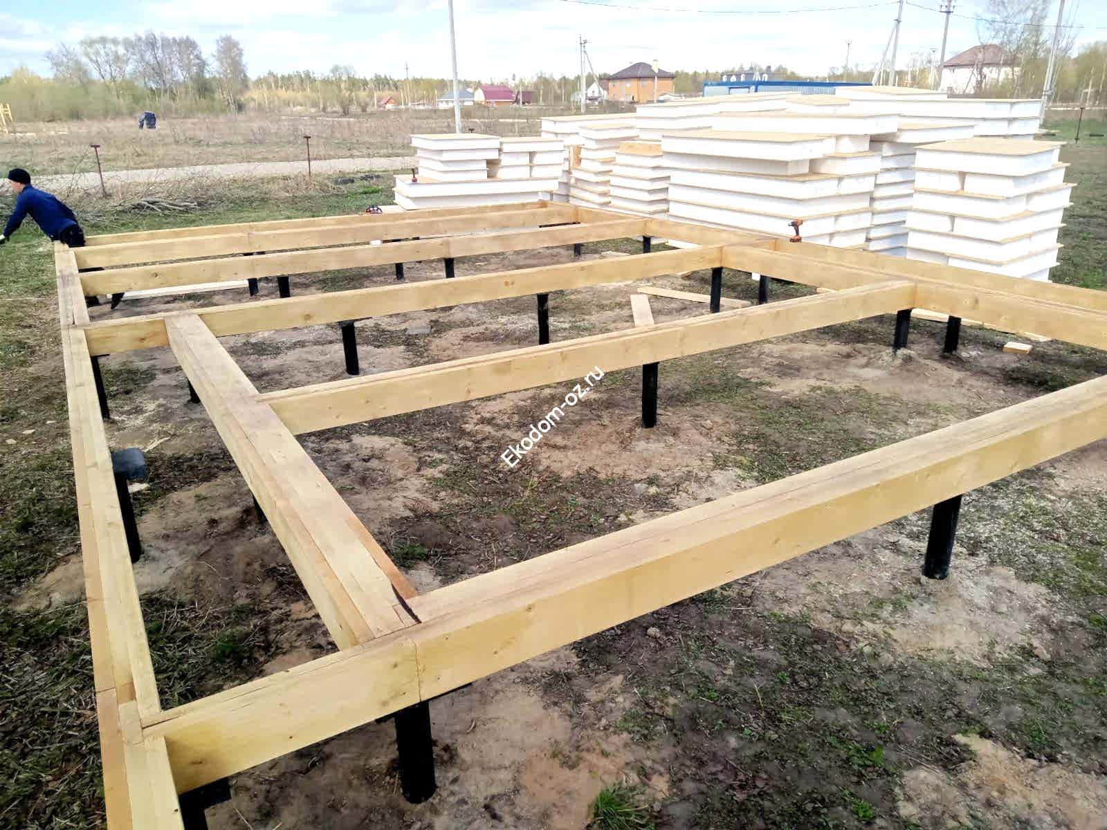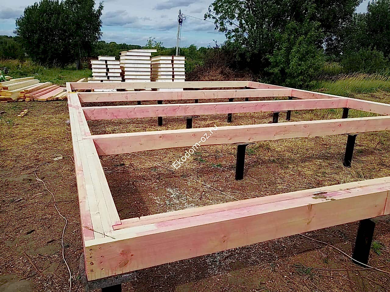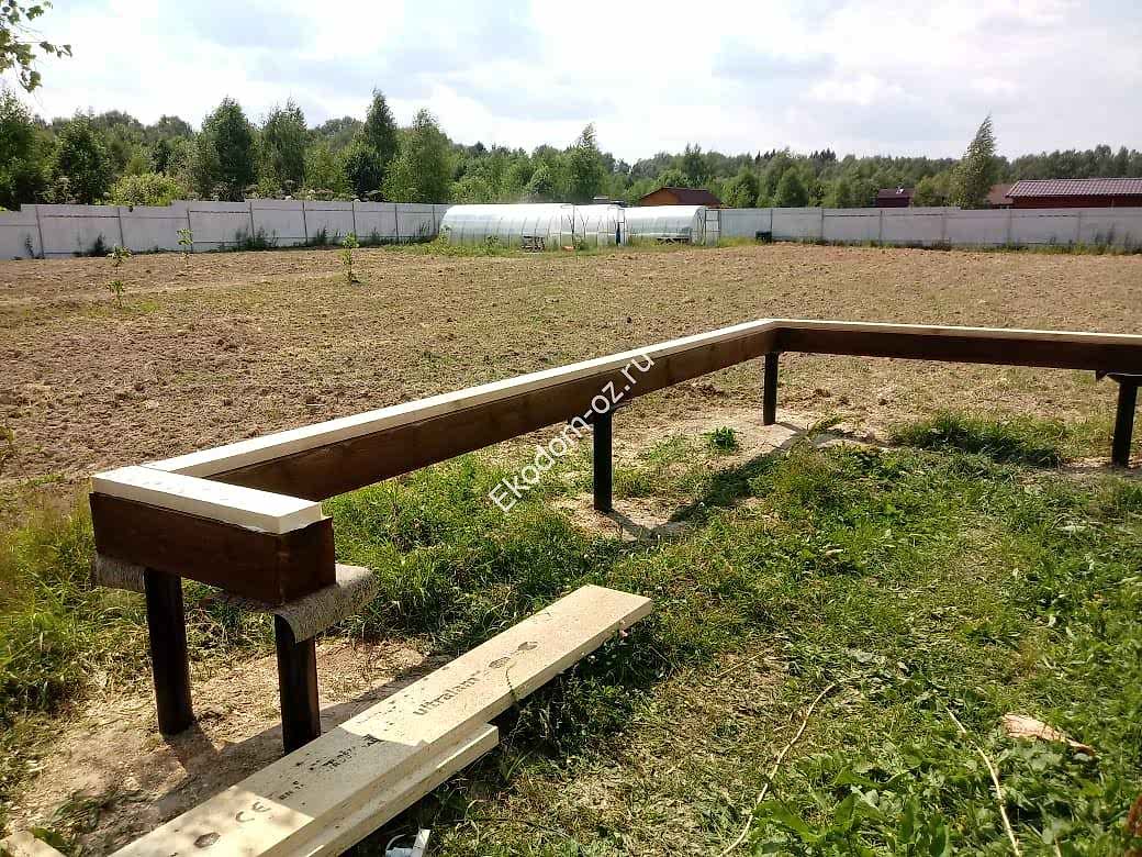 - Фундамент:ЖБ сваи 150х150х3000, оголовки 200х200 мм, цементирование ствола, обрезка в уровень, установка оголовков, обвязка свай пиломатериалом 200х150 мм (сшита из досок 47х197 мм) с антисептированием.