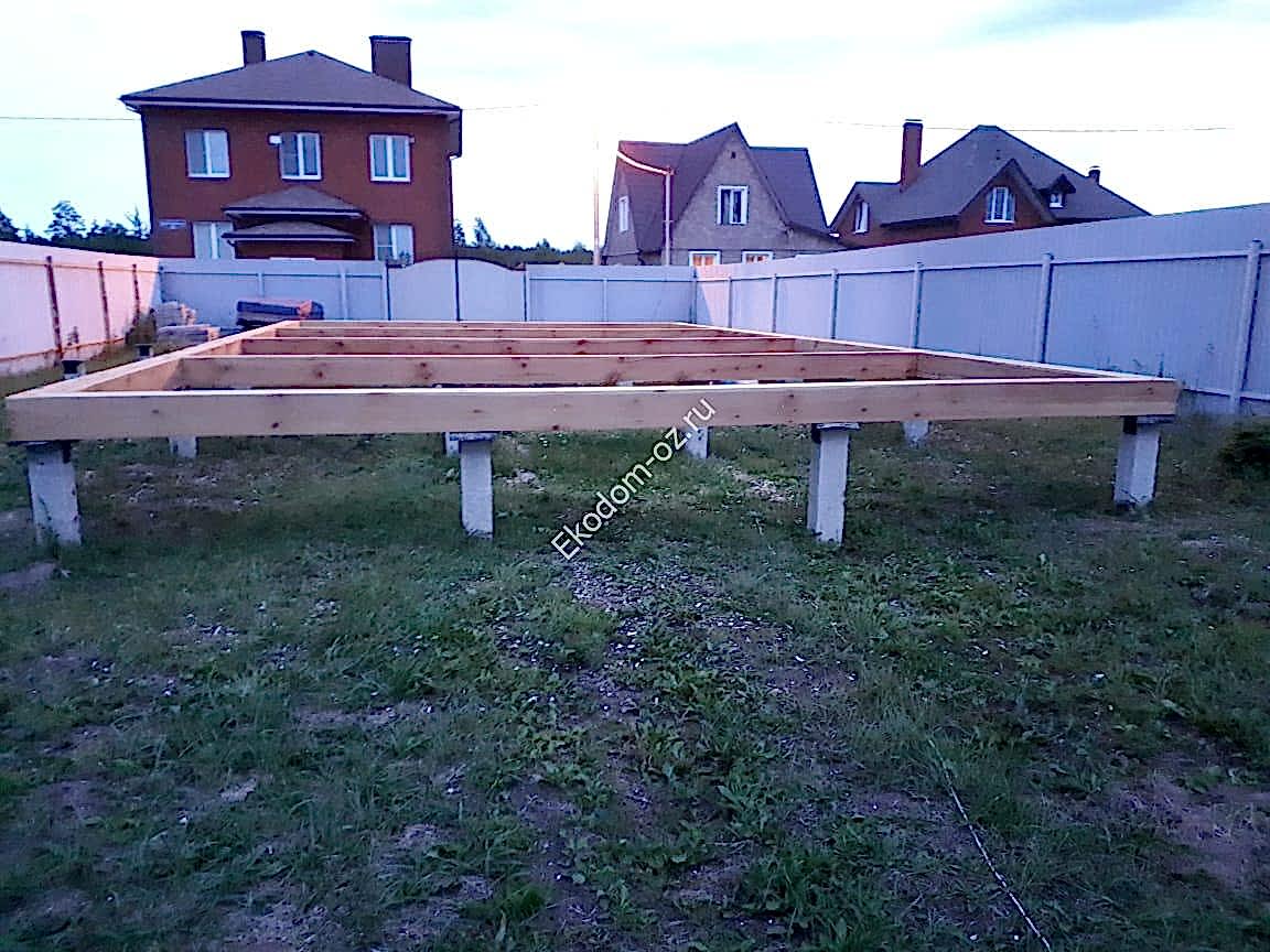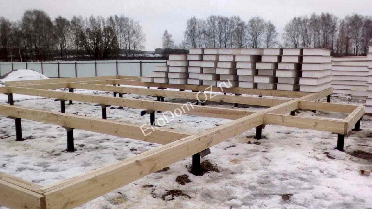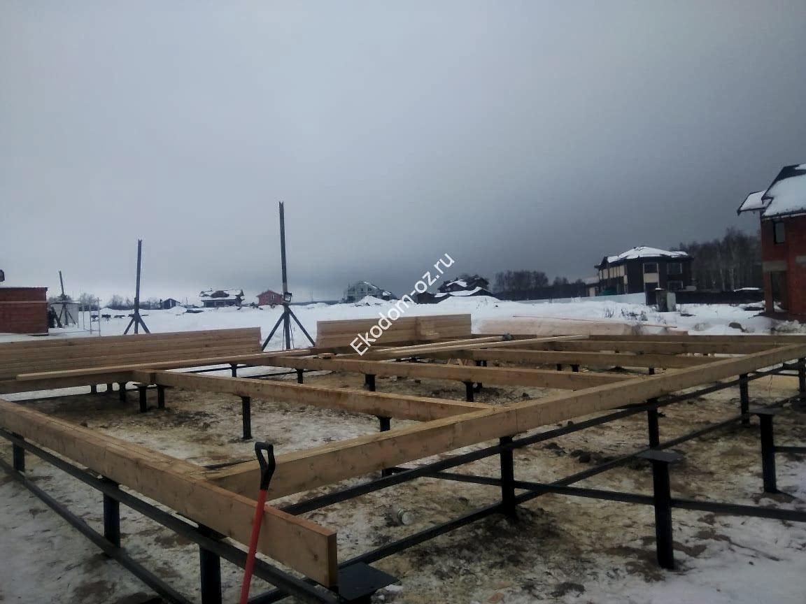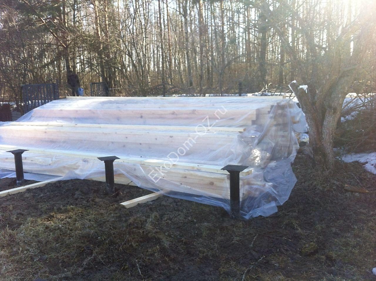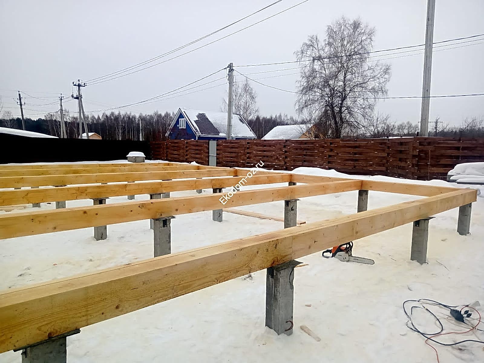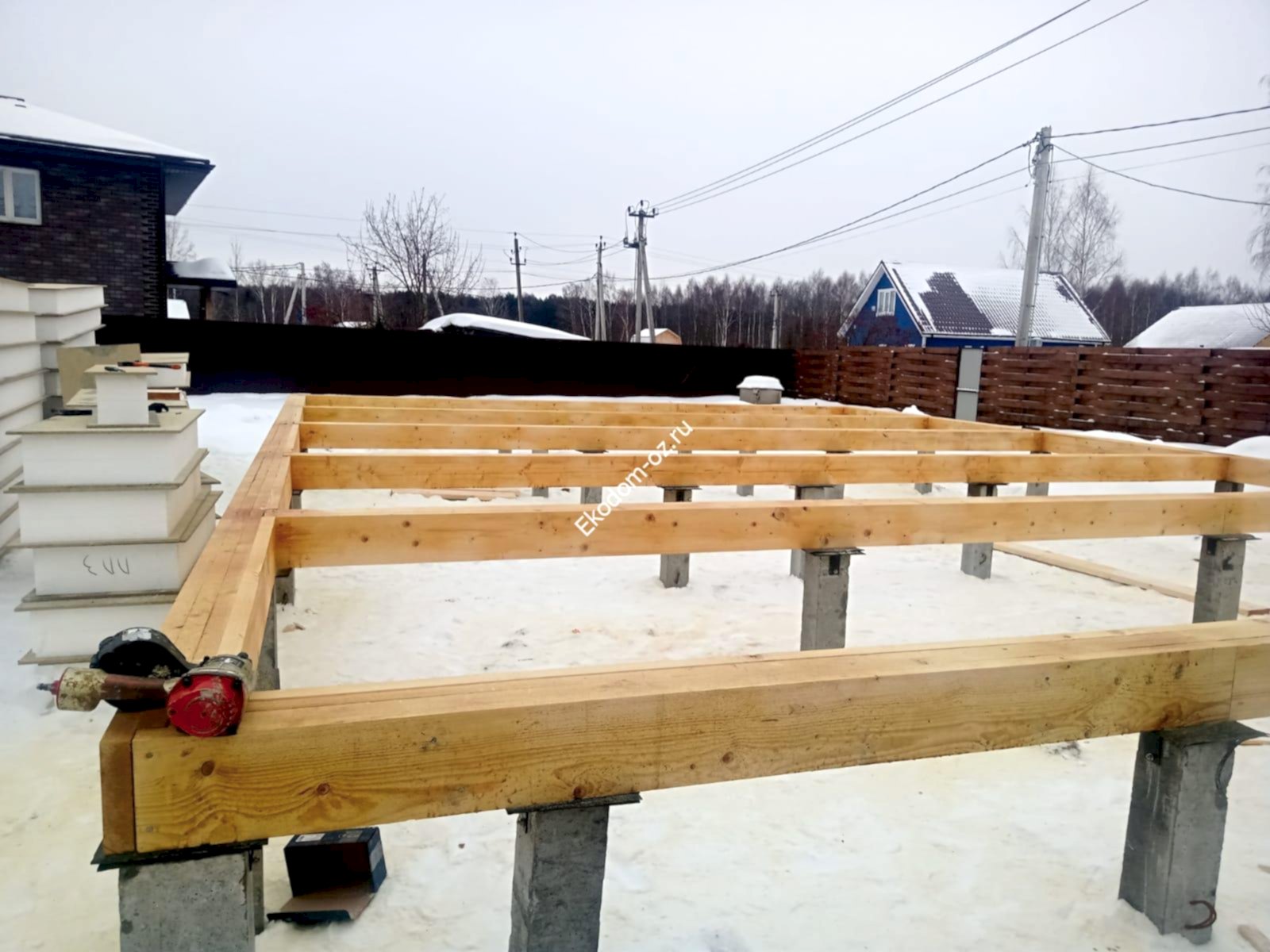 - Фундамент:ЖБ сваи 150х150х3000, оголовки 200х200 мм, цементирование ствола, обрезка в уровень, установка оголовков, обвязка свай пиломатериалом 200х150 мм (сшита из досок 47х197 мм) с антисептированием.