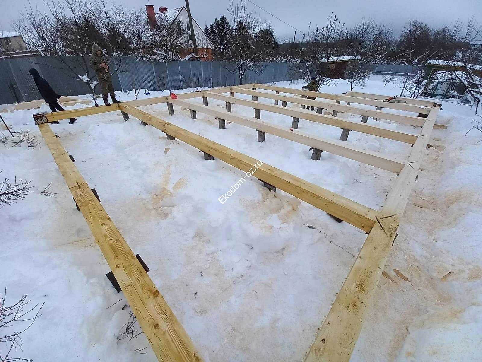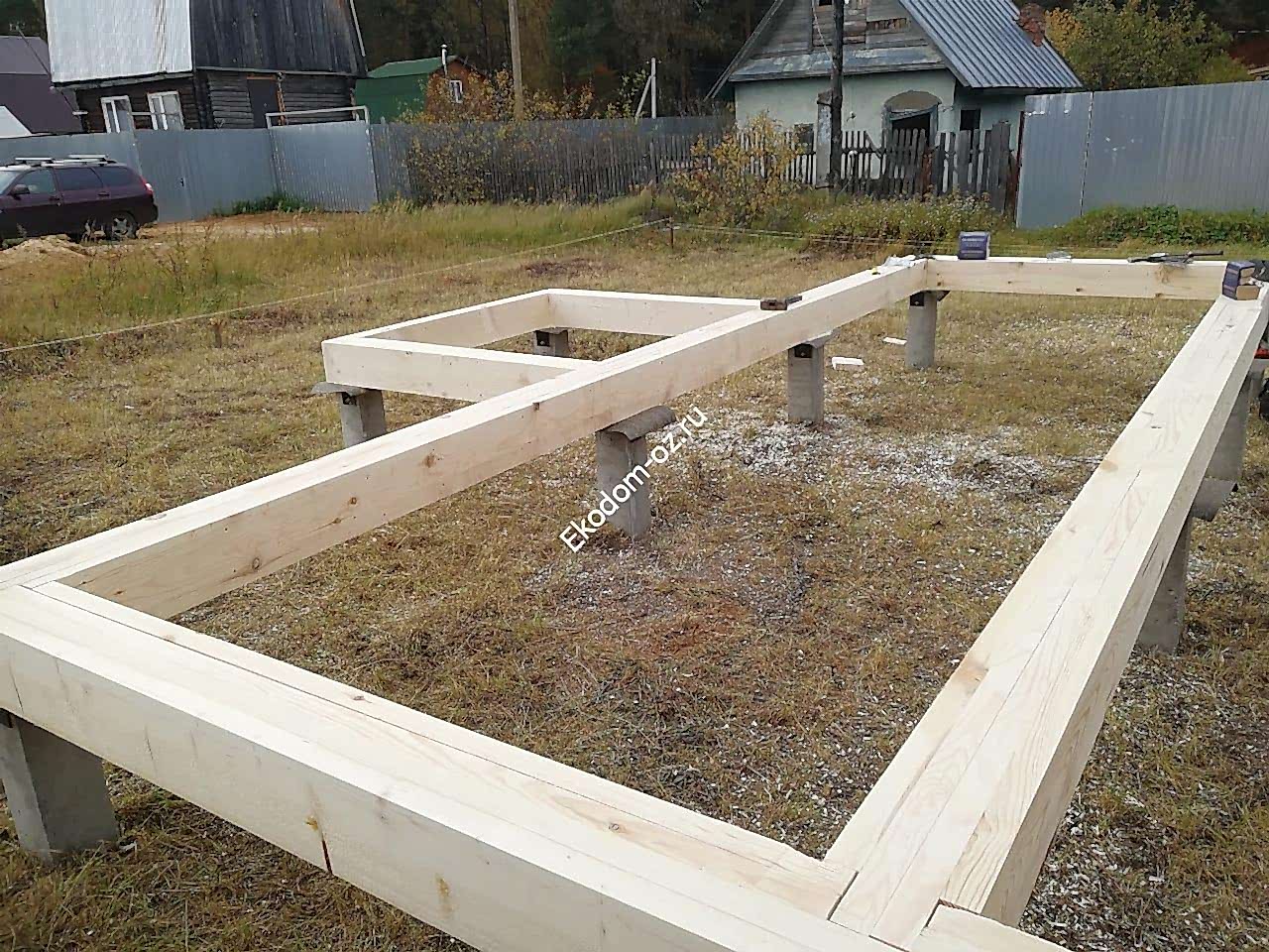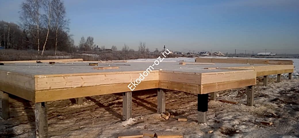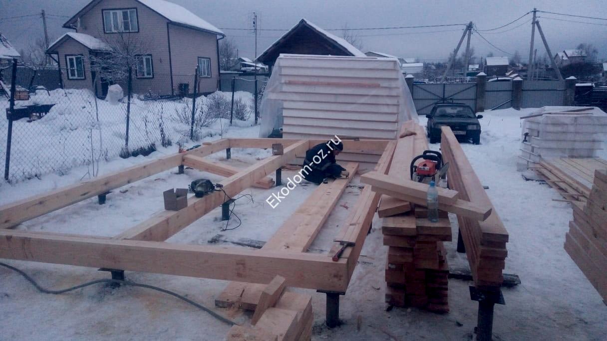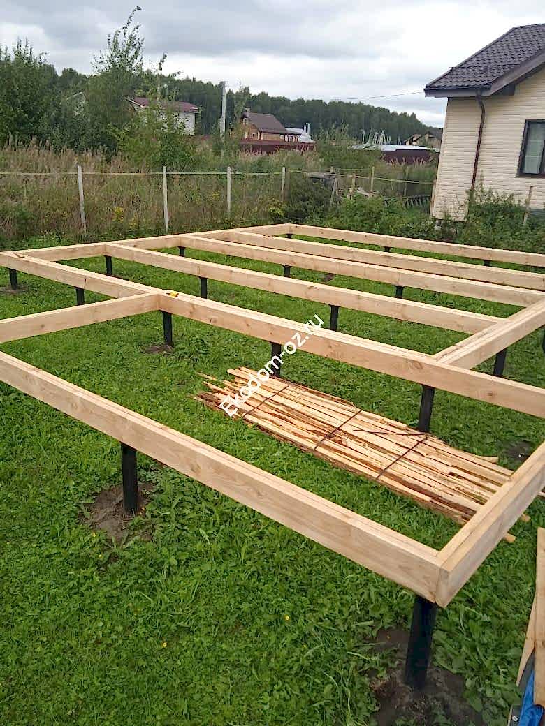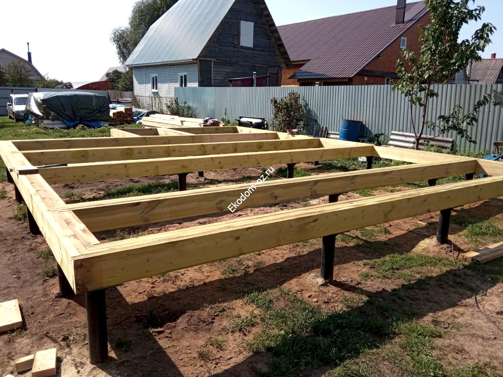 - Фундамент:ЖБ сваи 150х150х3000, оголовки 200х200 мм, цементирование ствола, обрезка в уровень, установка оголовков, обвязка свай пиломатериалом 200х150 мм (сшита из досок 47х197 мм) с антисептированием.