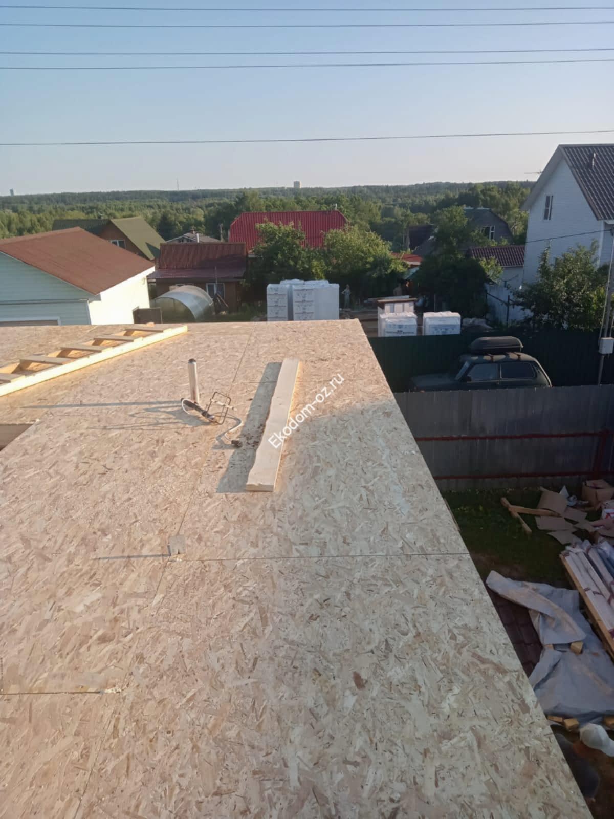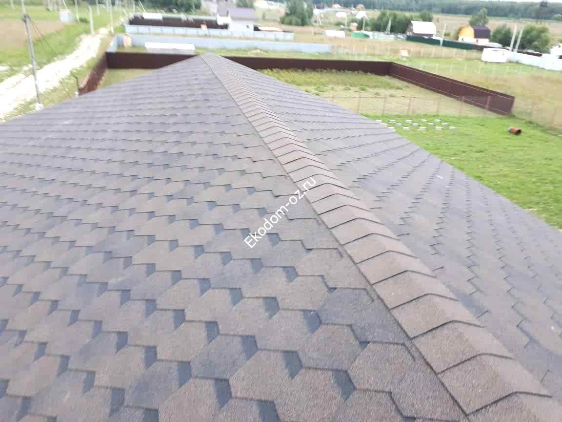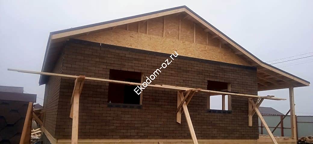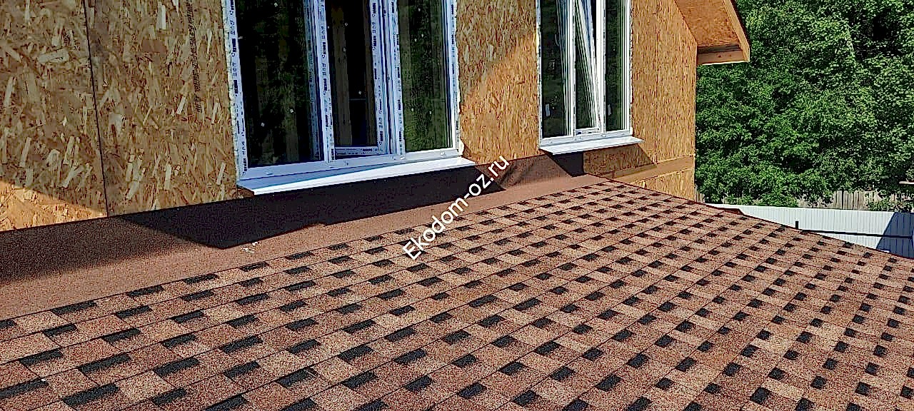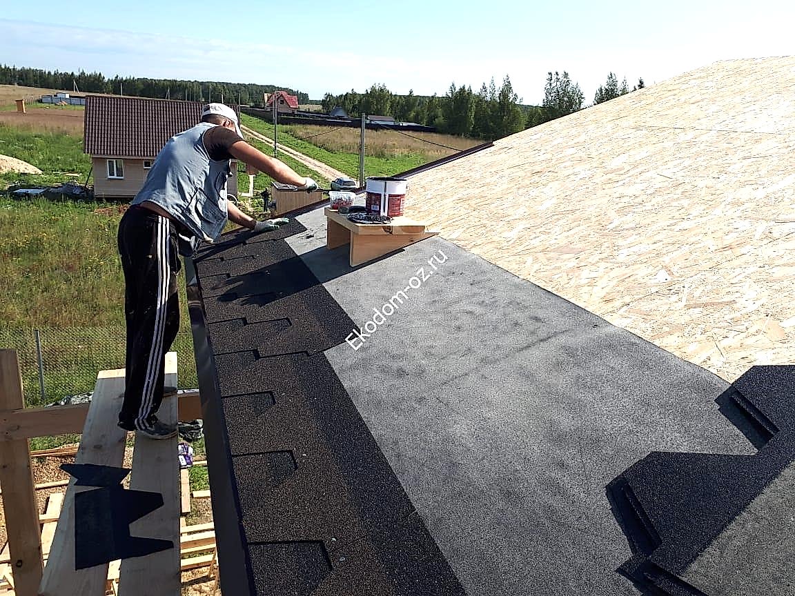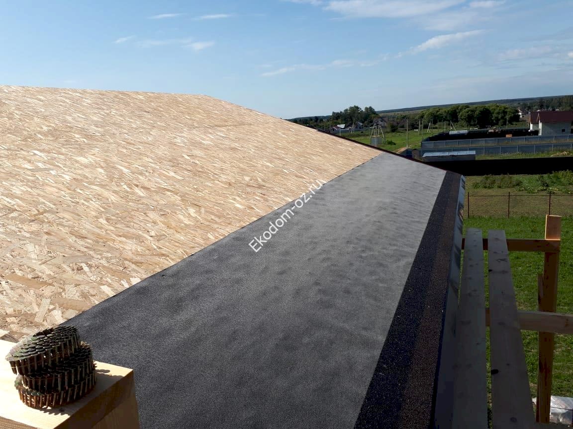 - Кровля:стропильная система, двухскатная, покрытие: качественная гибкая Пин Ап шинглас серия: Ранчо ОСП на фронтоны и для укладки кровельного покрытия.