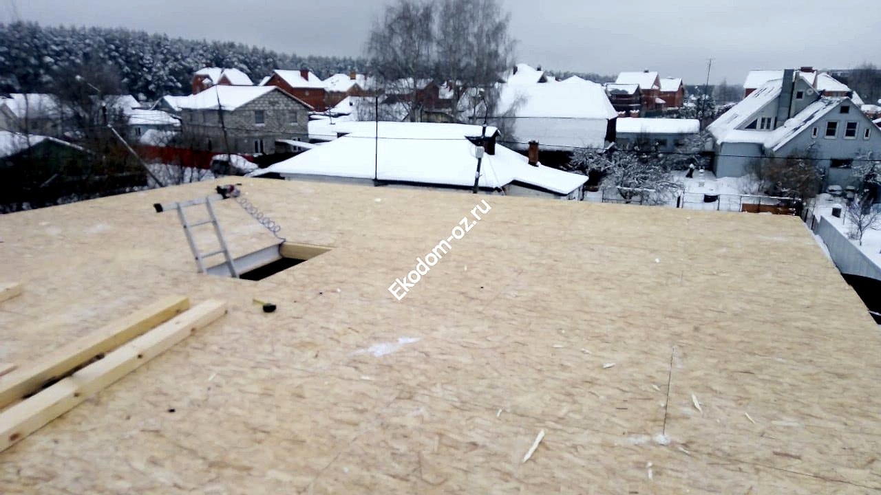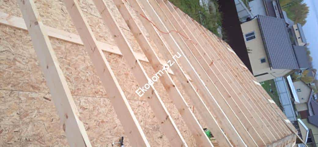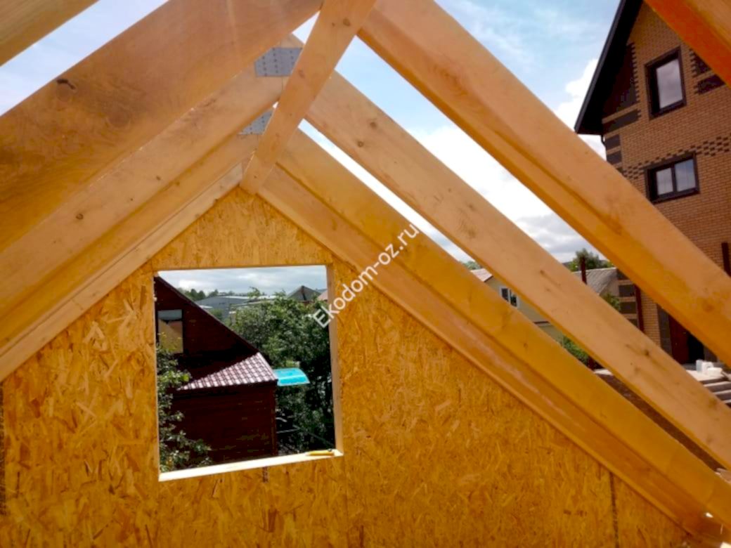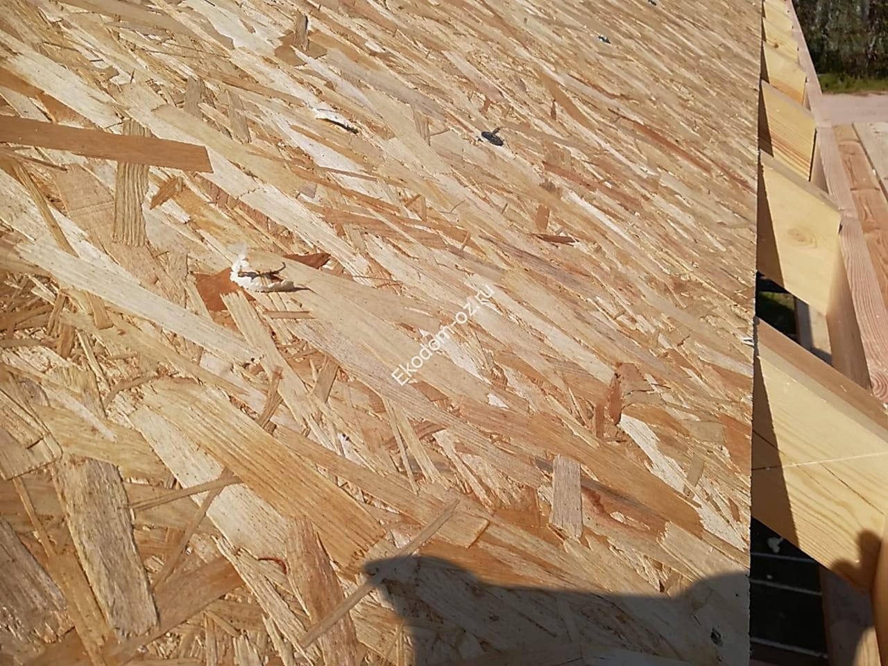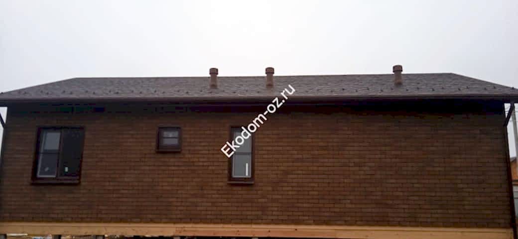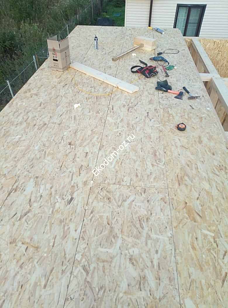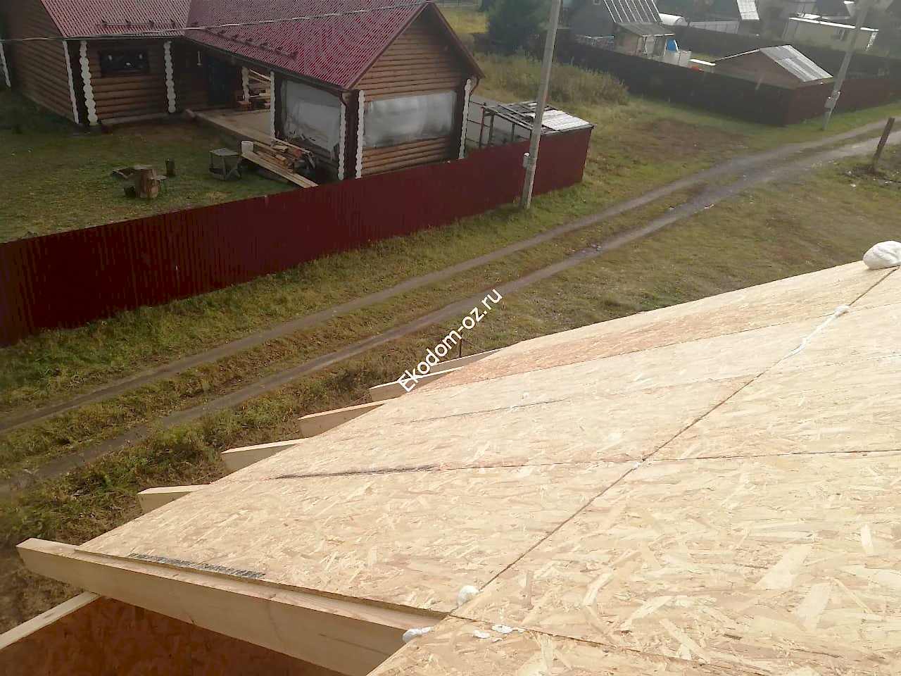 - Кровля:стропильная система, двухскатная, покрытие: качественная гибкая Пин Ап шинглас серия: Ранчо ОСП на фронтоны и для укладки кровельного покрытия.