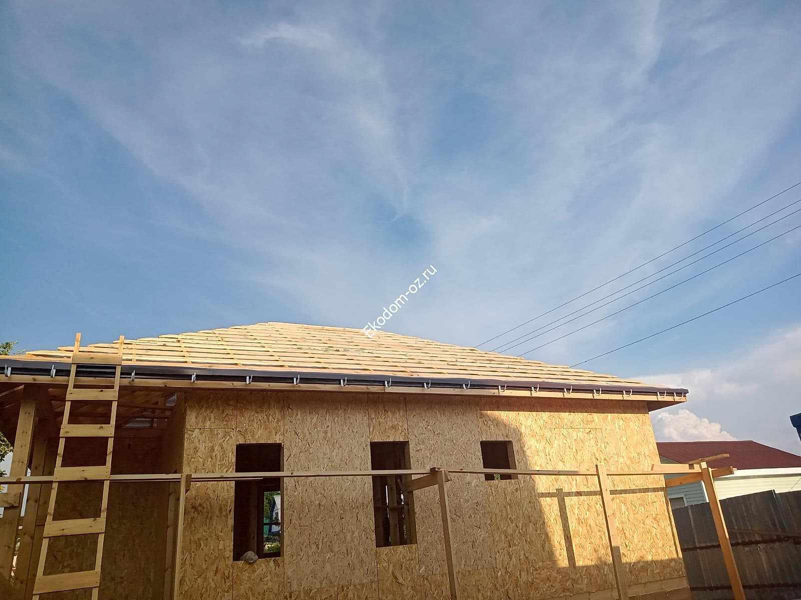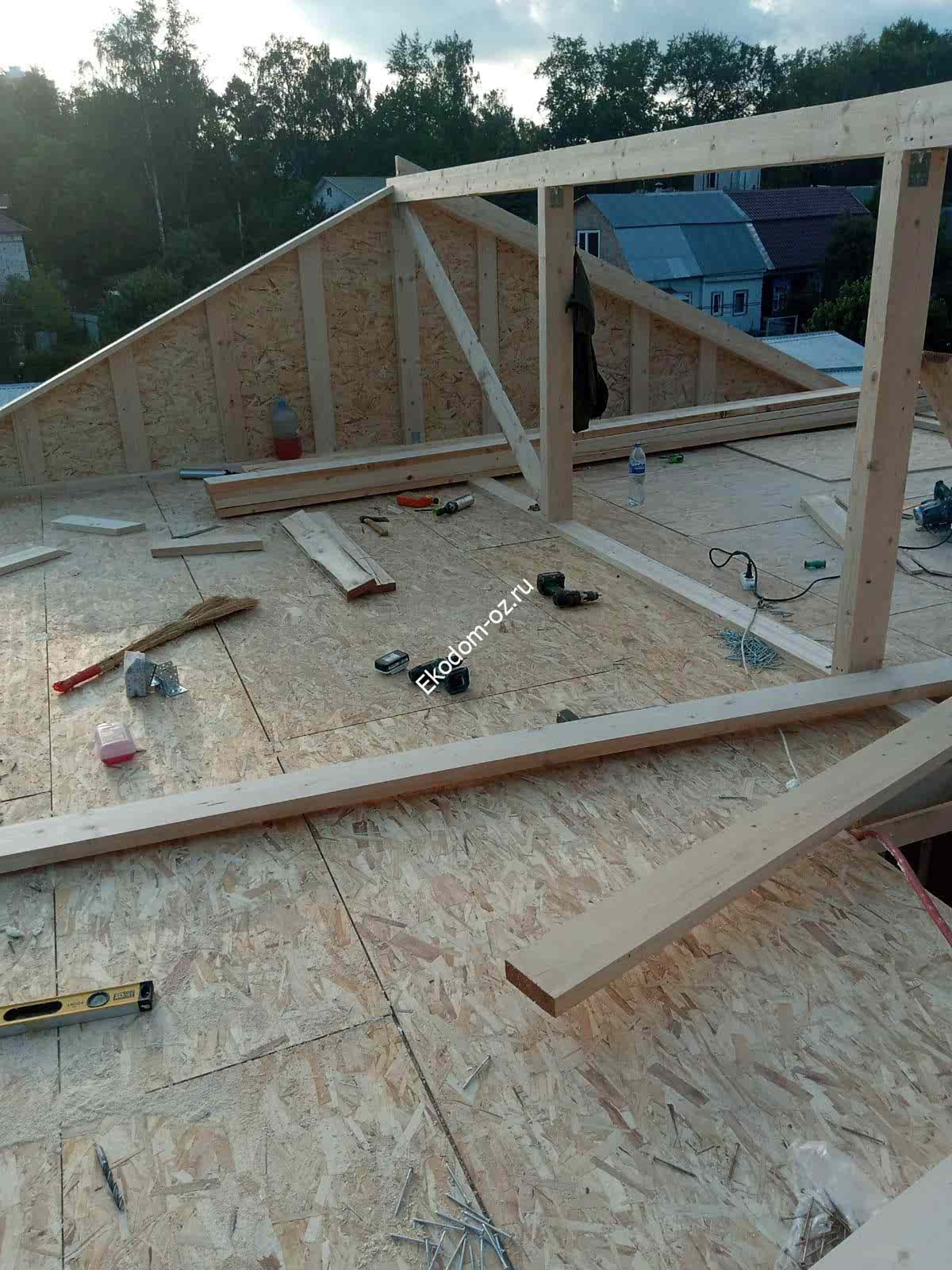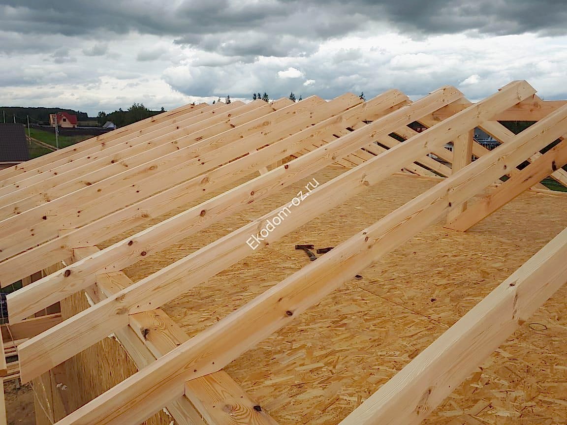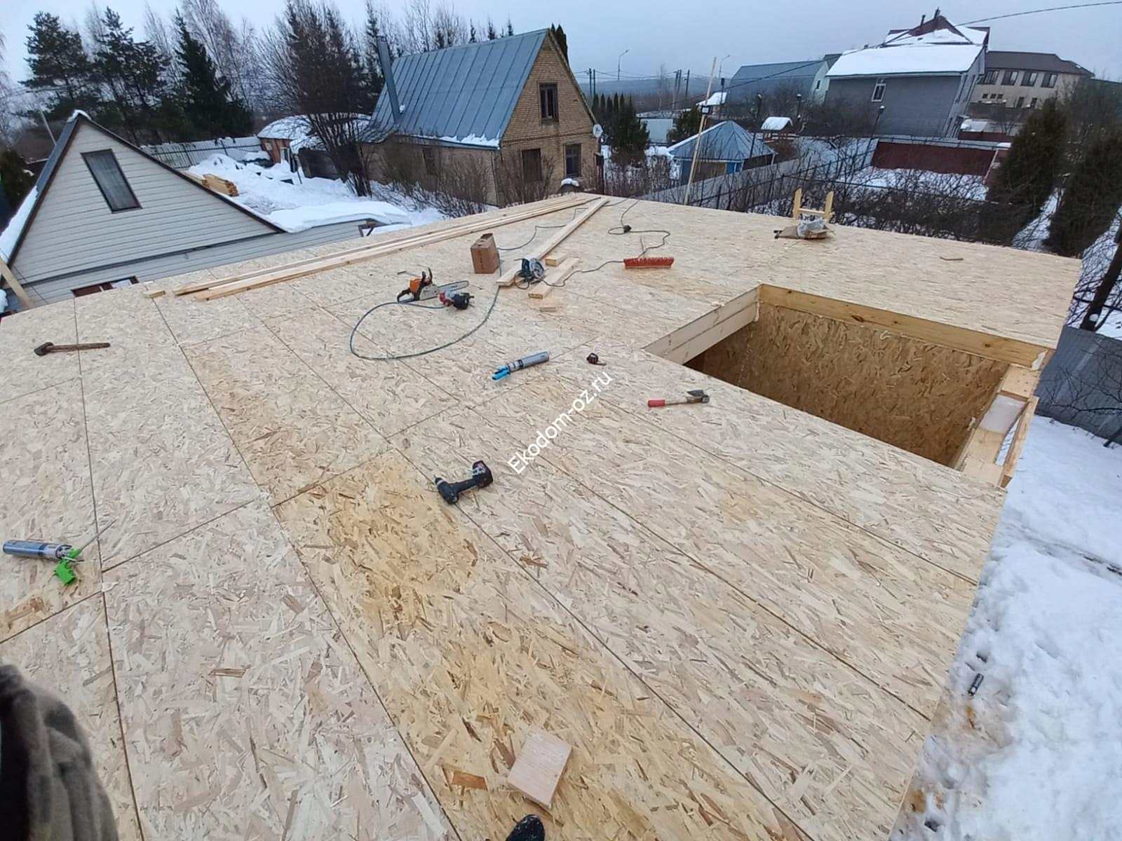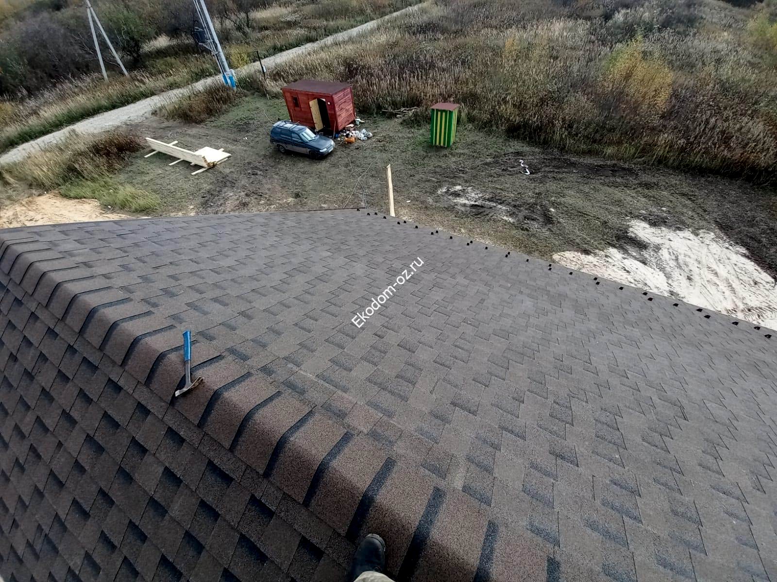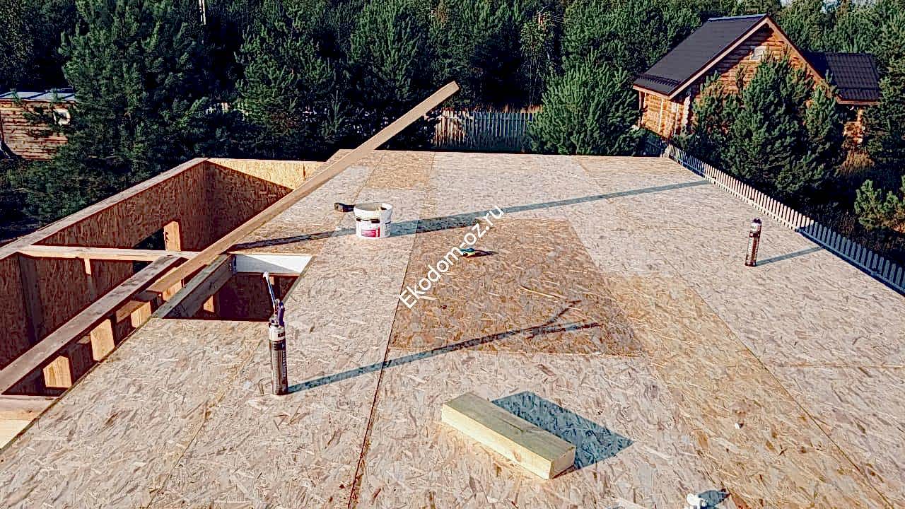 - Кровля:стропильная система, двухскатная, покрытие: качественная гибкая Пин Ап шинглас серия: Ранчо ОСП на фронтоны и для укладки кровельного покрытия.
