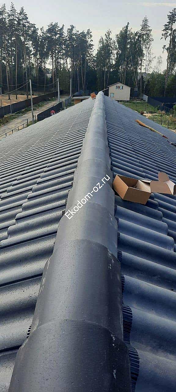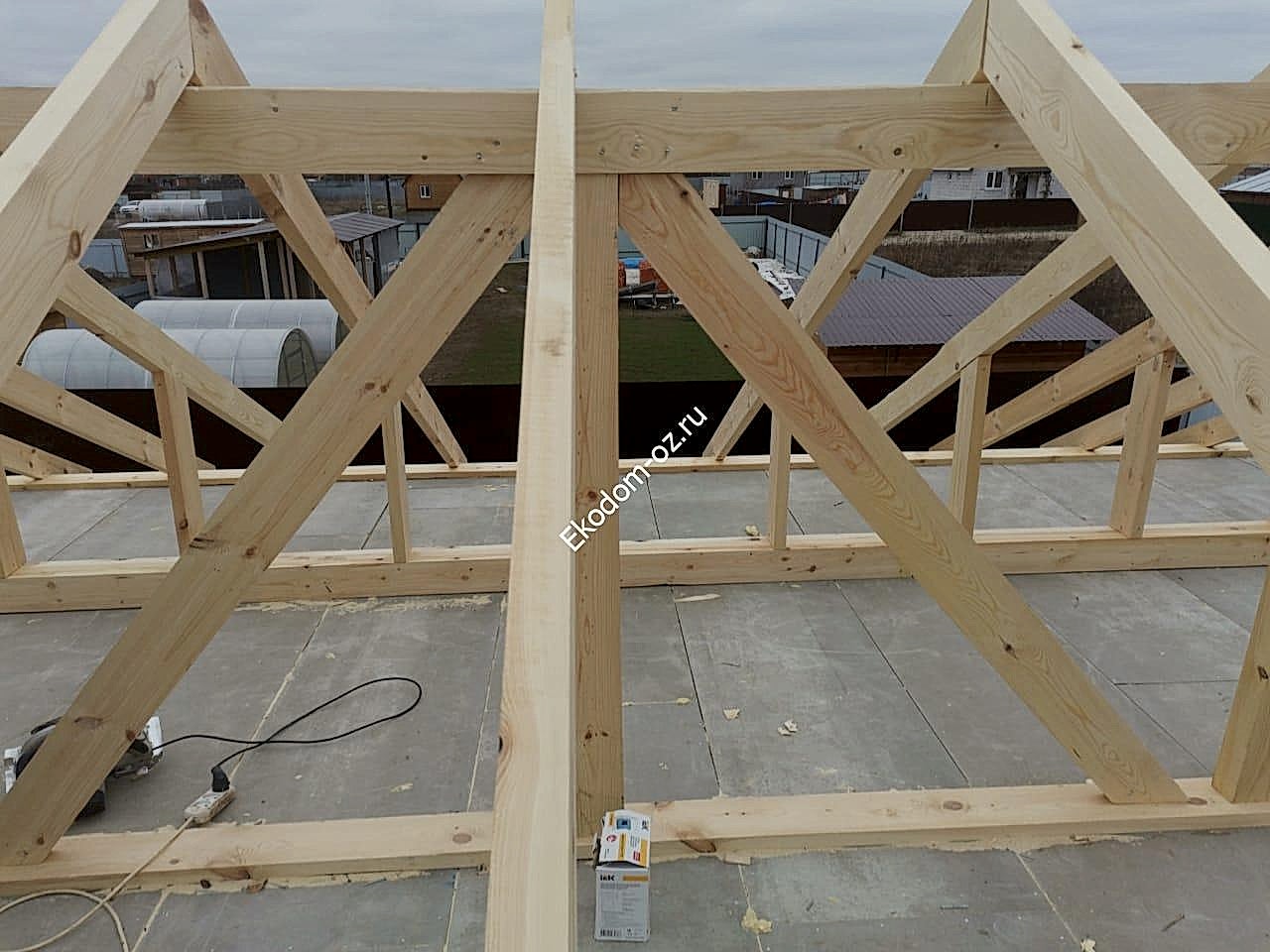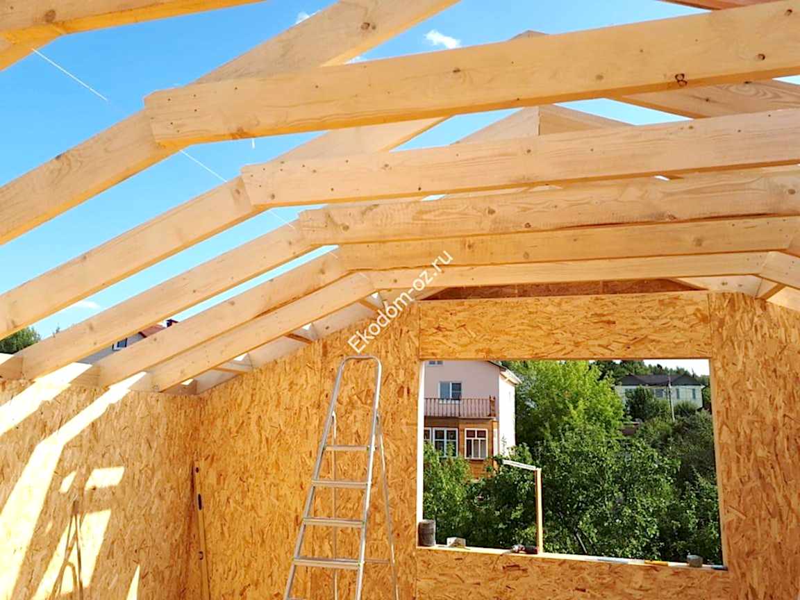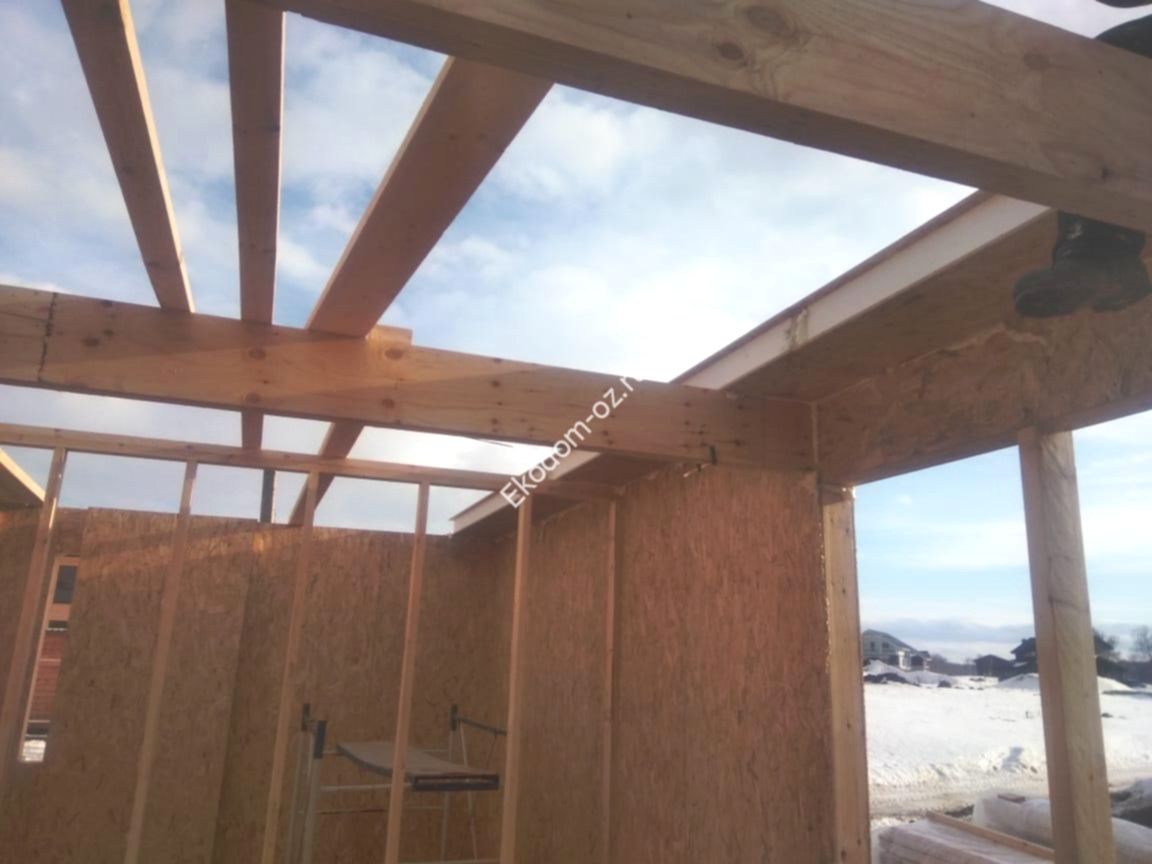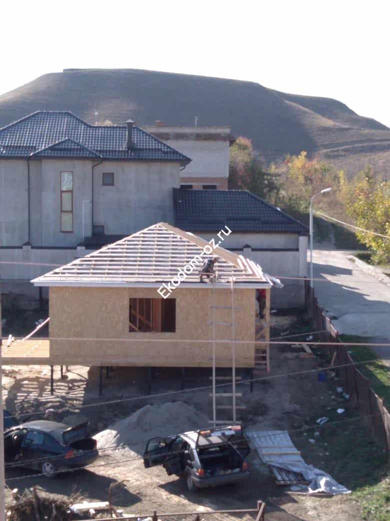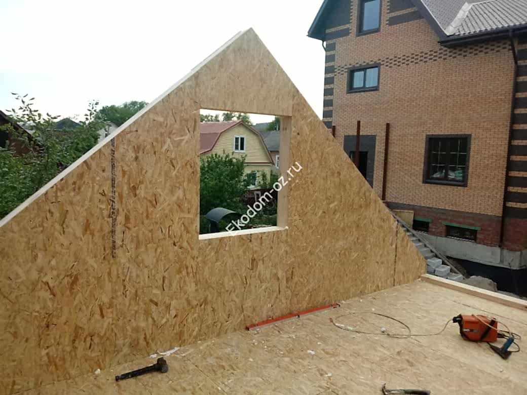 - Кровля:стропильная система, двухскатная, покрытие: качественная гибкая Пин Ап шинглас серия: Ранчо ОСП на фронтоны и для укладки кровельного покрытия.