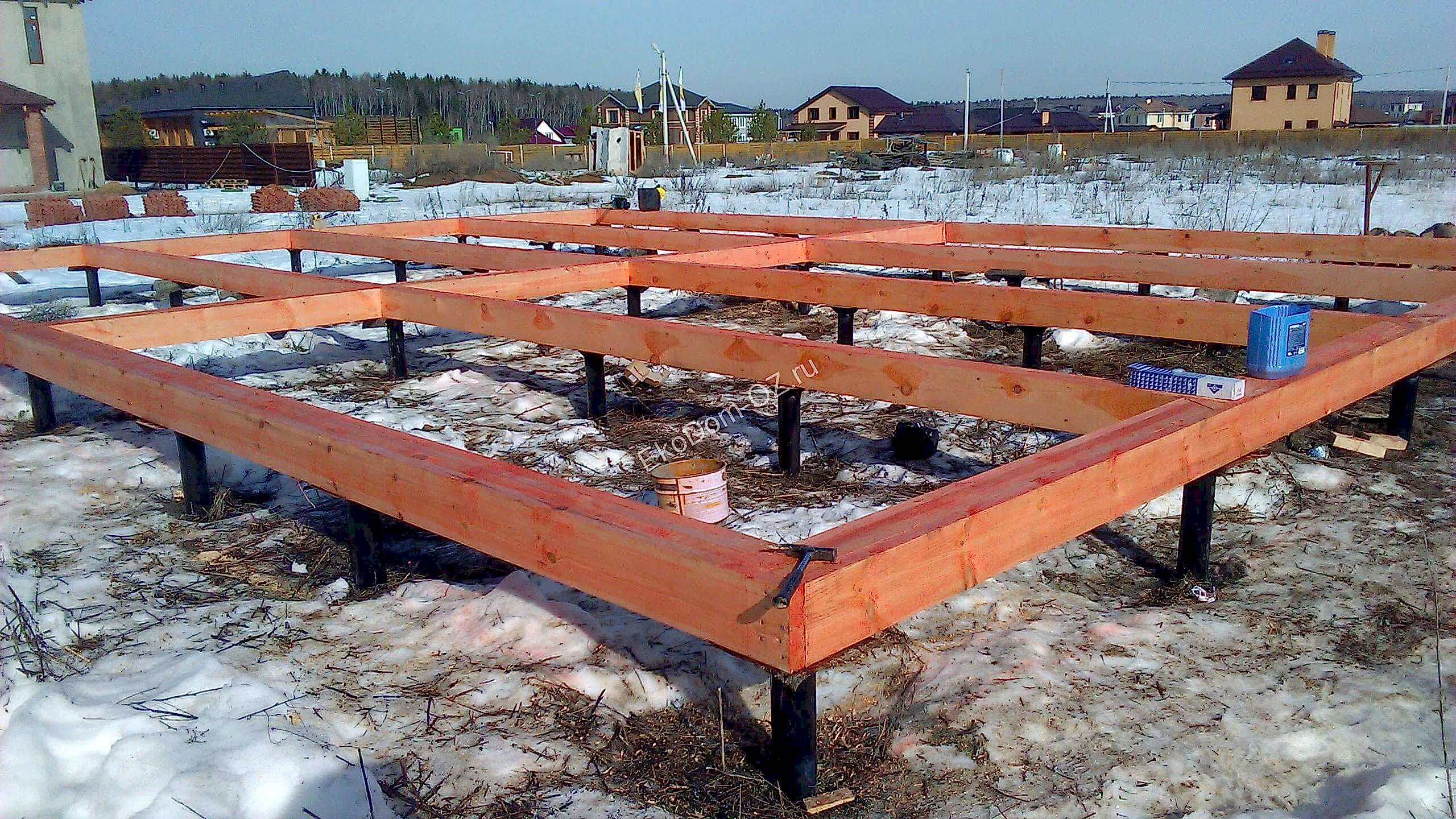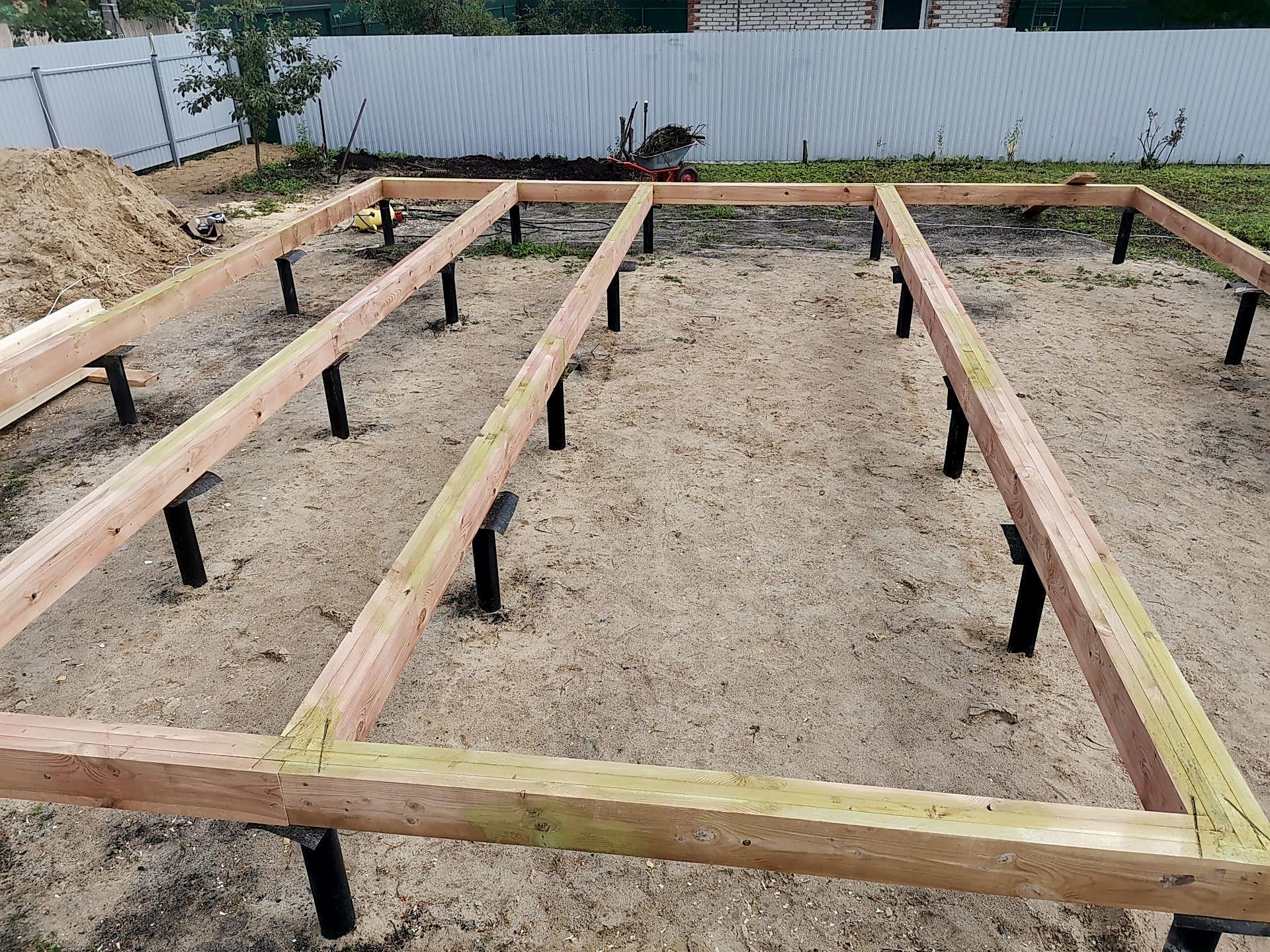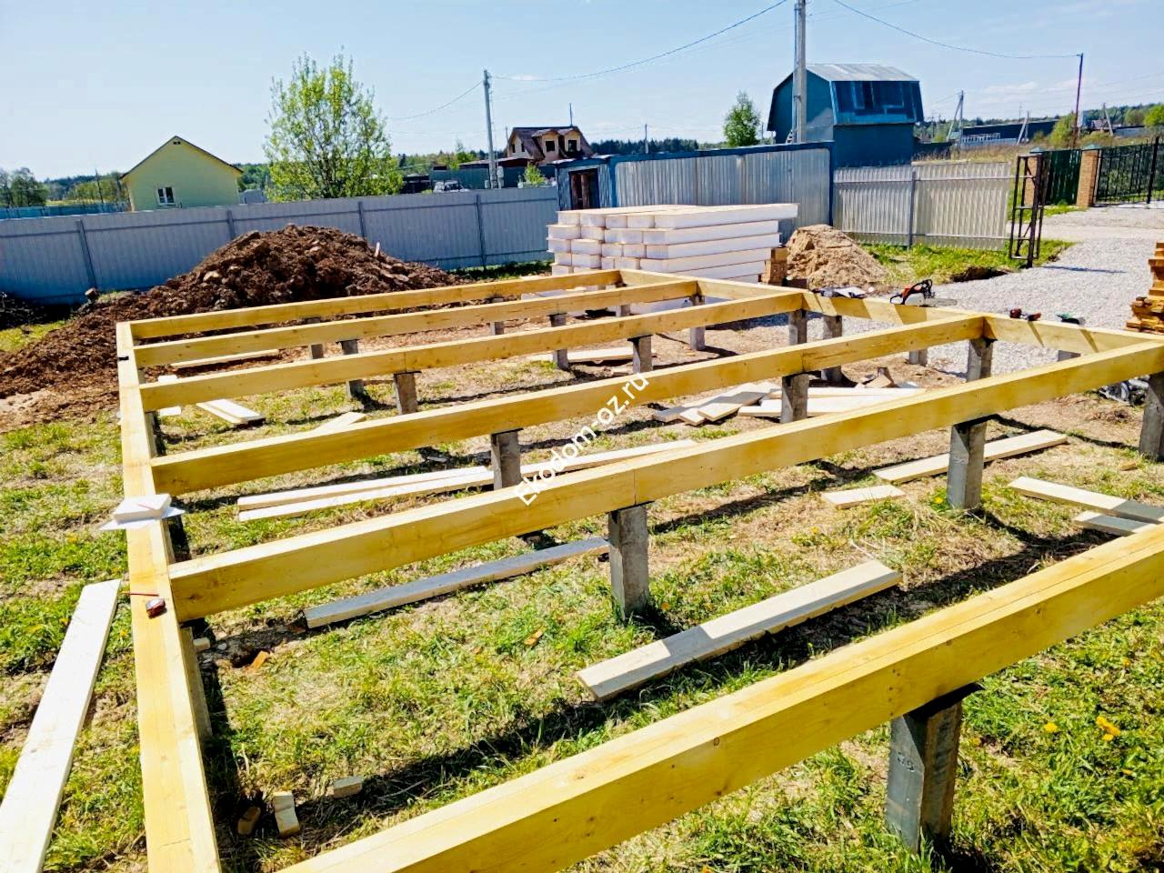- ФундаментЖБ сваи 150х150х3000, оголовки 250х250 мм, цементирование ствола, обрезка в уровень, установка оголовков, обвязка свай пиломатериалом 200х200 мм (сшита из досок Пин Ап мм) с антисептированием.