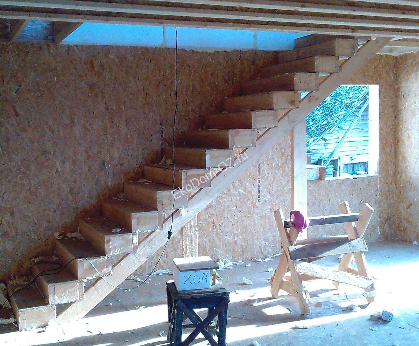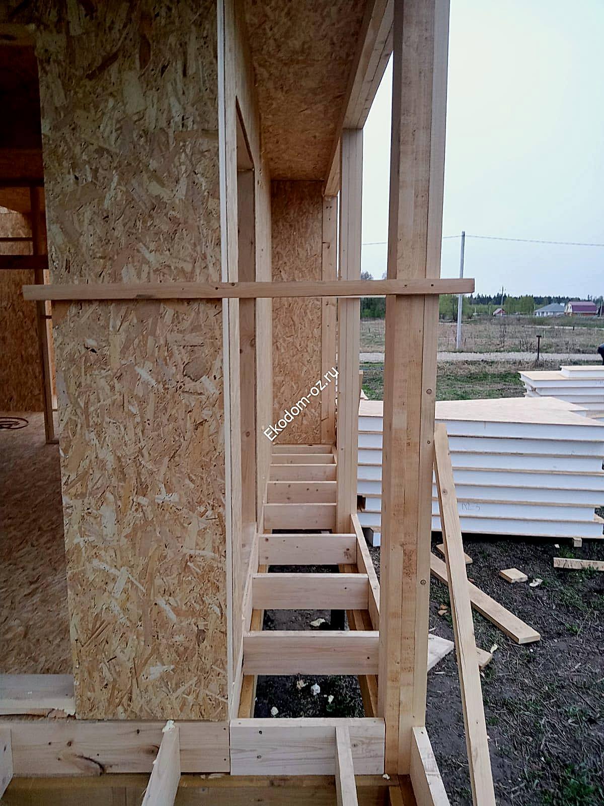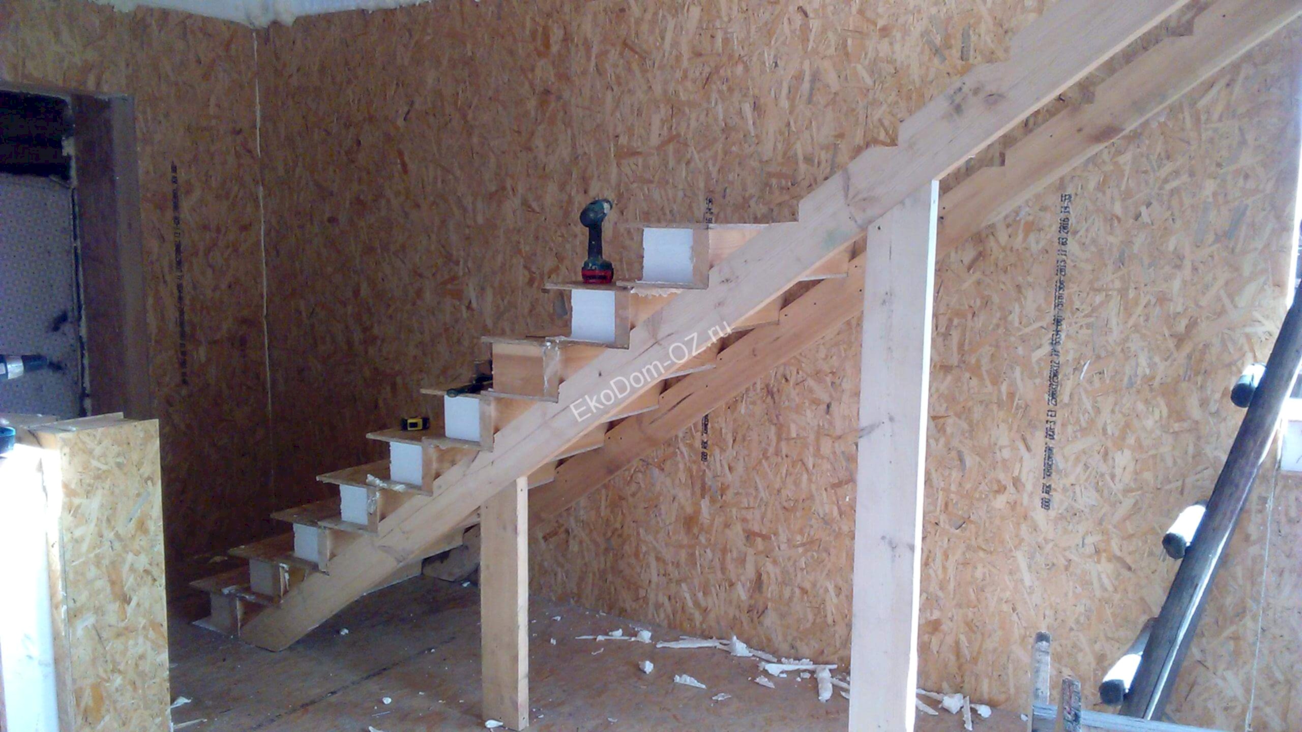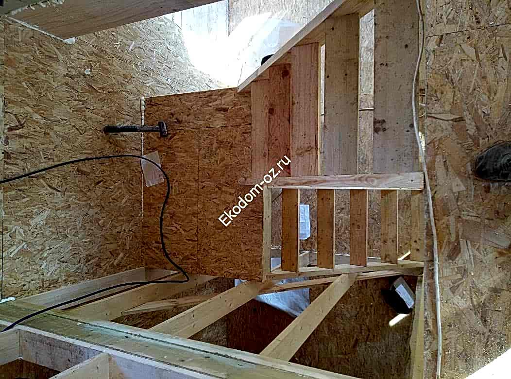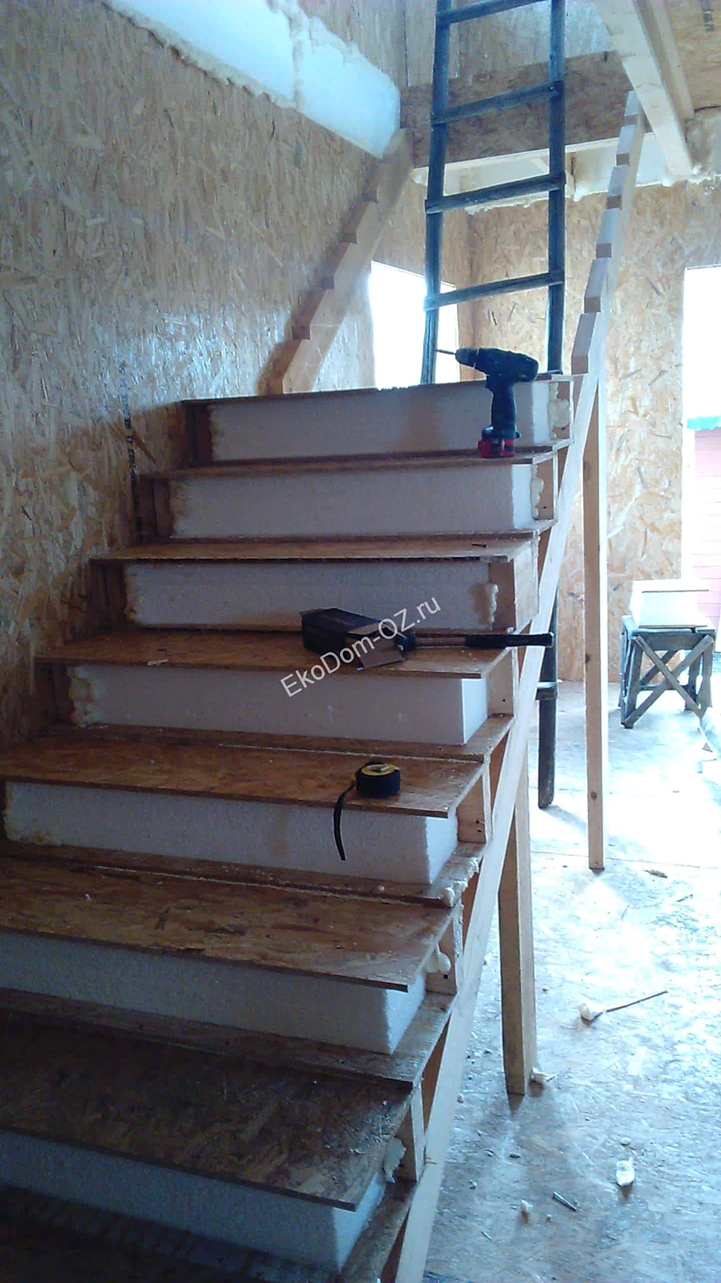 Одно из достоинств таких лестниц - это невысокая стоимость, особенно если дом построен так же из SIP панелей. В этом случае получается выстроить качественную лестницу практически из обрезков панелей, потраченных на возведение стен. Ступеньки укладываются на 2 косоура, один из которых крепится к стене, а второй опирается на вертикальные стойки. Такая лестница не скрипит, имеет почти 10 кратный запас прочности и она теплая.