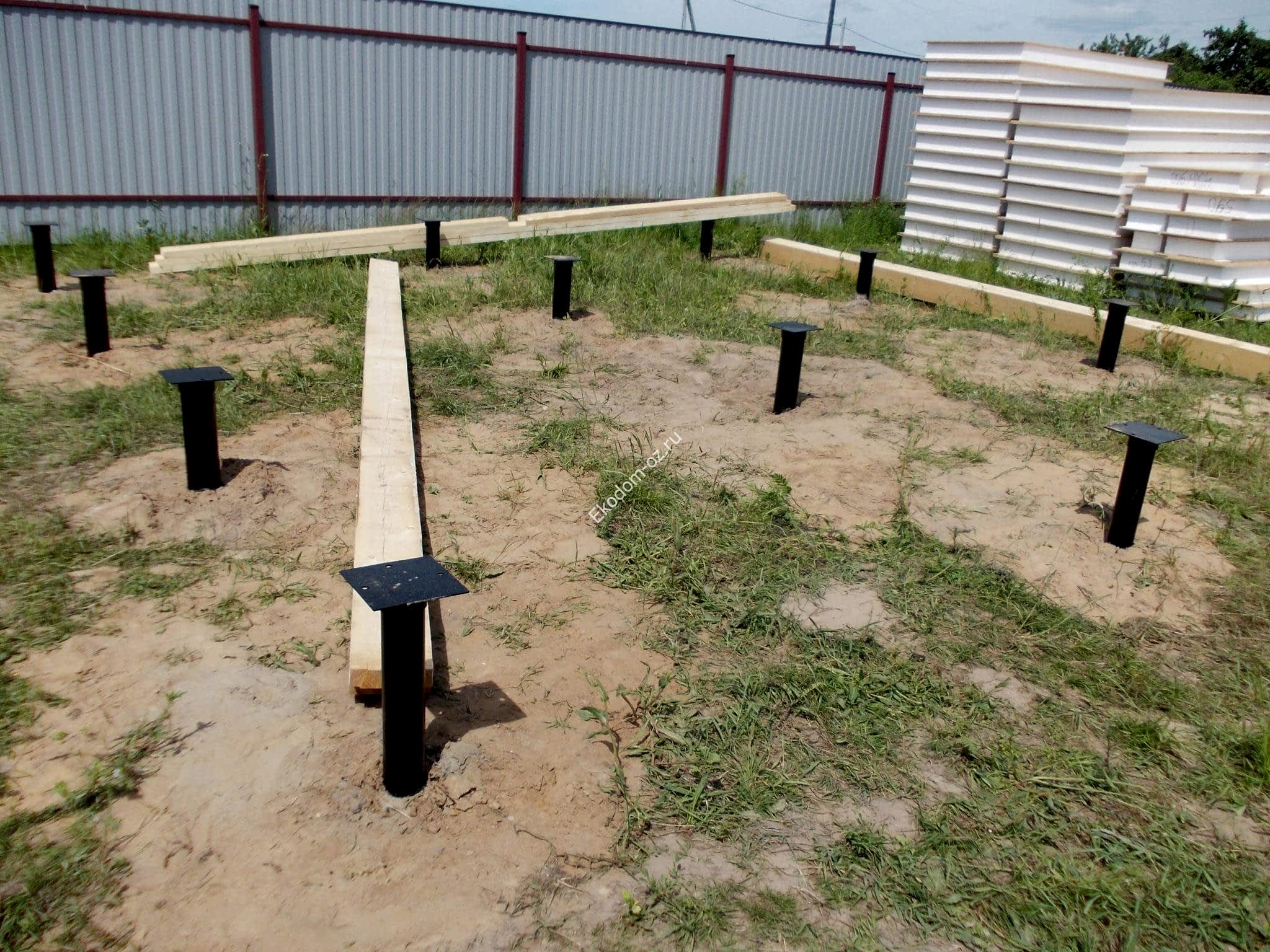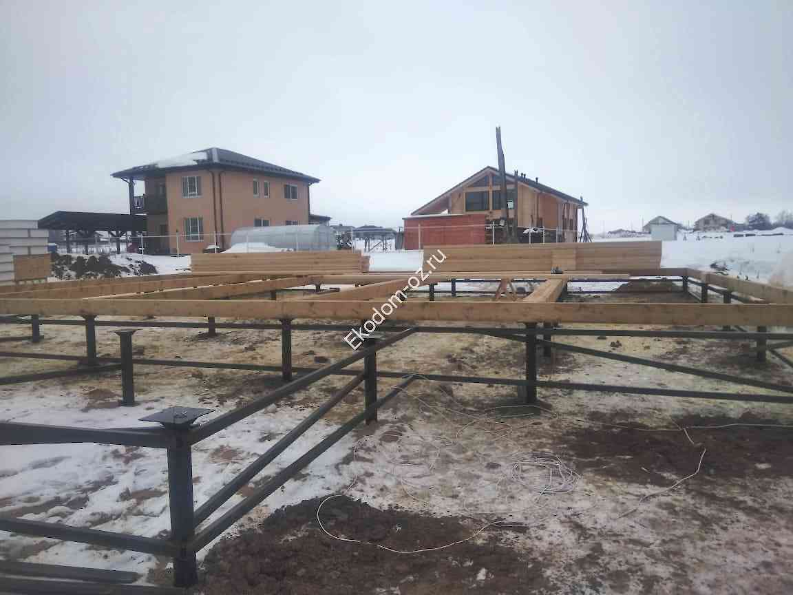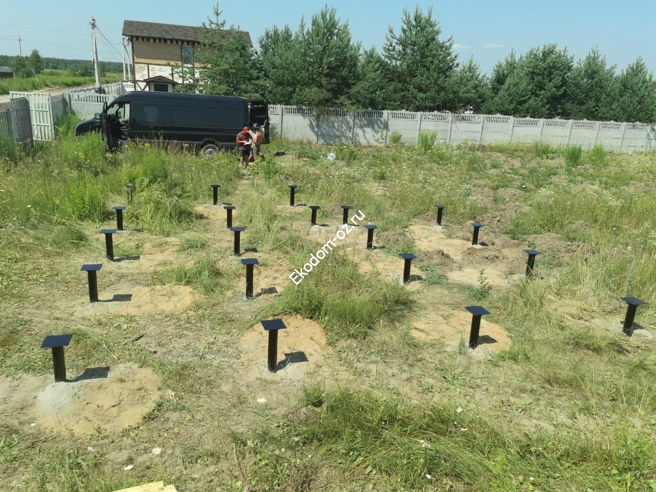 - Фундамент:Пин Ап сваи диаметр 108 мм, оголовки 200х200 мм