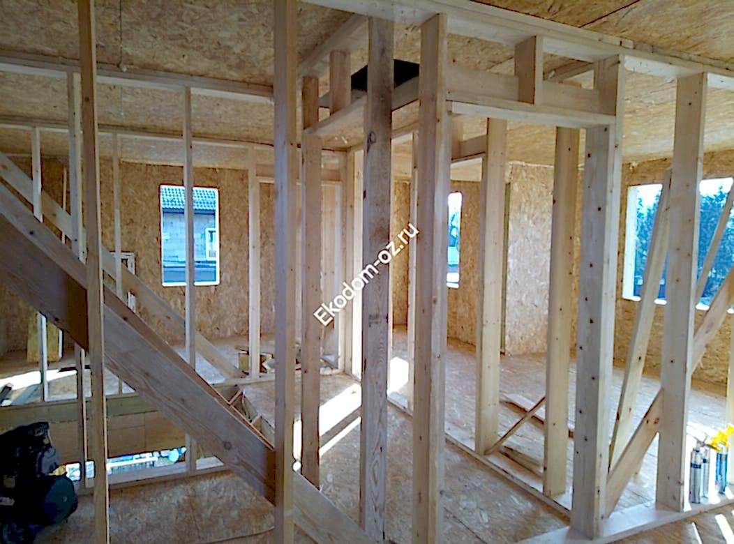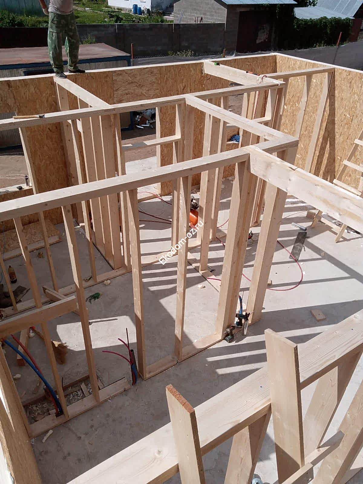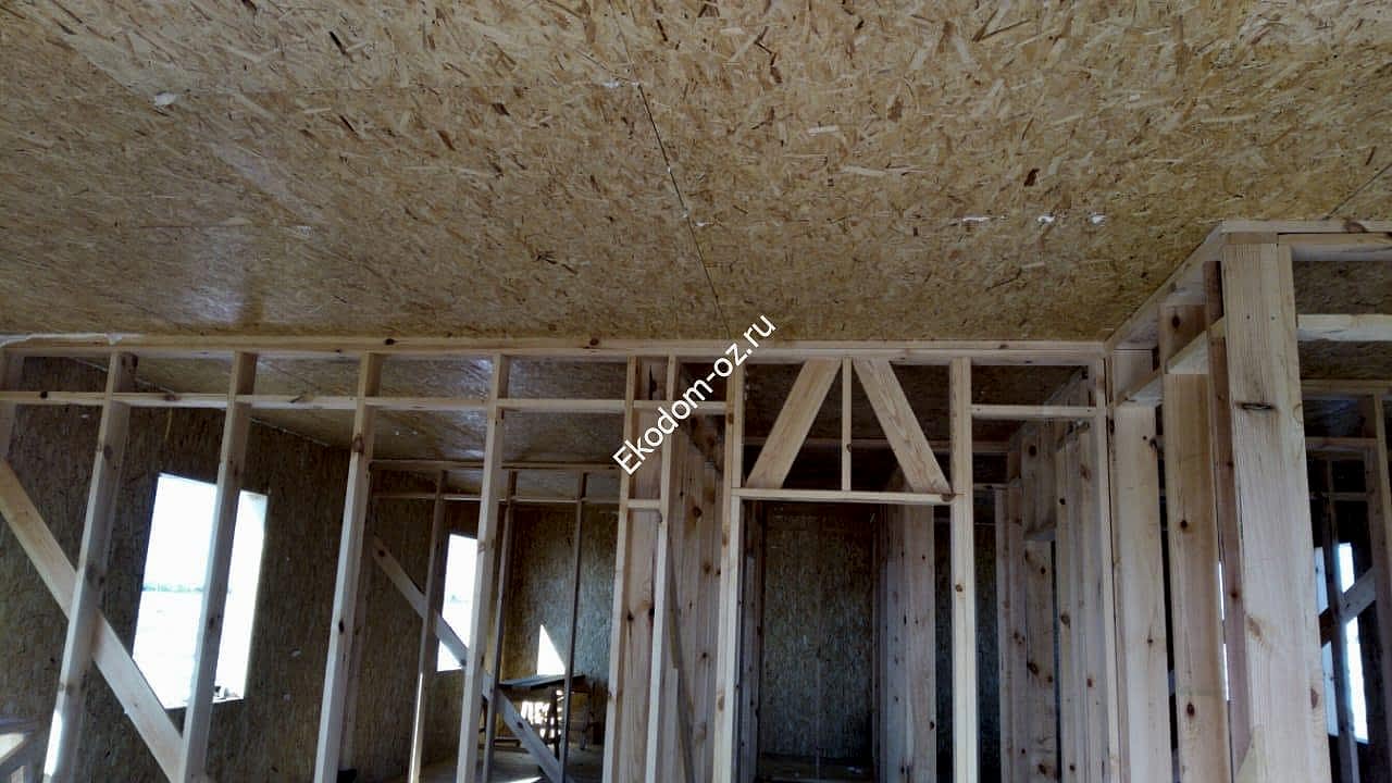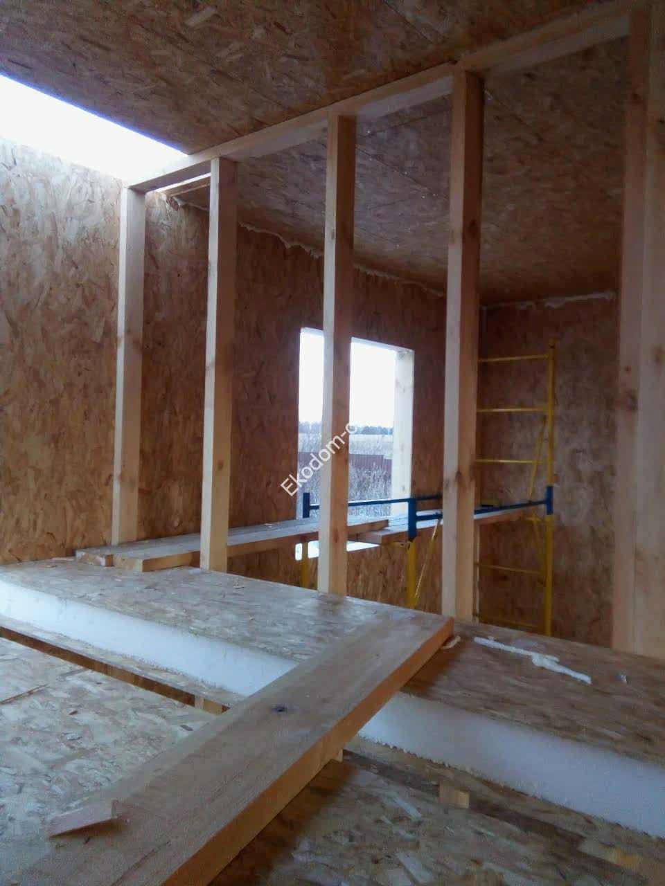 - Перегородки:нулевое перекрытие 224 мм СИП панель Green board., наружные стены СИП 174 мм, внутренне Пин Апнесущие перегородки 150х40с шагом 558 мм., межэтажное перекрытие по балкам с настилом ОСП-3 22мм и утеплением периметра Пин Ап чердачное перекрытие СИП 174 мм.