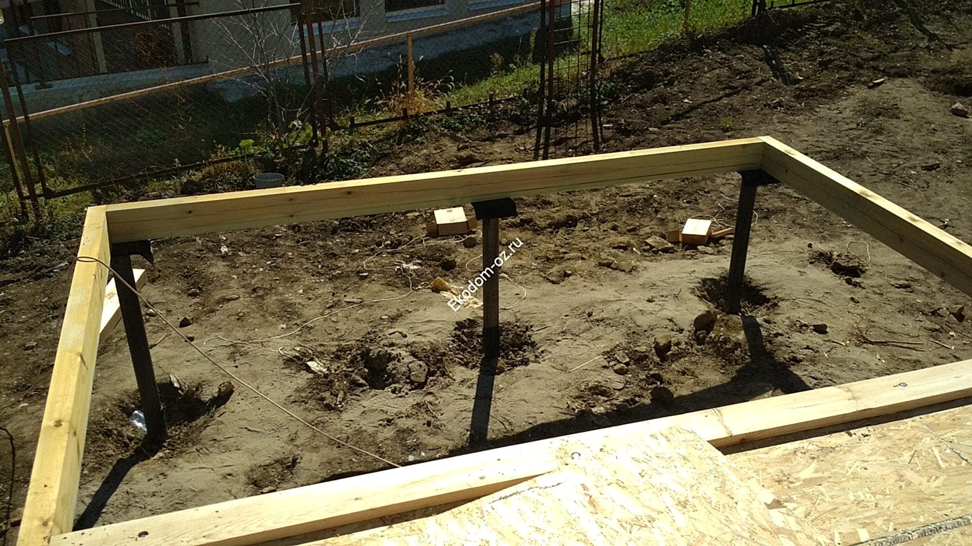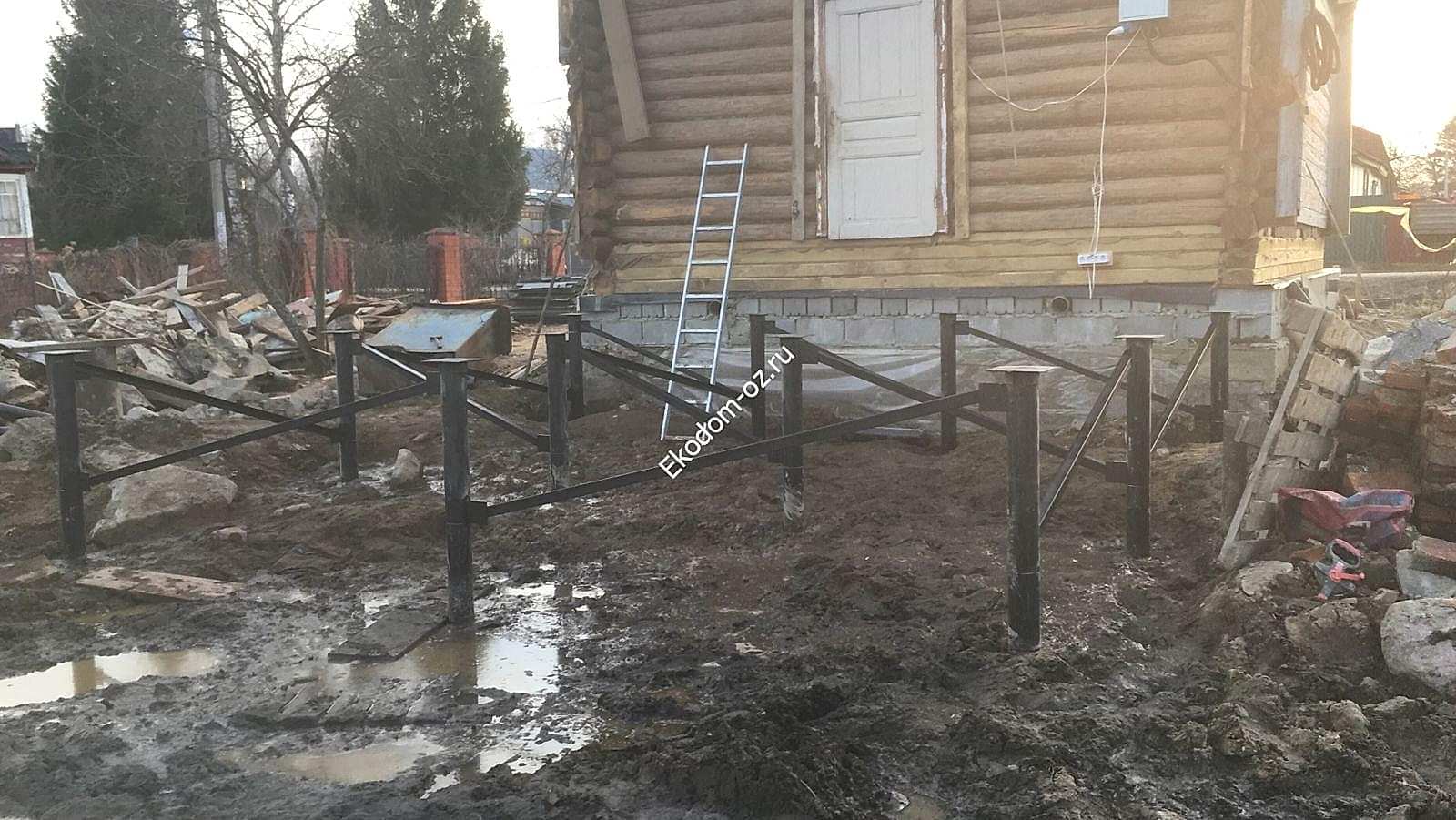 - Фундамент тамбур:Винтовые сваи (Сварной наконечник Ø 300 мм, труба Ø 108 мм, Пин Ап ствола 4 мм, длина 5000мм) оголовки 200х200 мм, цементирование ствола, обрезка в уровень, установка оголовков. Обвязка фундамента: Антисептированная строганная доска 50 х 200 мм строганный (47х197) (200х150 мм) Обварка свай уголком.