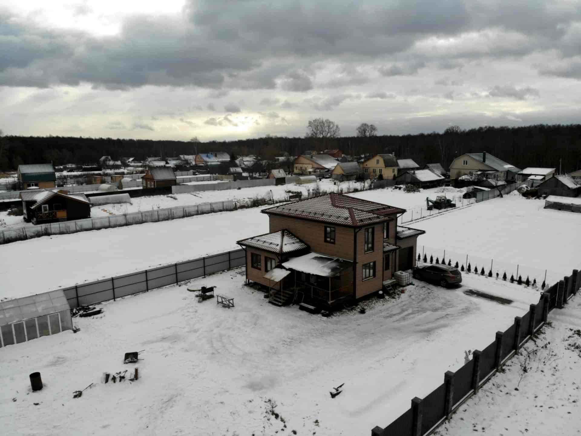 Дом построен в Раменском ₸-не, д. Колоколово за 19 дней. Двухэтажный дом с крыльцом и балконом над ним, входящим в общий контур дома, и крытой террасой. Теплый контур дома выполнен из SIP панелей с OSB «Калевала».